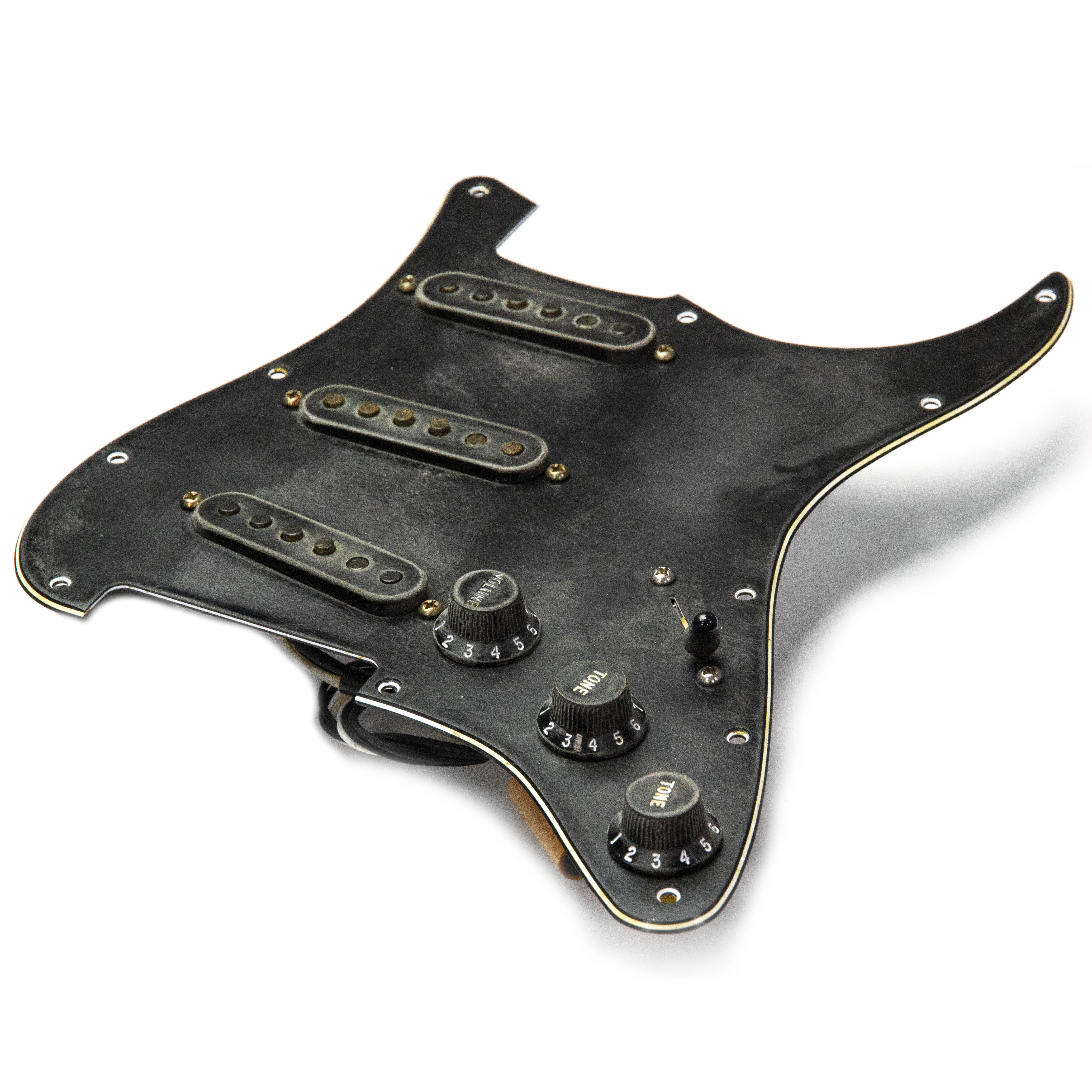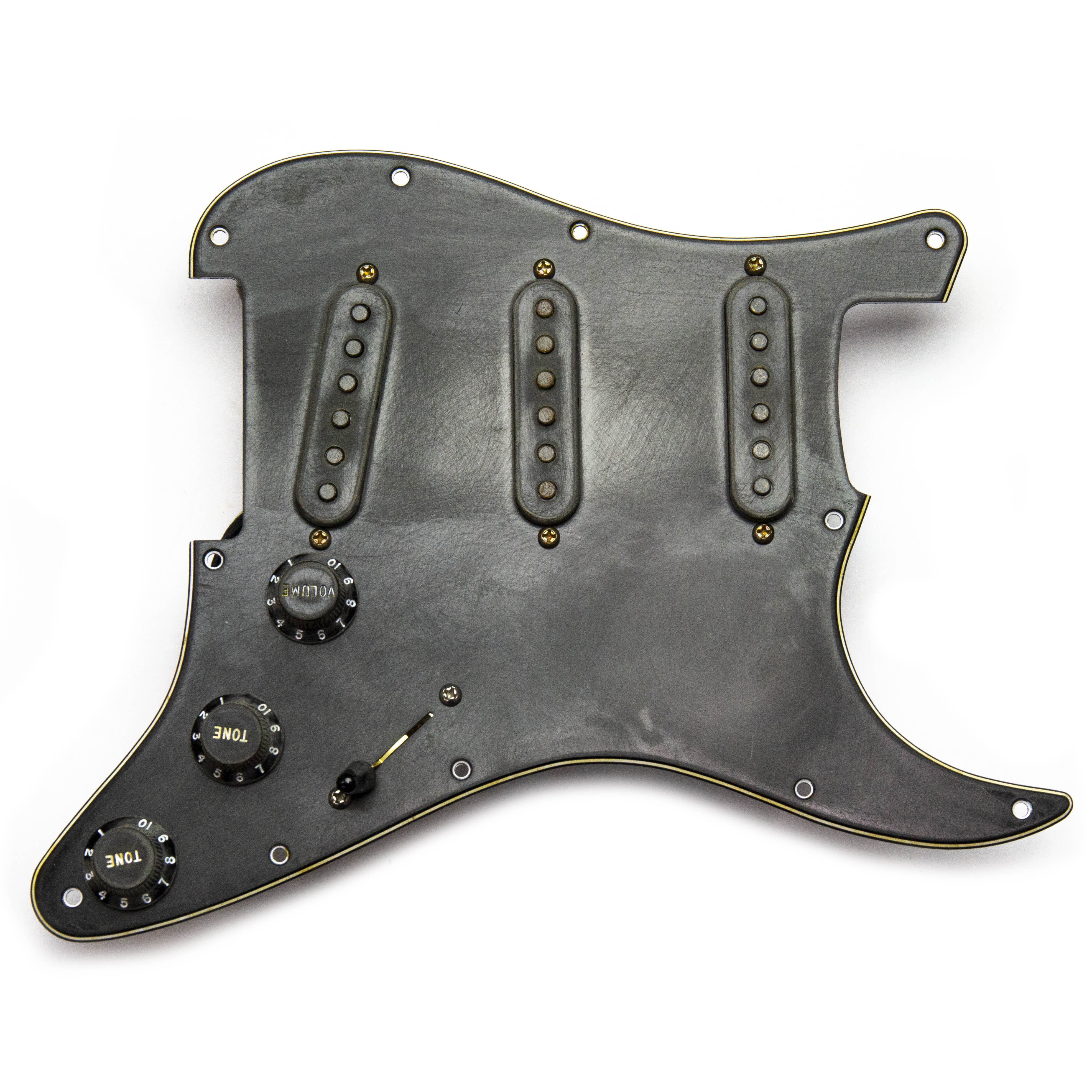 Custom pre-wired Strat pickguard in heavy aged black, fitted with a matching calibrated set of '63 Veneer Board Singlecoil pickups, fitted with our zinc plated steel baseplates in all 3 positions