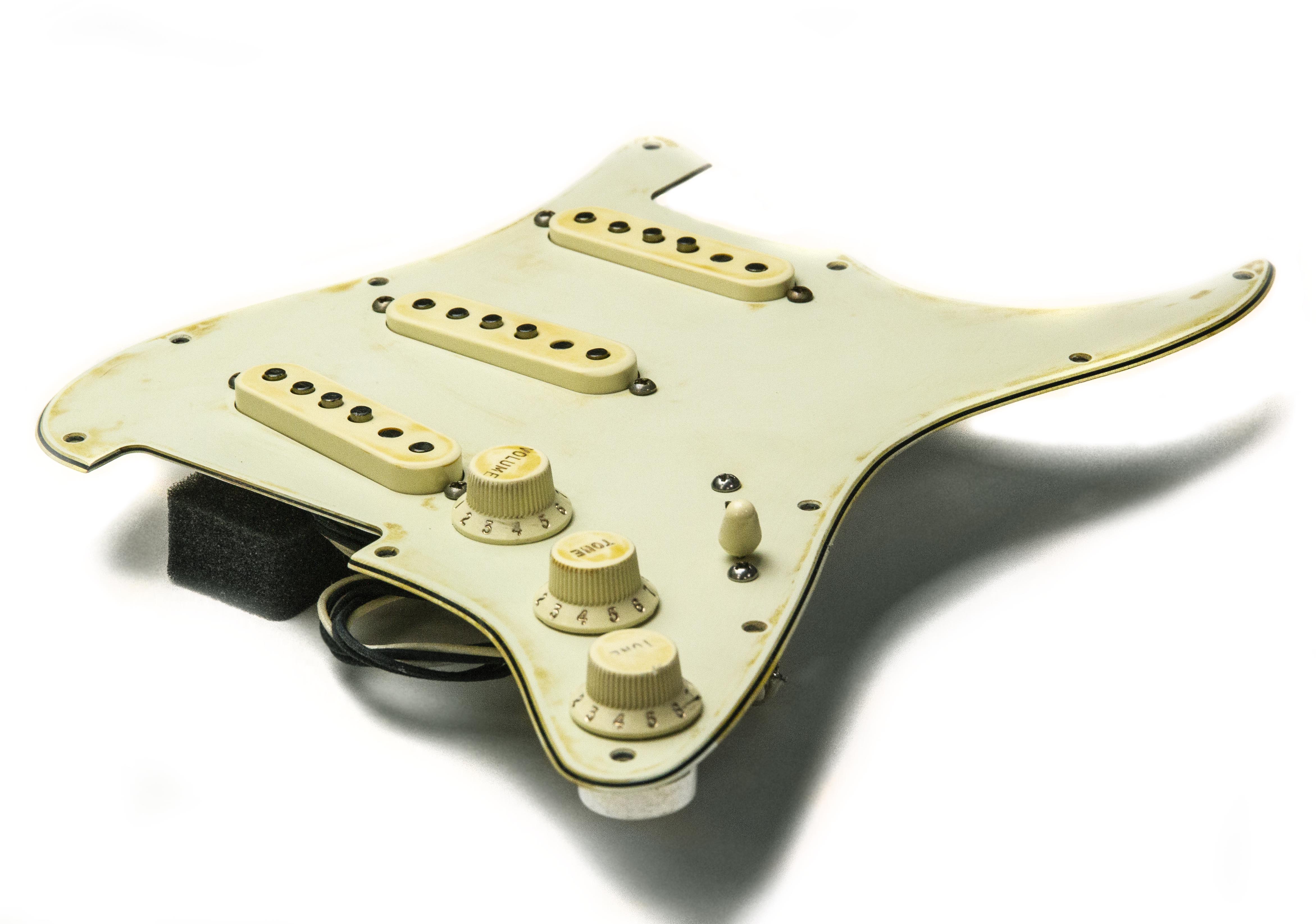 Custom pre-wired Strat pickguard in aged light mint green with aged cream knobs, fitted with a calibrated set of '63 Veneer Board Singlecoil pickups in aged cream, with a zinc plated steel baseplate fitted in the bridge position