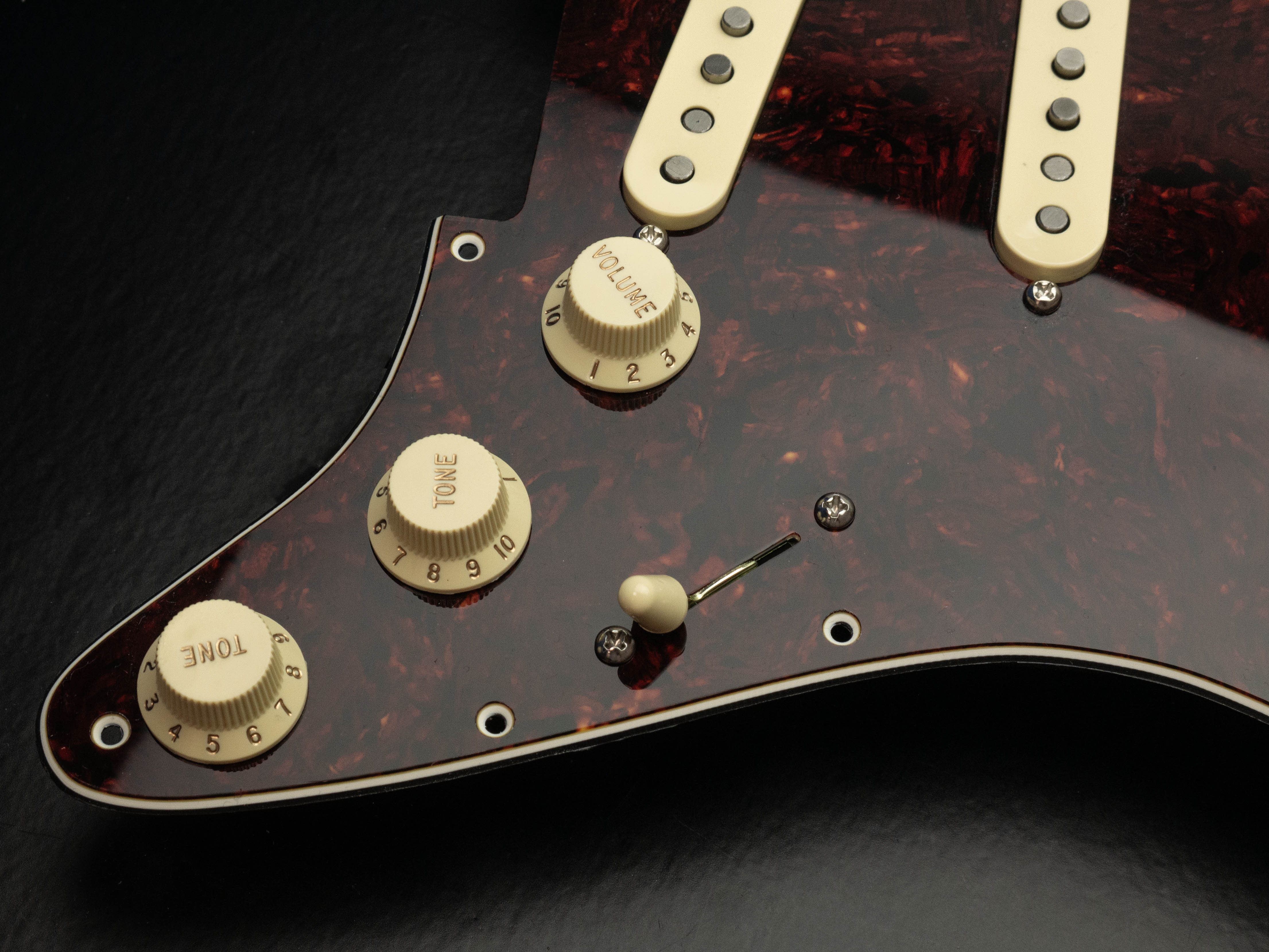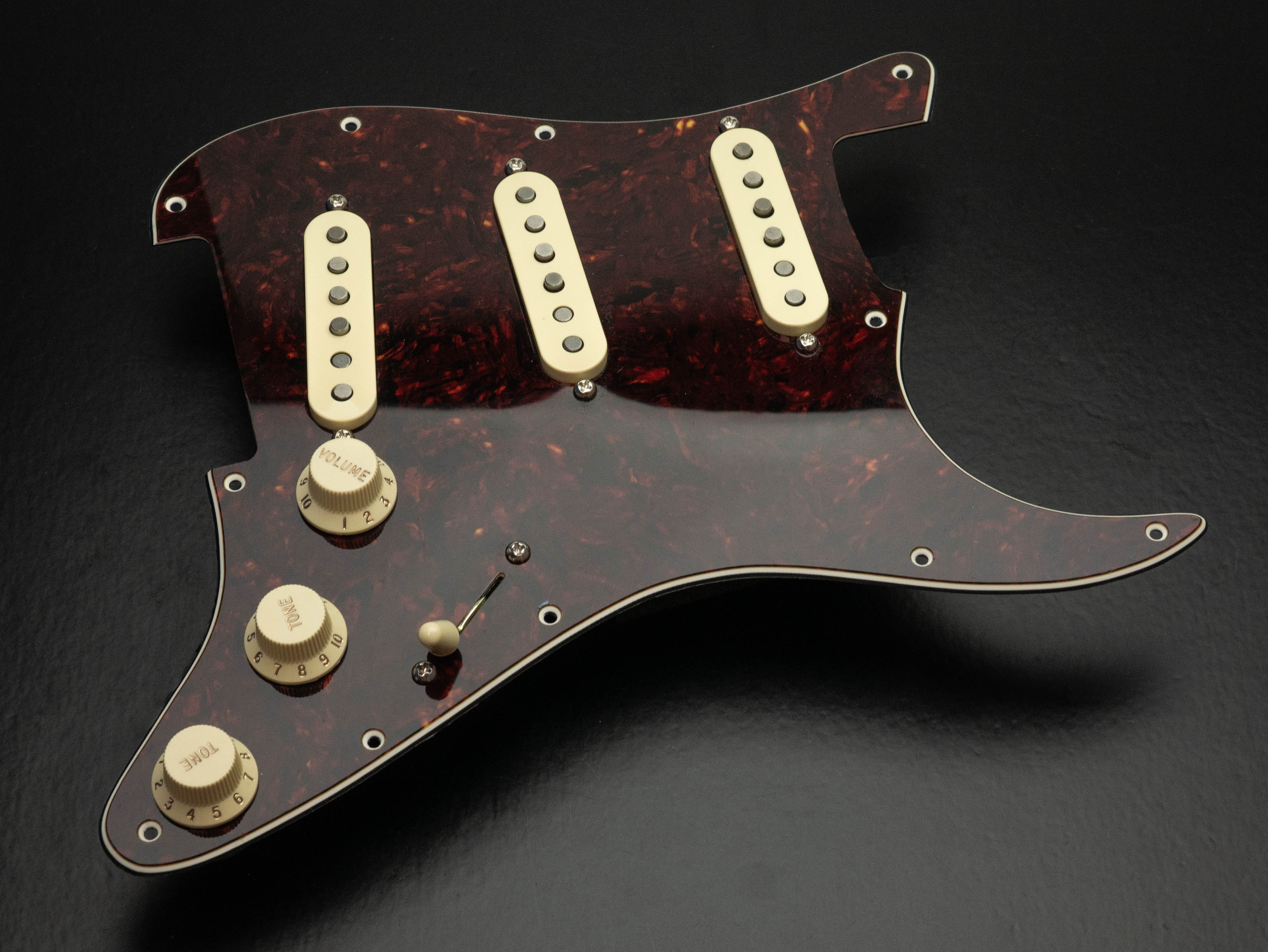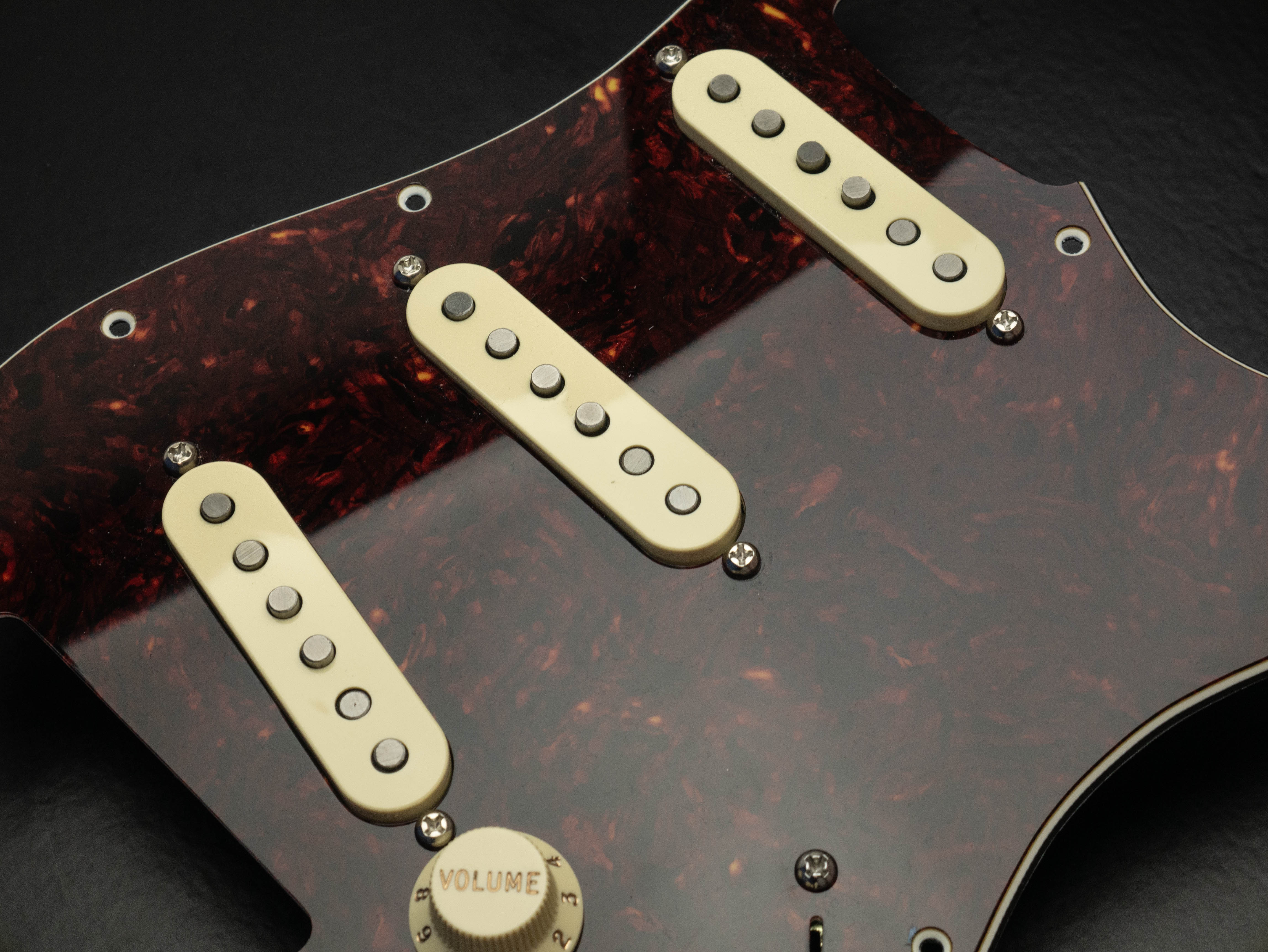 Custom pre-wired 11 hole Strat pickguard in vintage red tortoise shell, fitted with a calibrated set of '63 Veneer Board Singlecoil pickups in a cream finish with an RWRP middle coil and vintage stagger magnet profile.