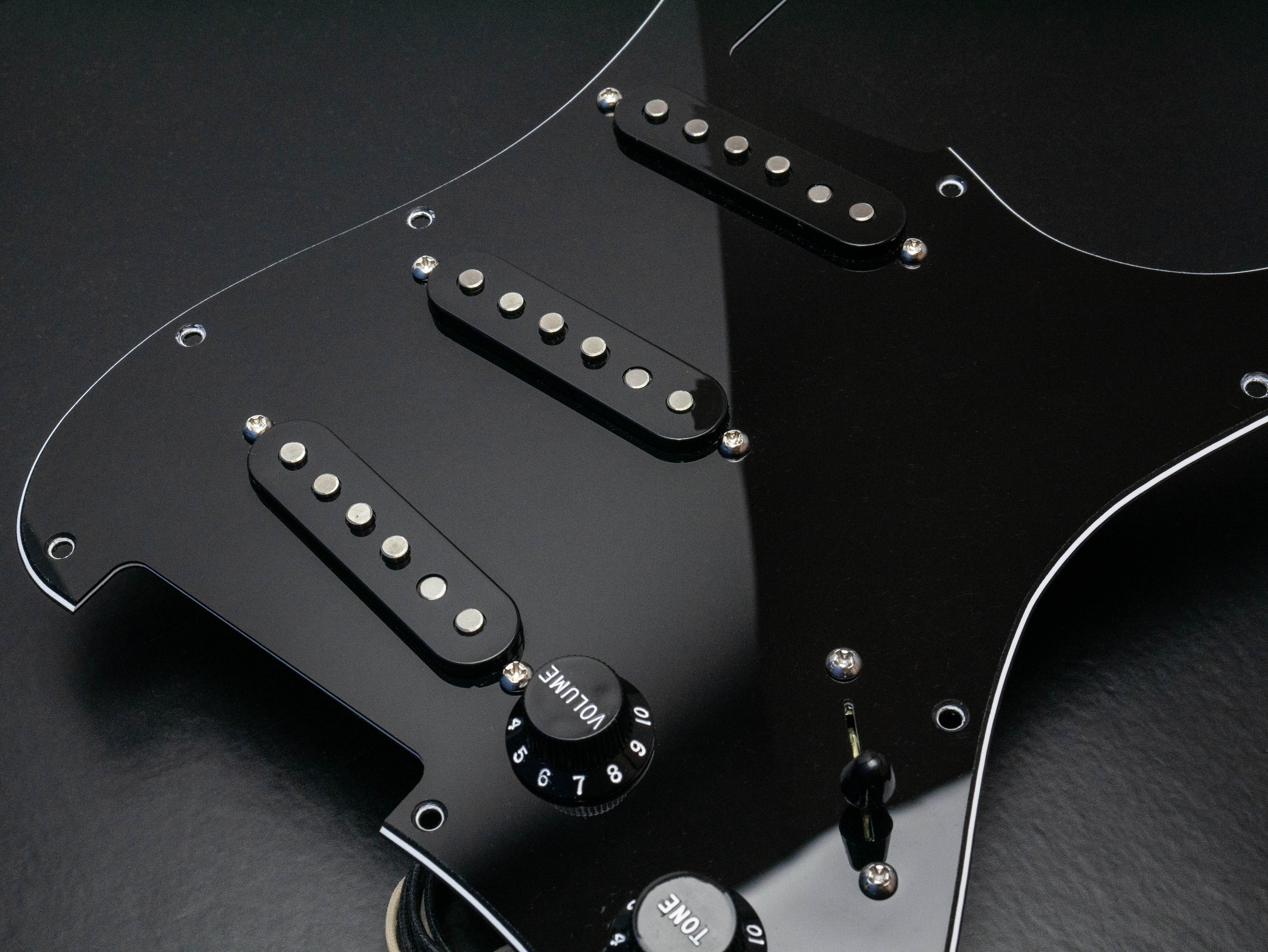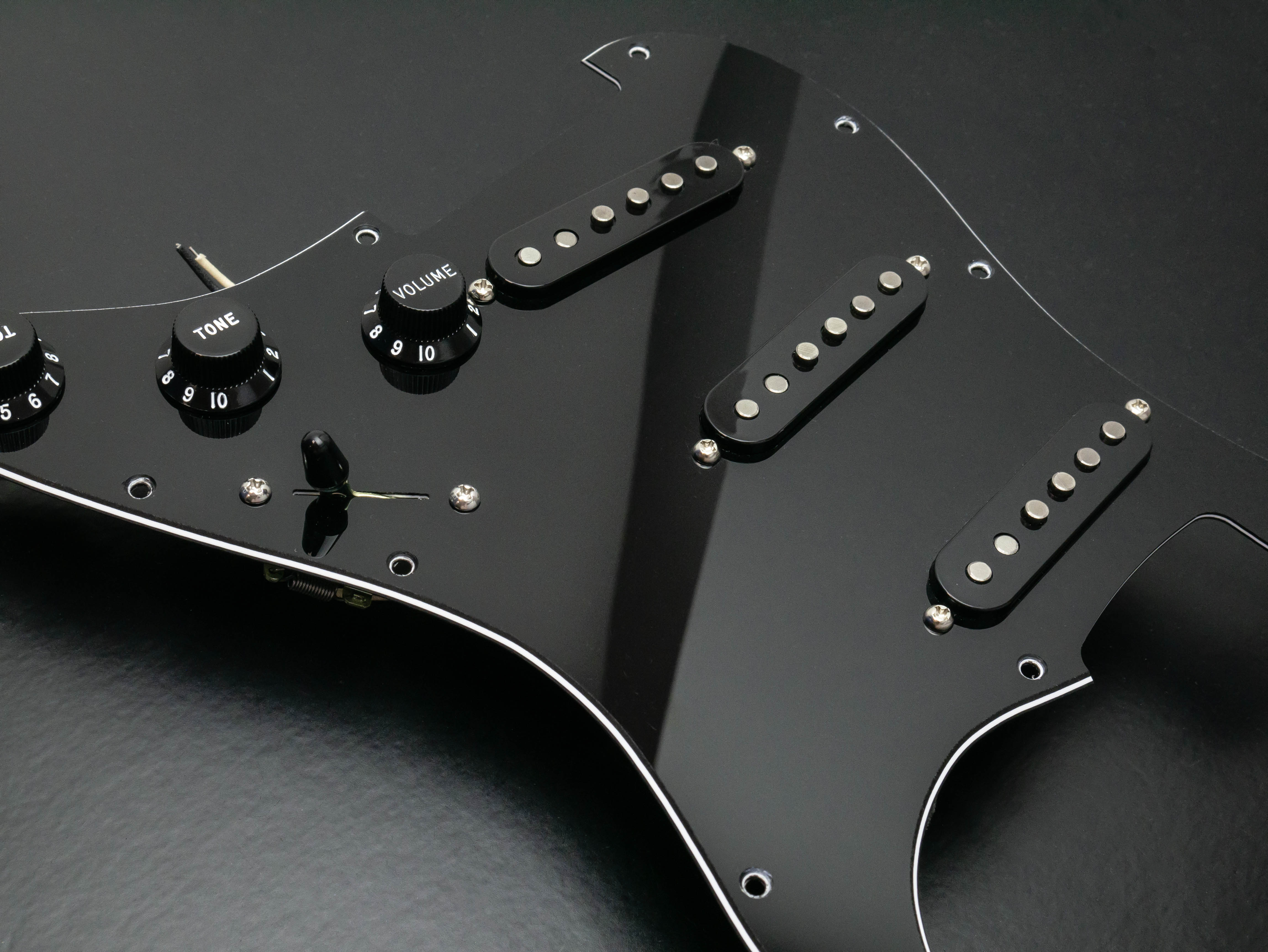 Custom pre-wired 11 hole Strat pickguard in black, fitted with a calibrated set of Apache Singlecoil pickups in a black finish with vintage stagger magnet profile.