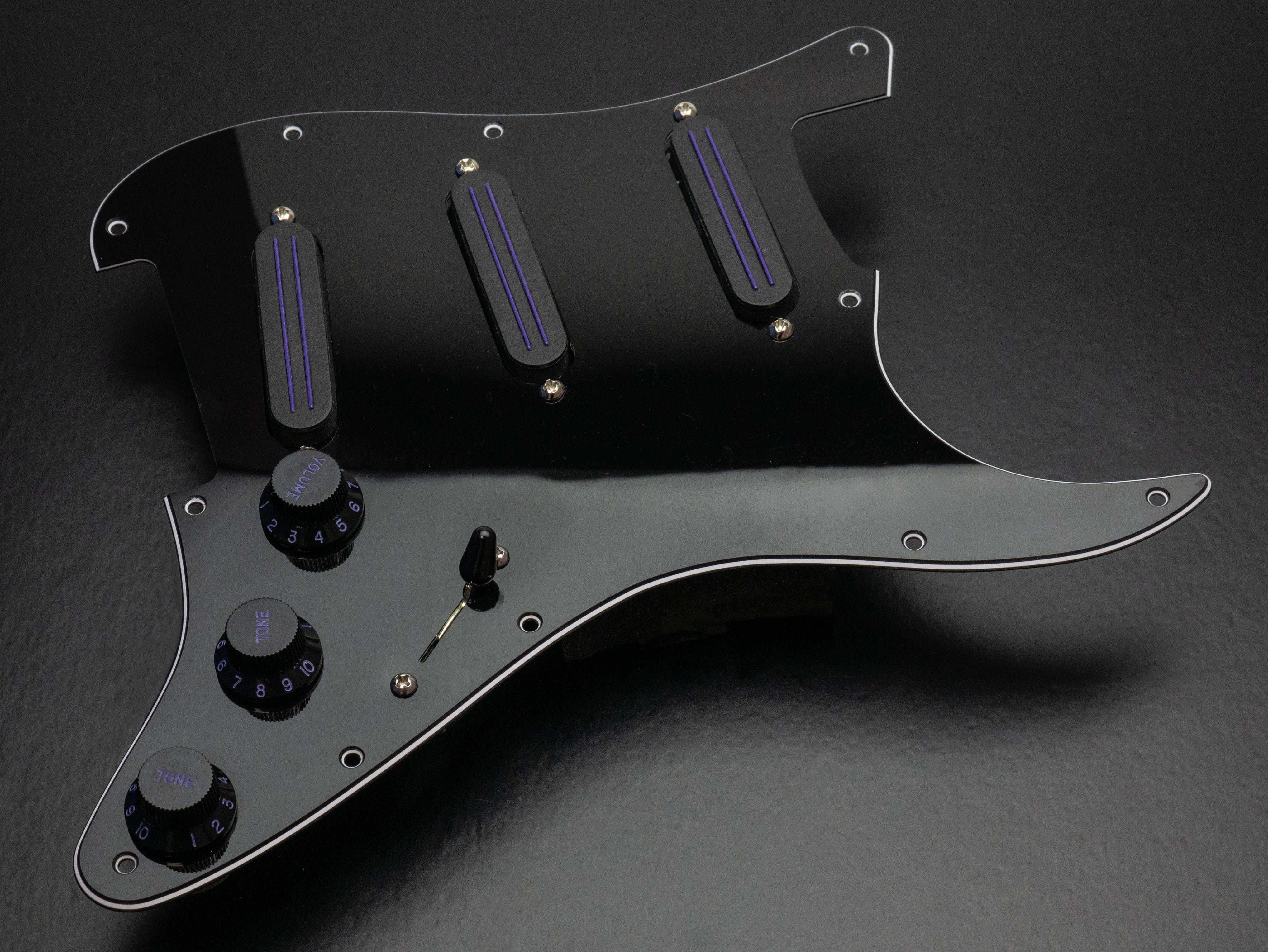 Custom pre-wired Strat pickguard in black, fitted with a calibrated set of Cobra Singlecoil pickups in black with purple blades