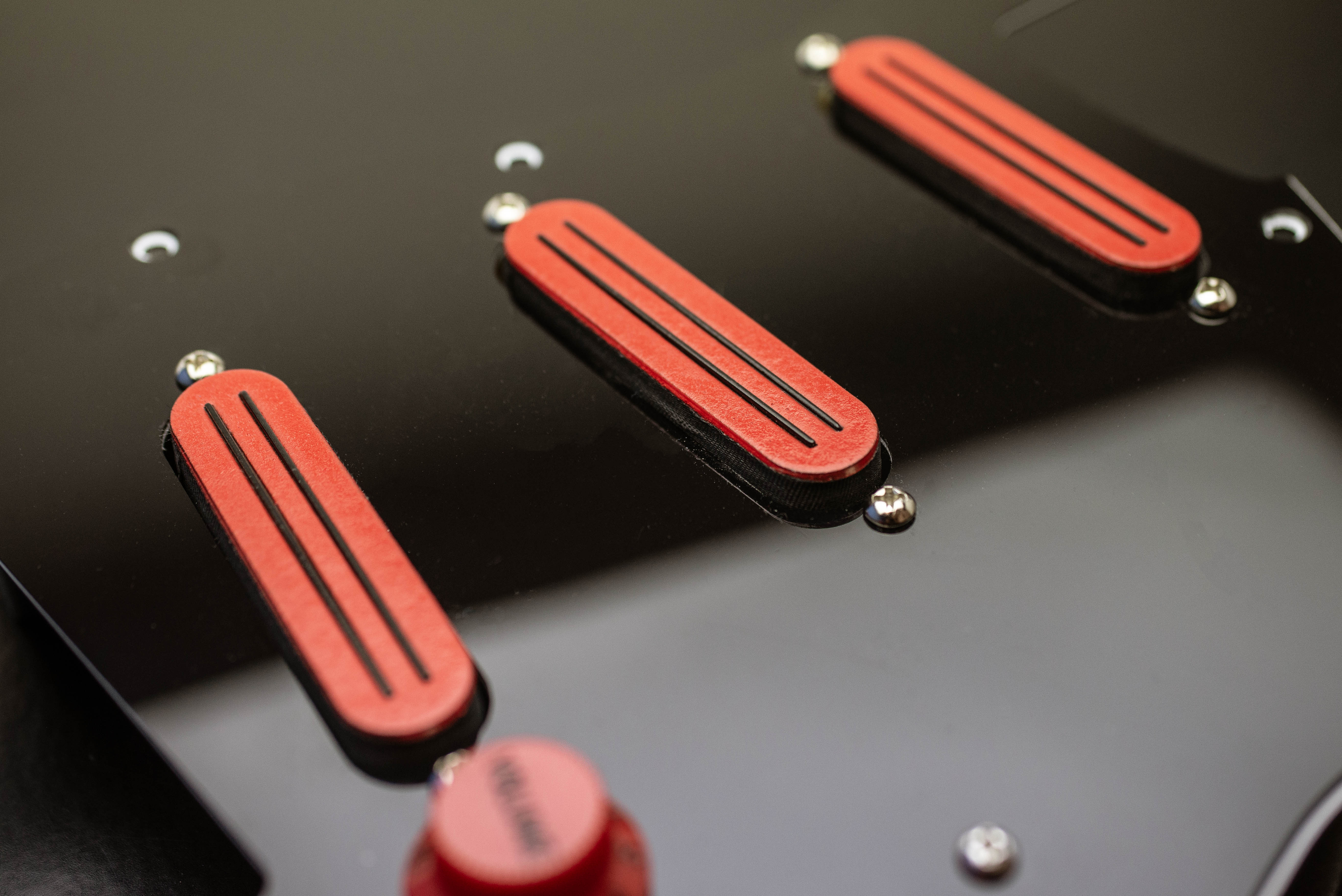 Custom pre-wired Strat pickguard in black, fitted with a calibrated set of Cobra Singlecoil pickups in a custom red finish with black blades