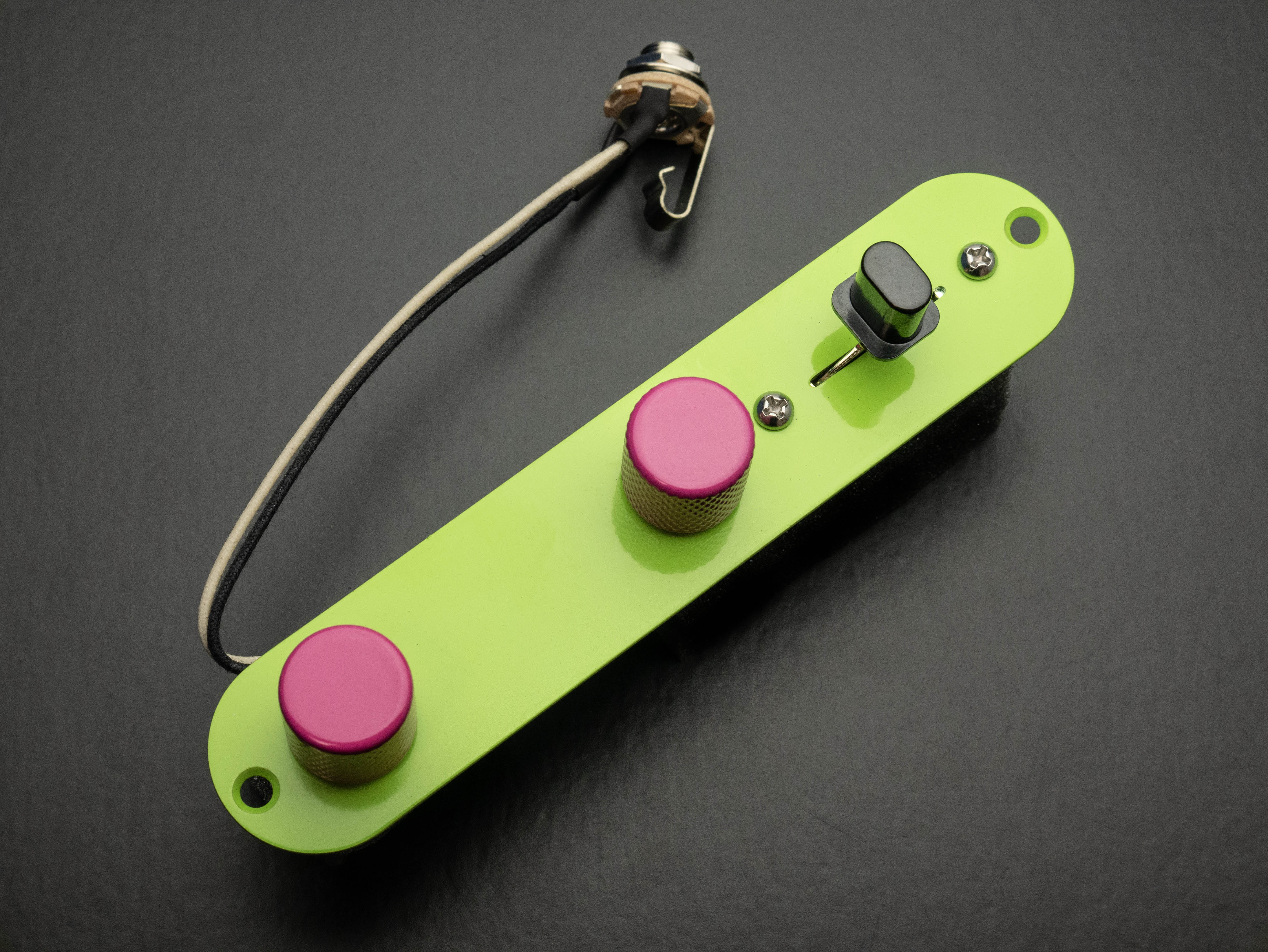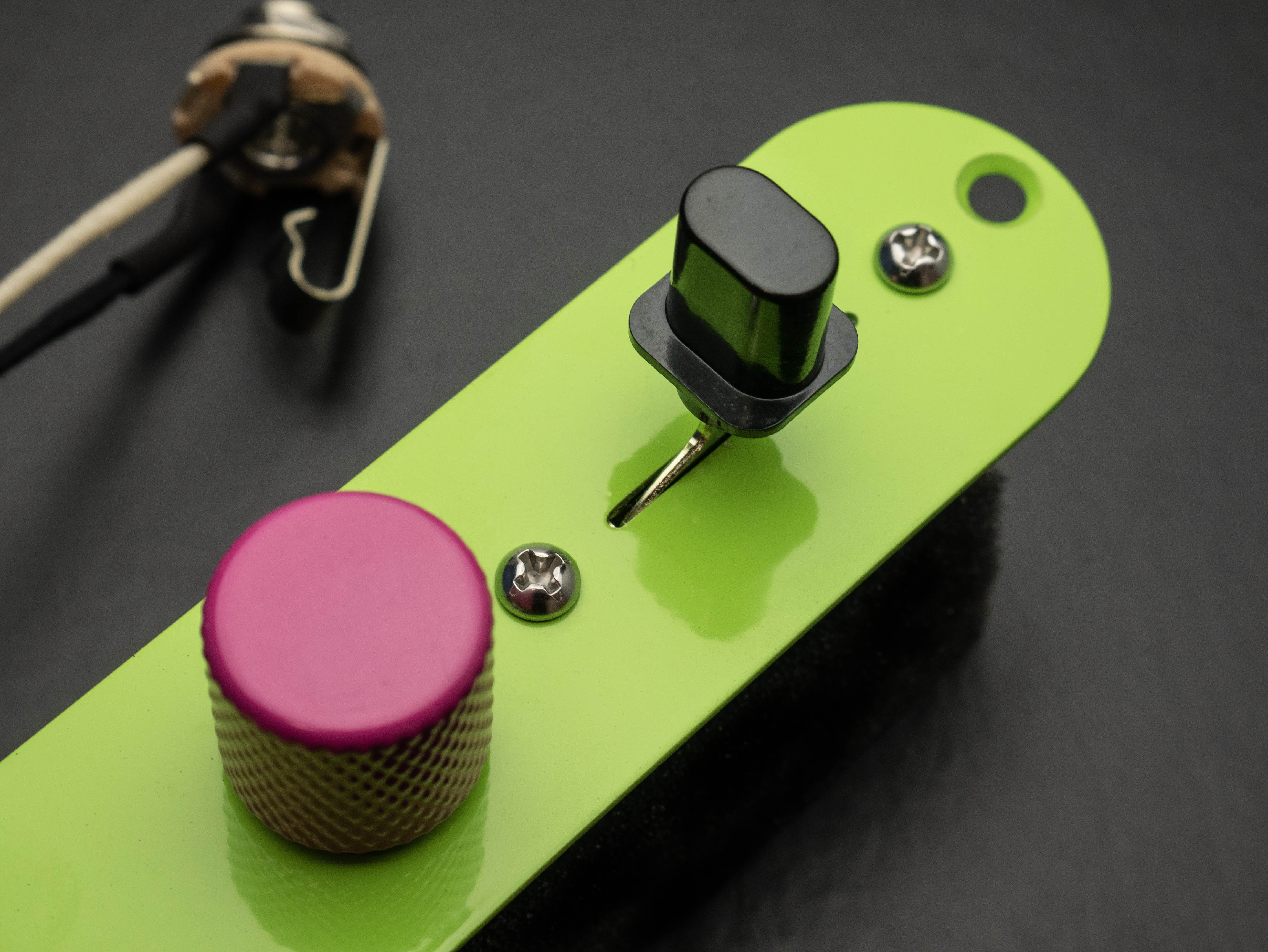 Fresh from the Bare Knuckle Custom Shop, we have a custom powder-coated Telecaster control plate in lime finish with pink knobs, built up with our most premium components and all handwired in our UK workshop.
