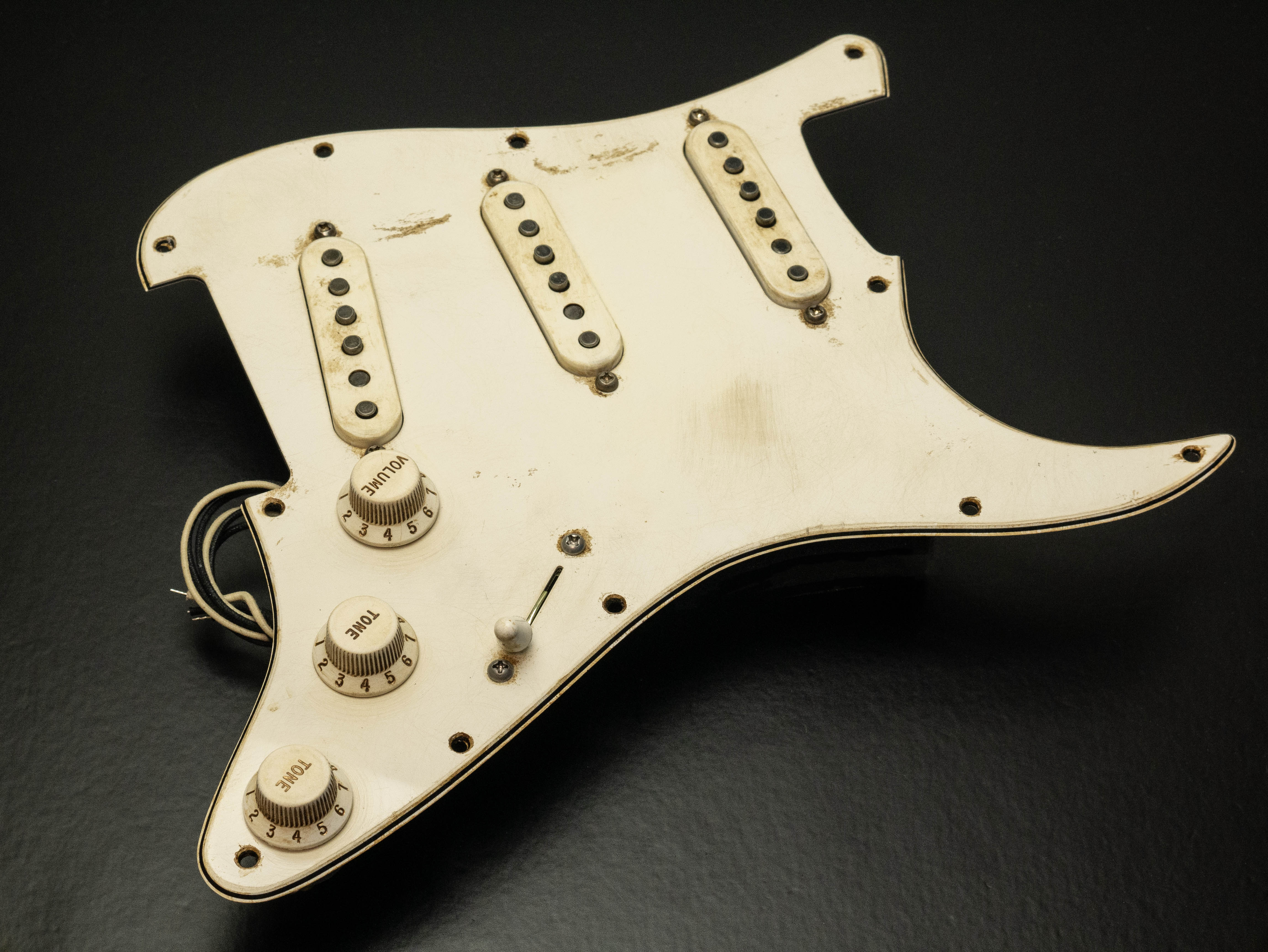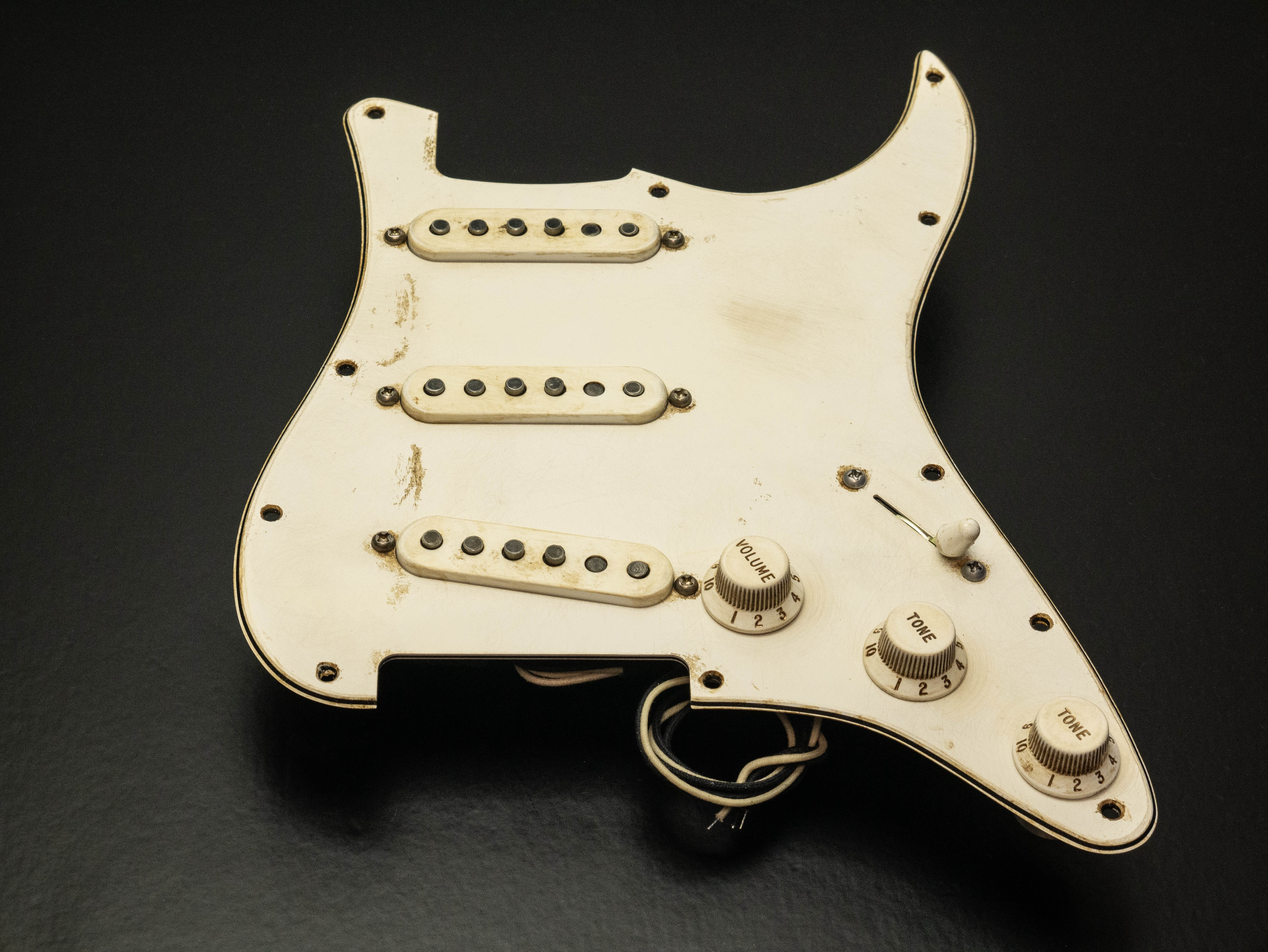 Custom pre-wired 11 hole Strat pickguard in aged parchment, fitted with a calibrated set of Irish Tour Singlecoil pickups in an aged parchment finish with a zinc plated steel baseplate on the bridge pickup, RWRP middle coil and flat magnet profile.