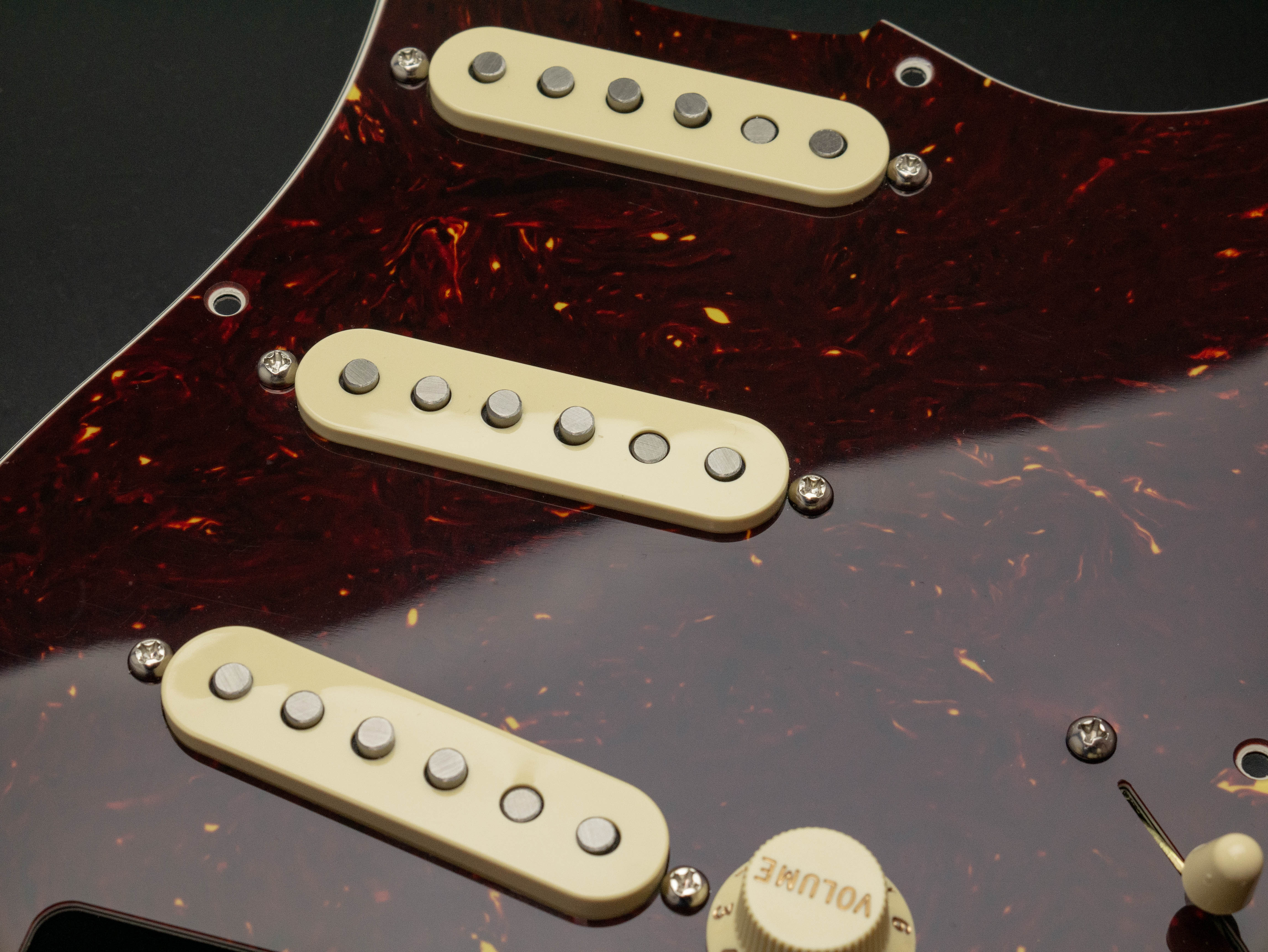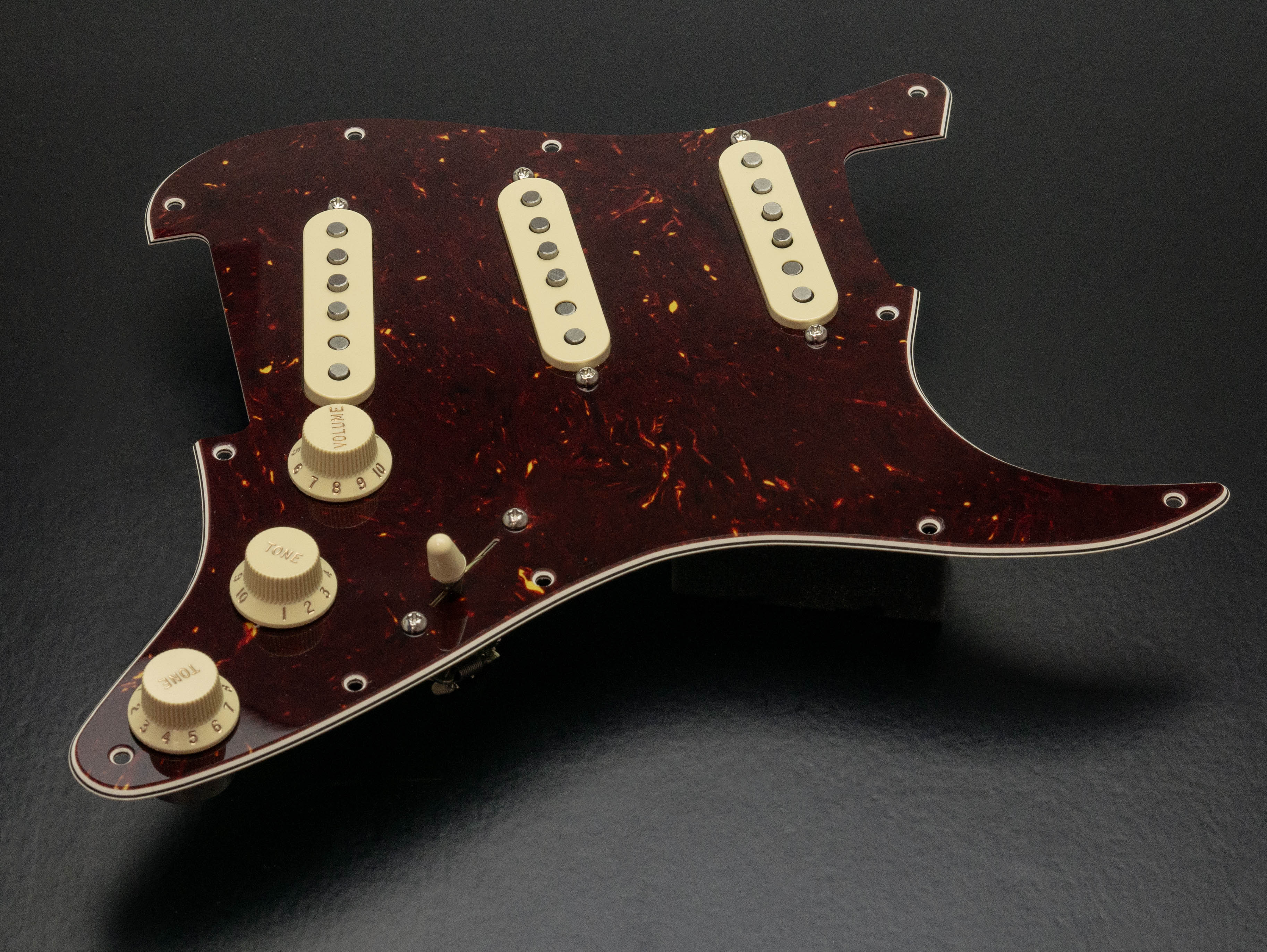 Custom pre-wired 11 hole Strat pickguard in tortoiseshell, fitted with a calibrated set of Irish Tour Singlecoil pickups in a cream finish with a zinc plated steel baseplate on the bridge pickup, RWRP middle coil and vintage stagger magnet profile.