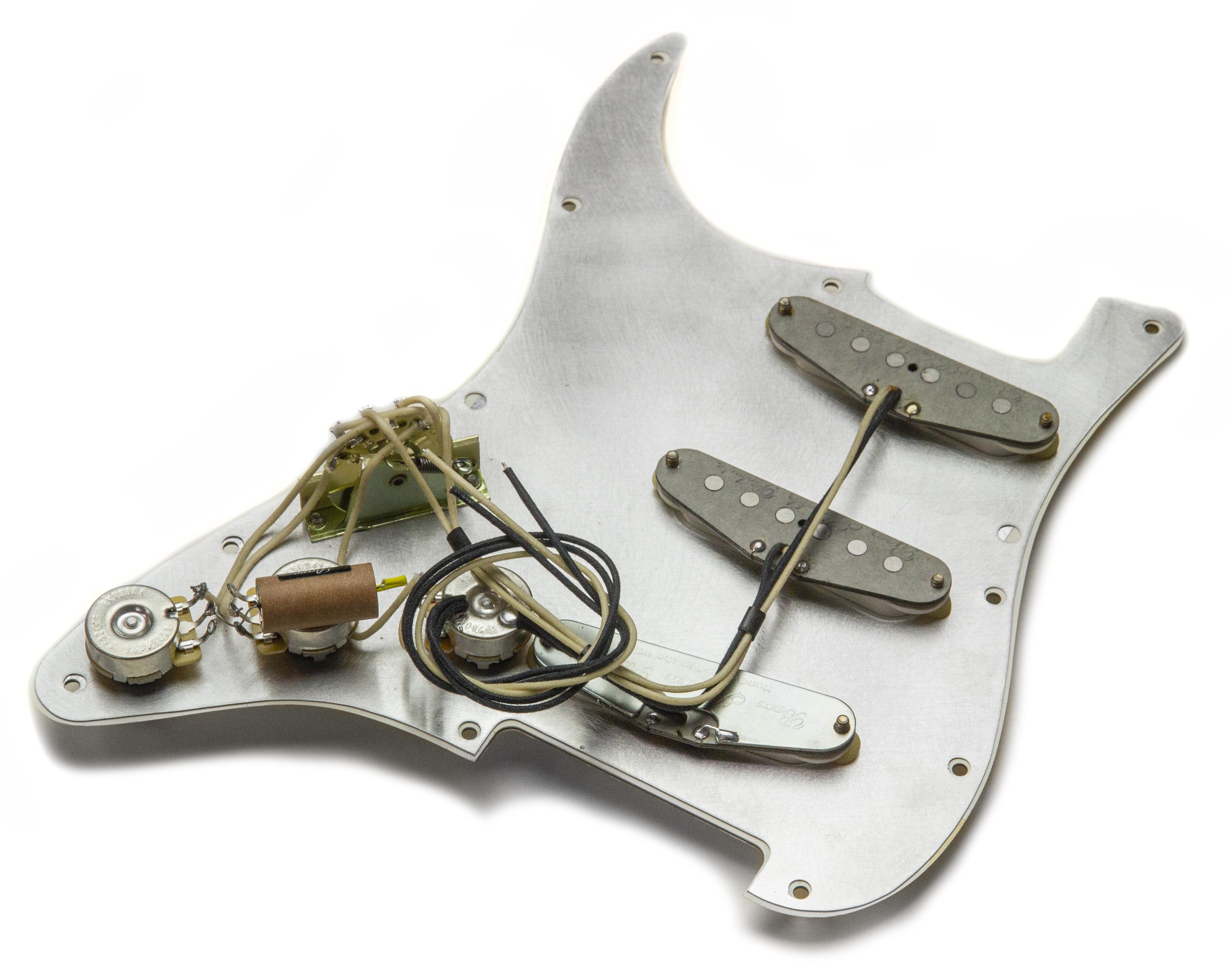 As with all of our pre-wired guards, this one and is handwired at our UK workshop, loaded with our custom spec BKP / CTS volume and tone pots and this particular guard also features one of the very last remaining examples of our BKP / Jensen paper in oil tone capacitor.