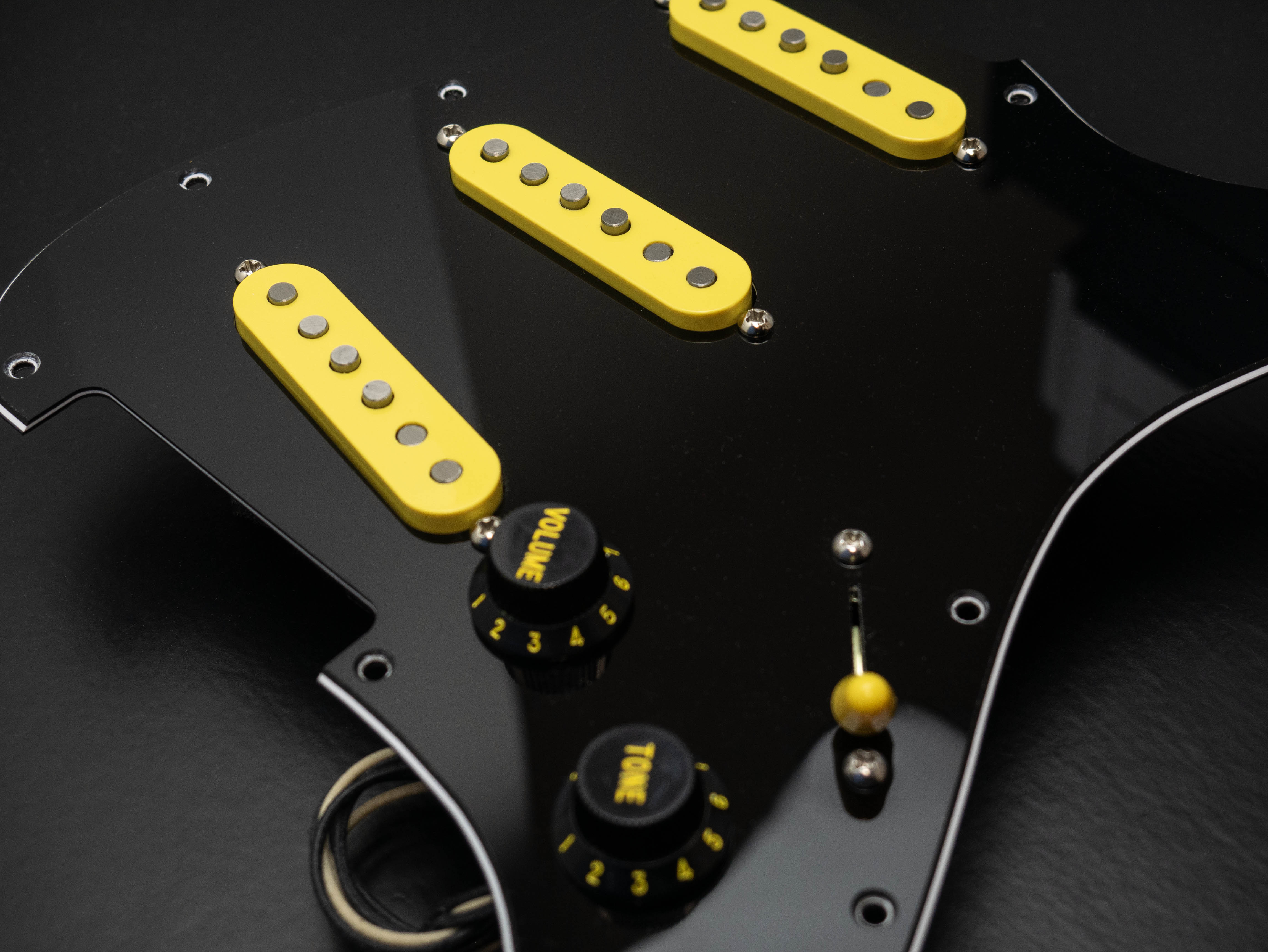 Custom pre-wired 11 hole Strat pickguard in black, fitted with a calibrated set of Mother's Milk Singlecoil pickups in yellow, with RWRP middle coil and vintage stagger magnet profile.