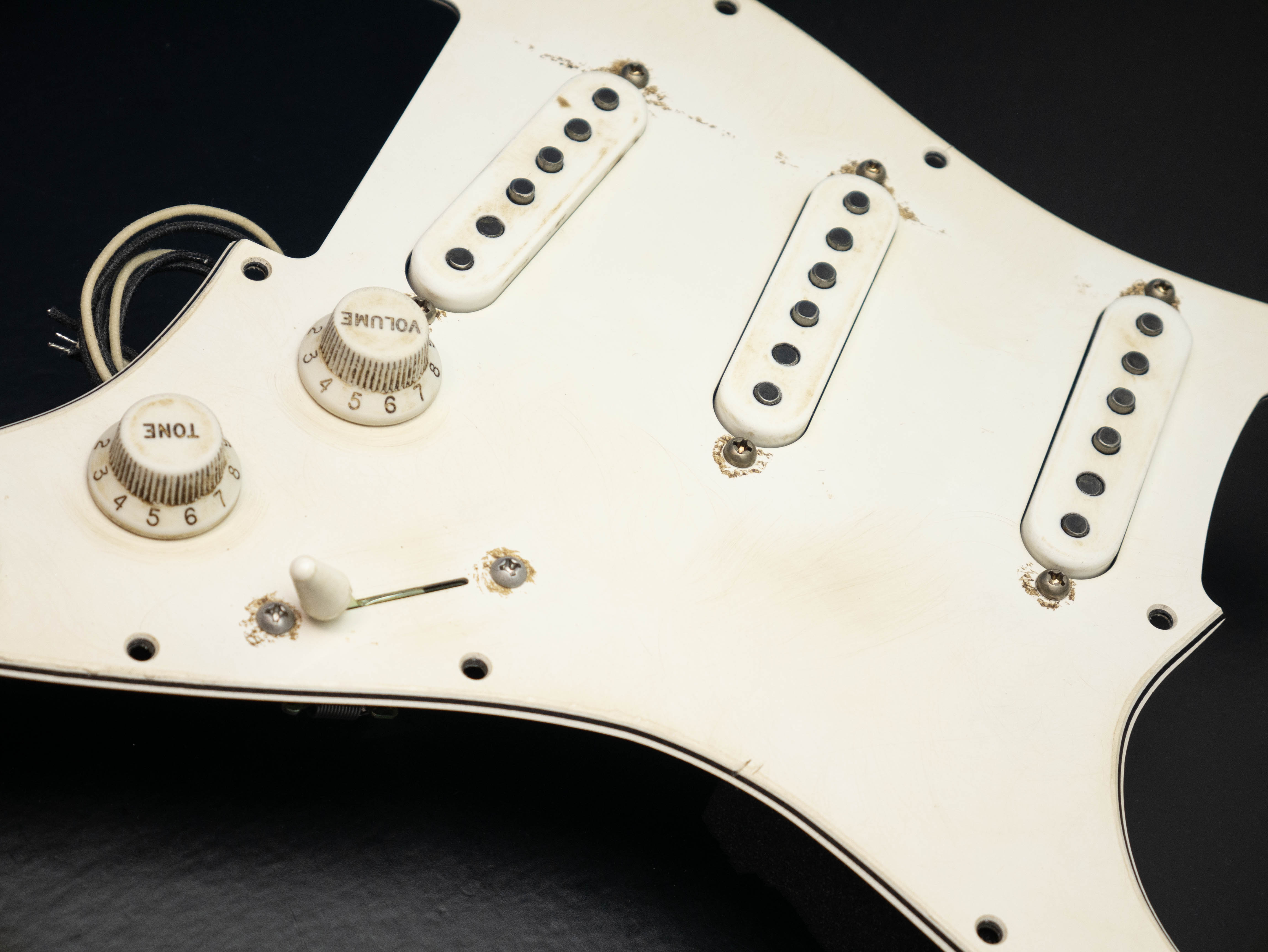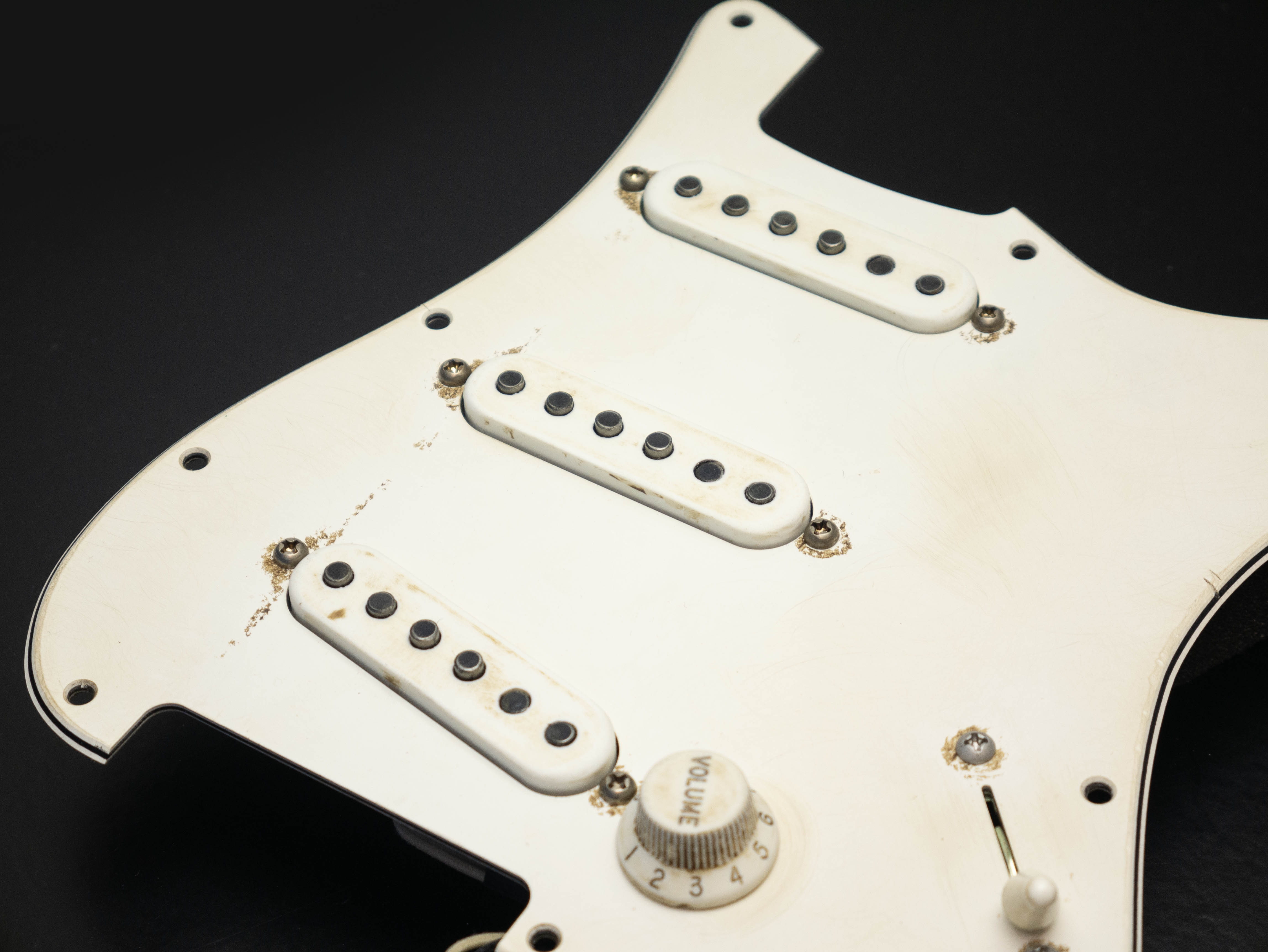 Custom pre-wired 11 hole Strat pickguard in aged parchment, fitted with a calibrated set of '63 Veneer Board Singlecoil pickups in an aged parchment finish with a zinc plated steel baseplate on the bridge pickup, RWRP middle coil and vintage stagger magnet profile.