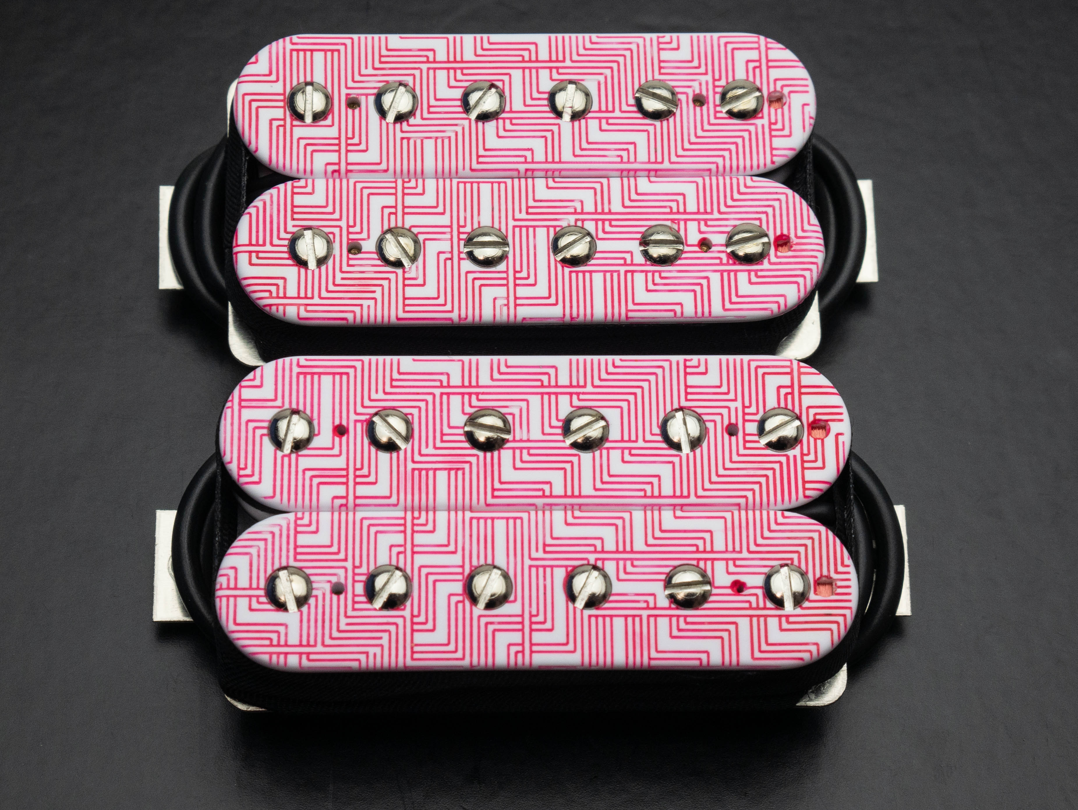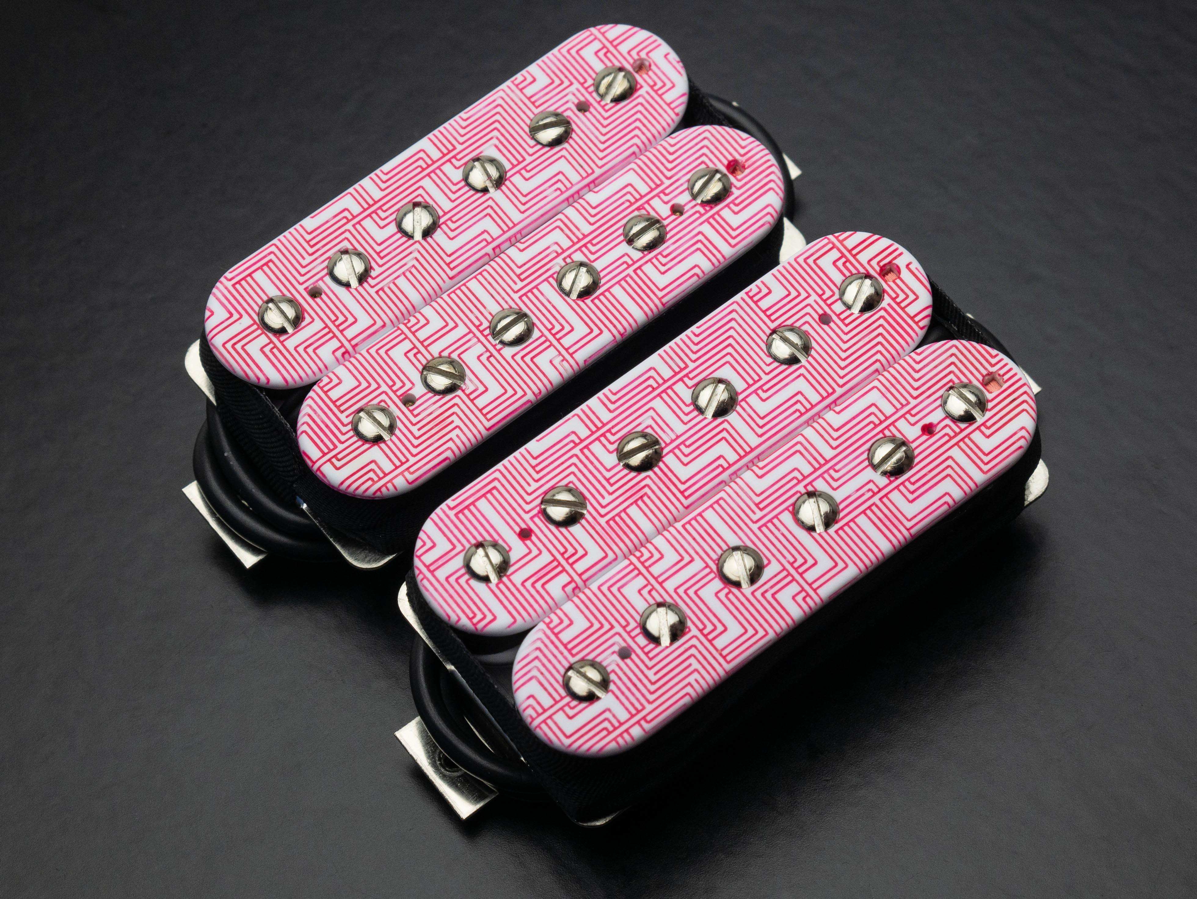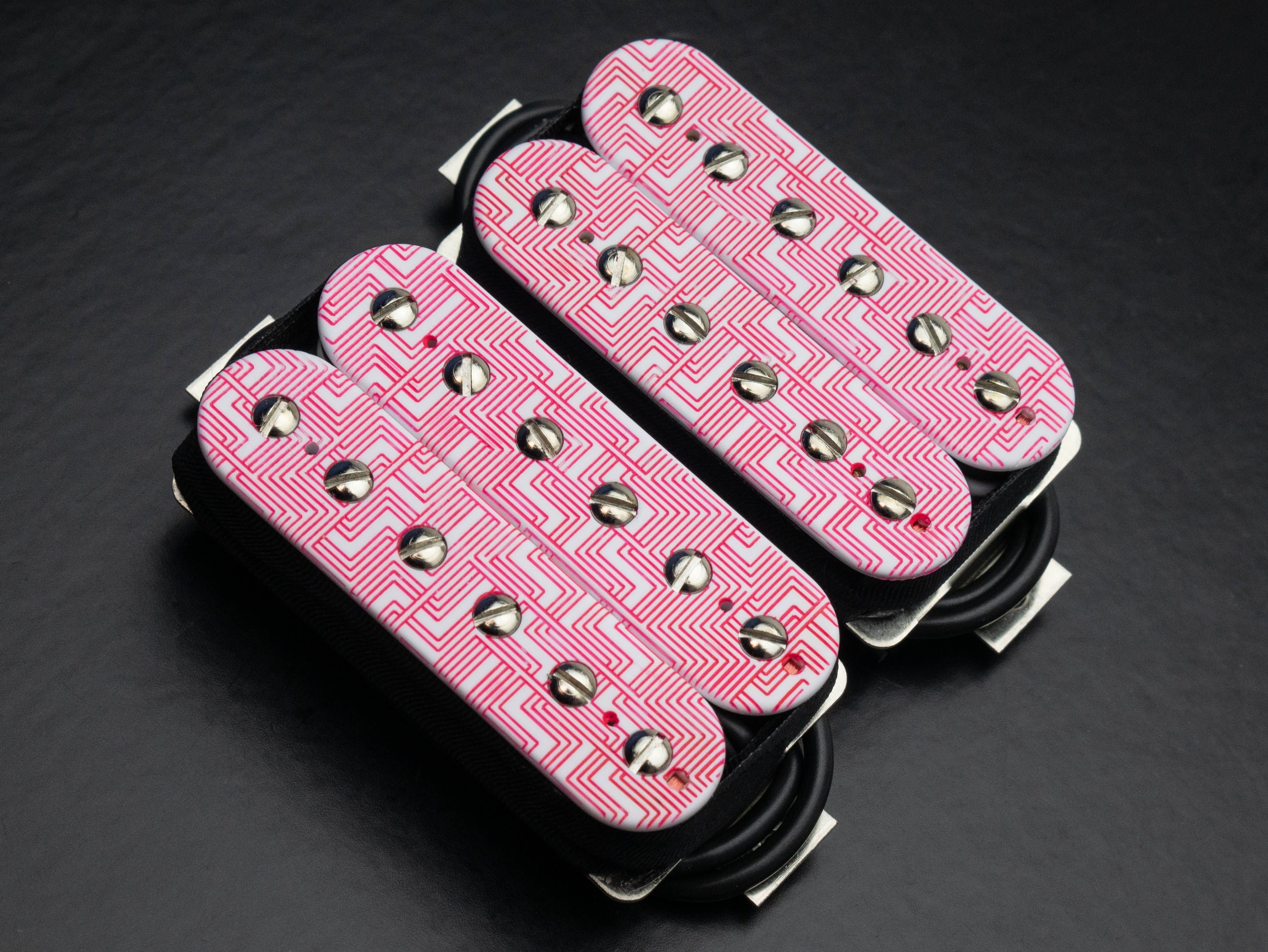 Aftermath humbucker set with custom etched and painted white / pink gemetric finish.