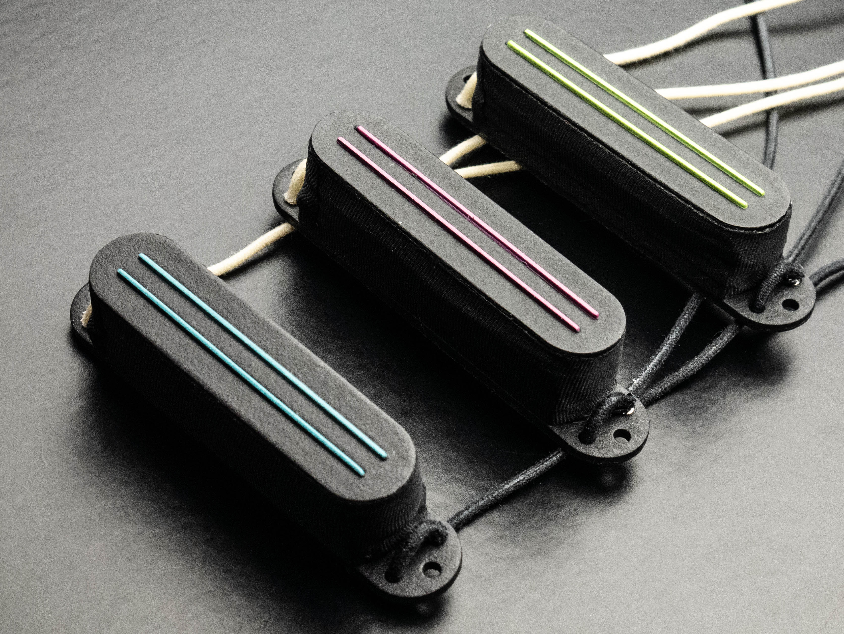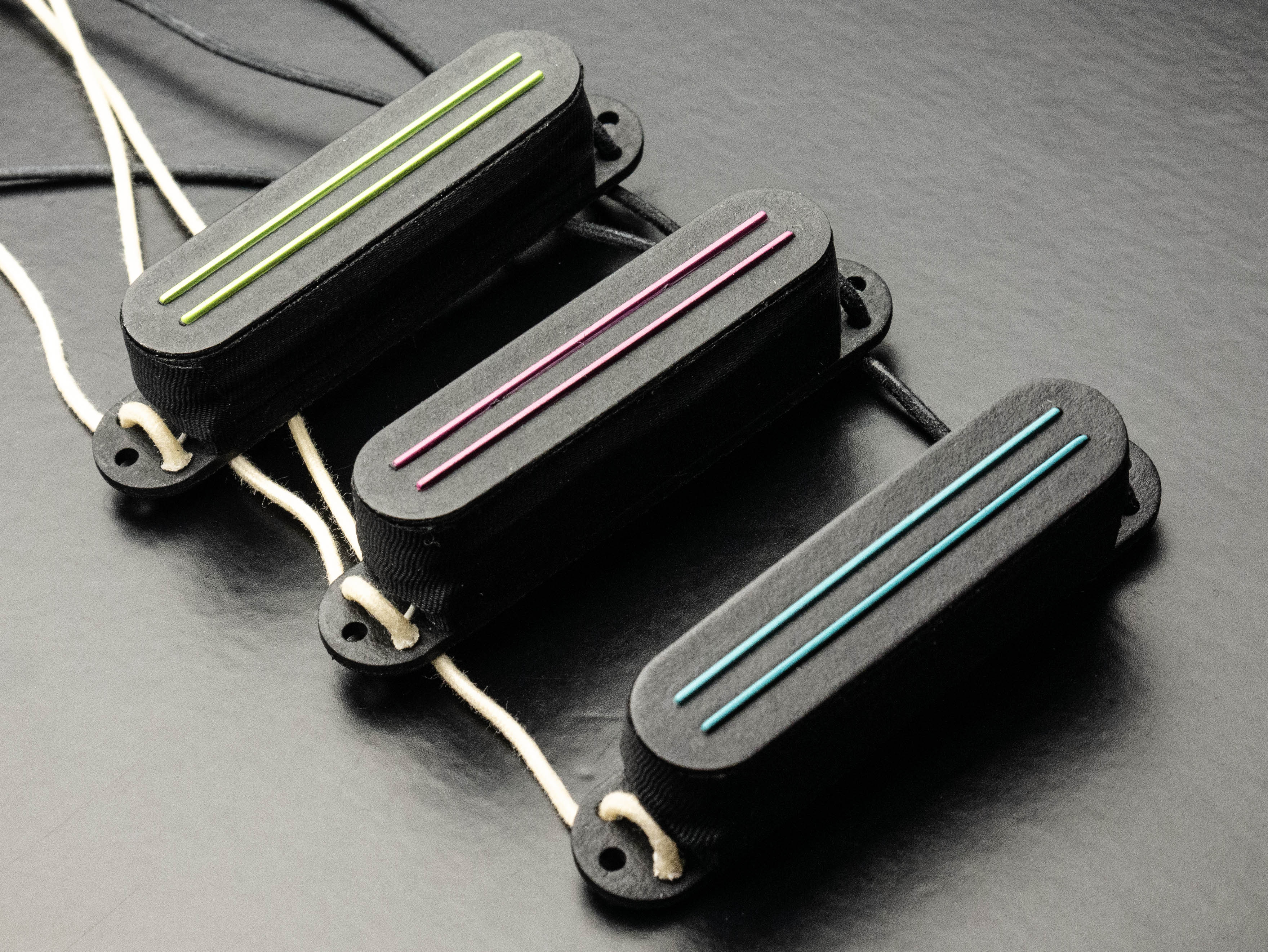 Cobra Strat singlecoil set in black with custom aquamarine, hot pink and lime blades