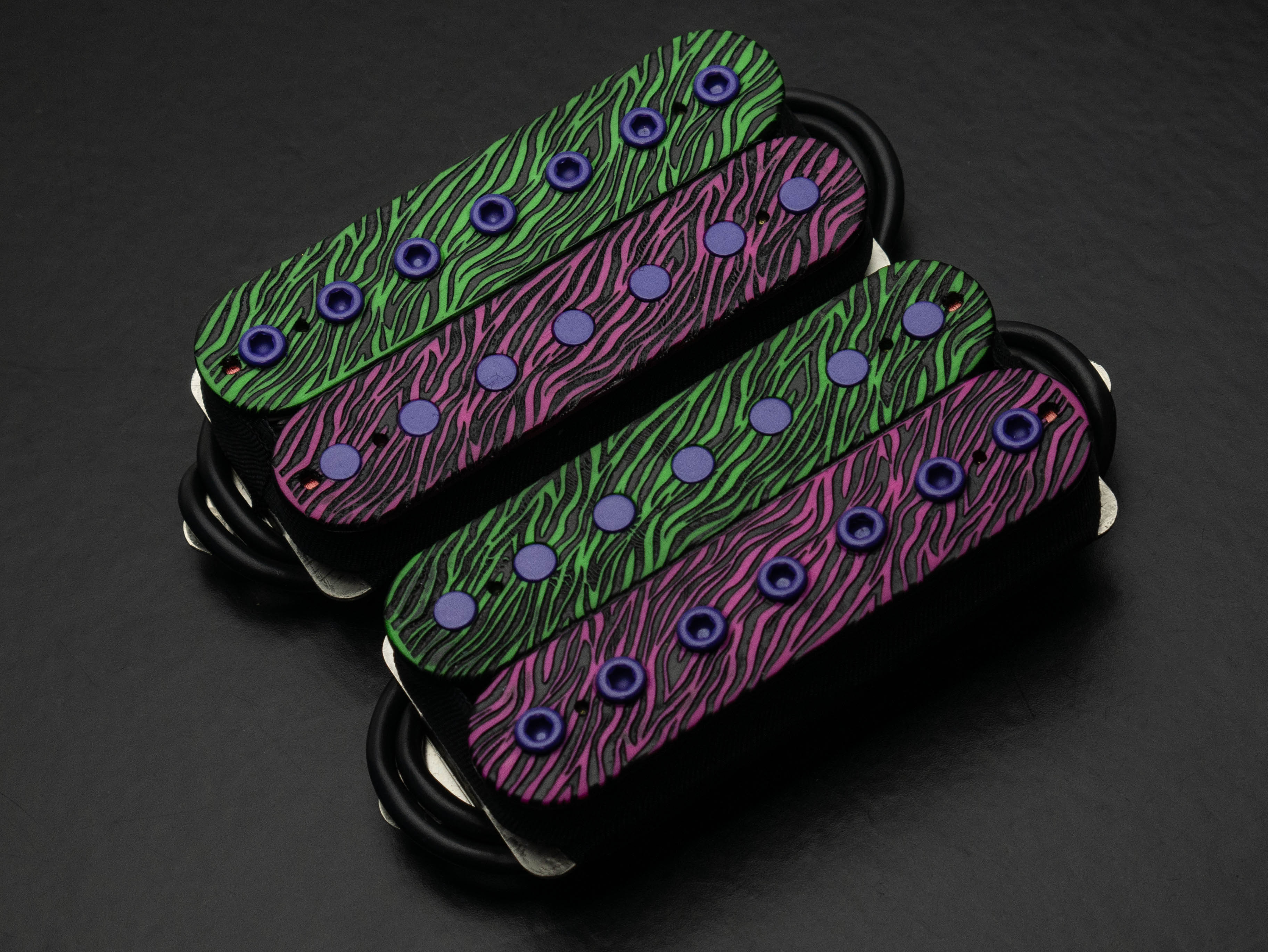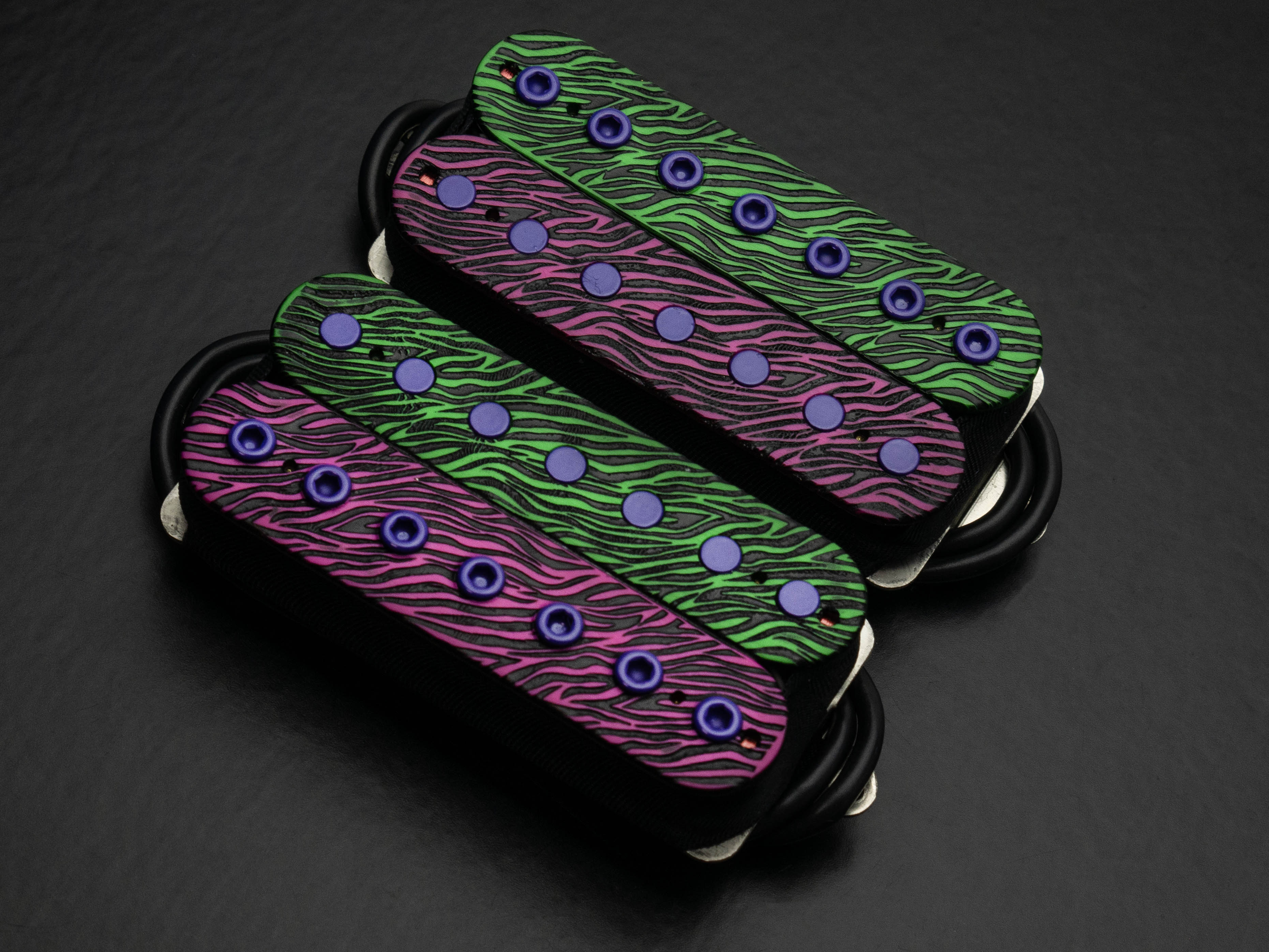 Custom green and pink zebra etched 7 string Holydiver humbucker set.