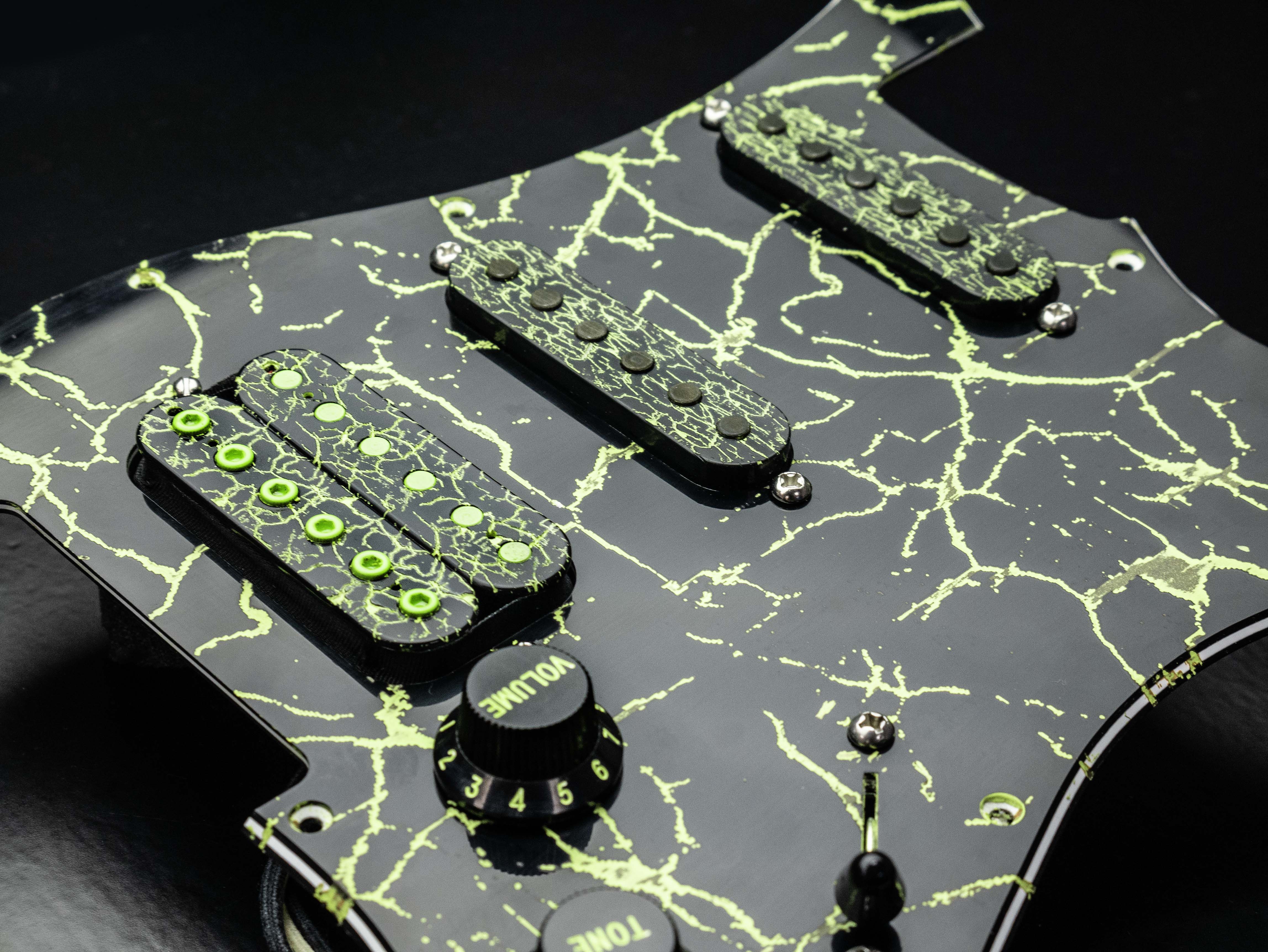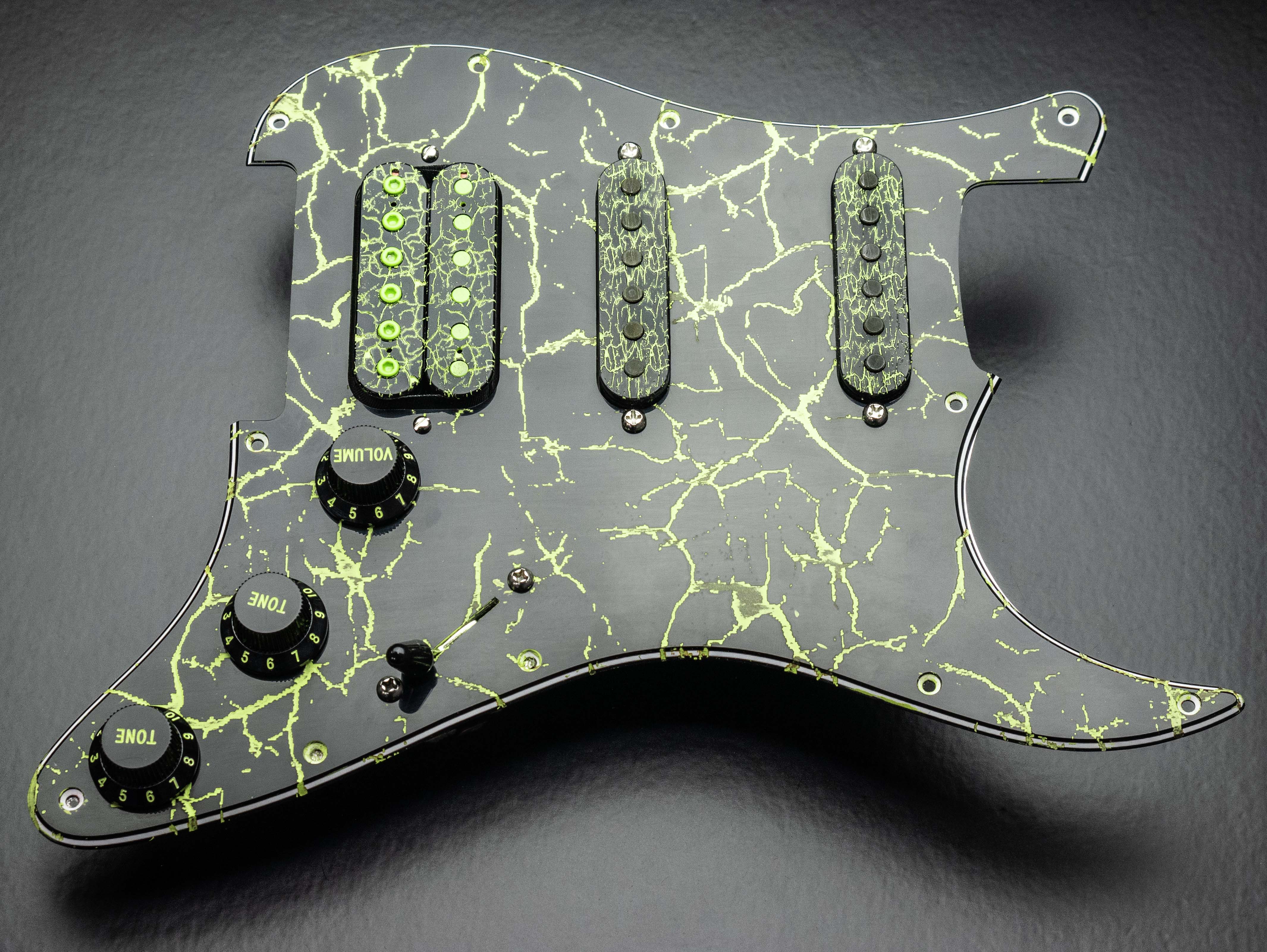 Custom pre-wired 11 hole HSS Strat pickguard in Handpainted Lime / Black Crackle, fitted with a Holydiver humbucker in the bridge and Trilogy Suite singlecoils in the middle and neck, all in a custom Lime / black crackle finish.