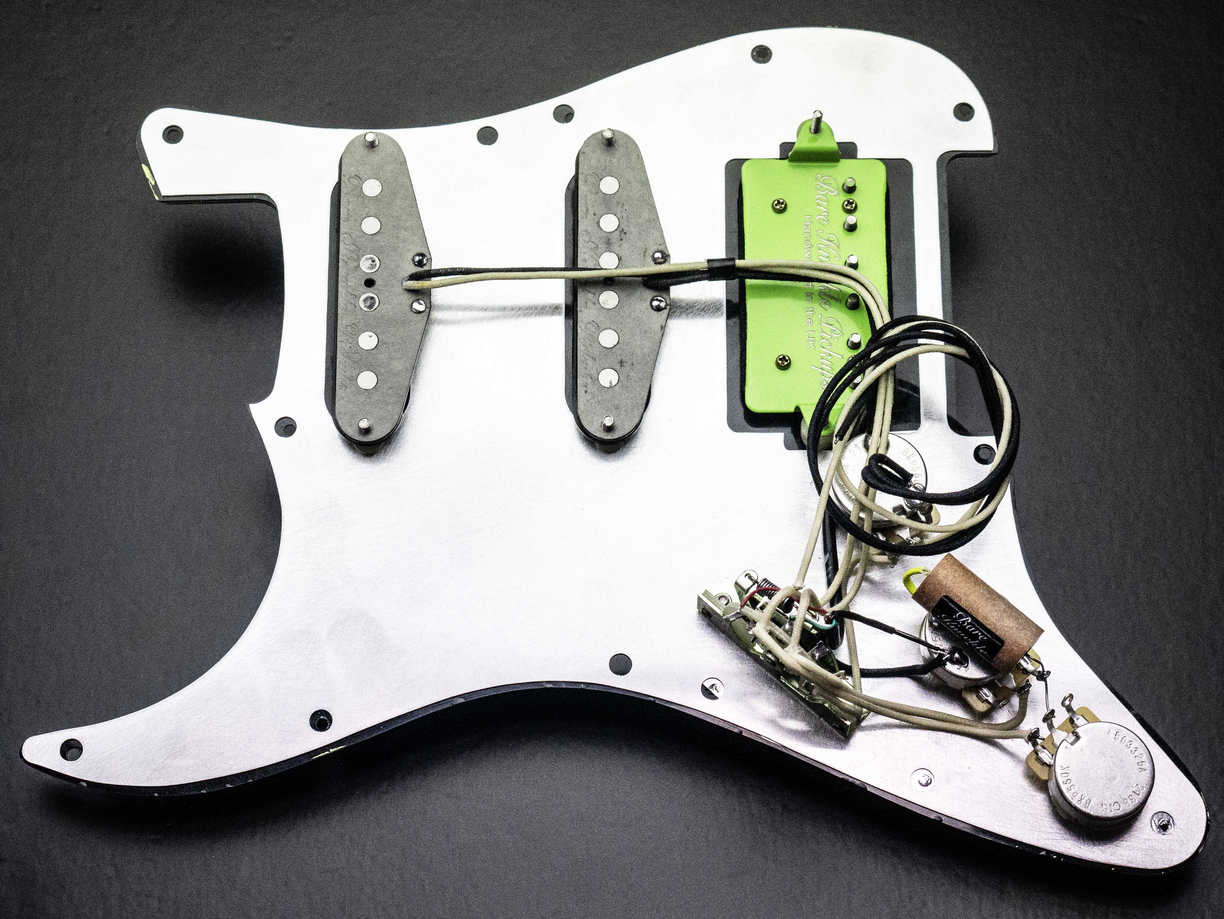 As with all of our pre-wired guards, this one and is handwired at our UK workshop, loaded with our custom spec BKP / CTS volume and tone pots and Duelund paper in oil tone capacitor and is wired to coilsplit the humbucker in switch position 2.