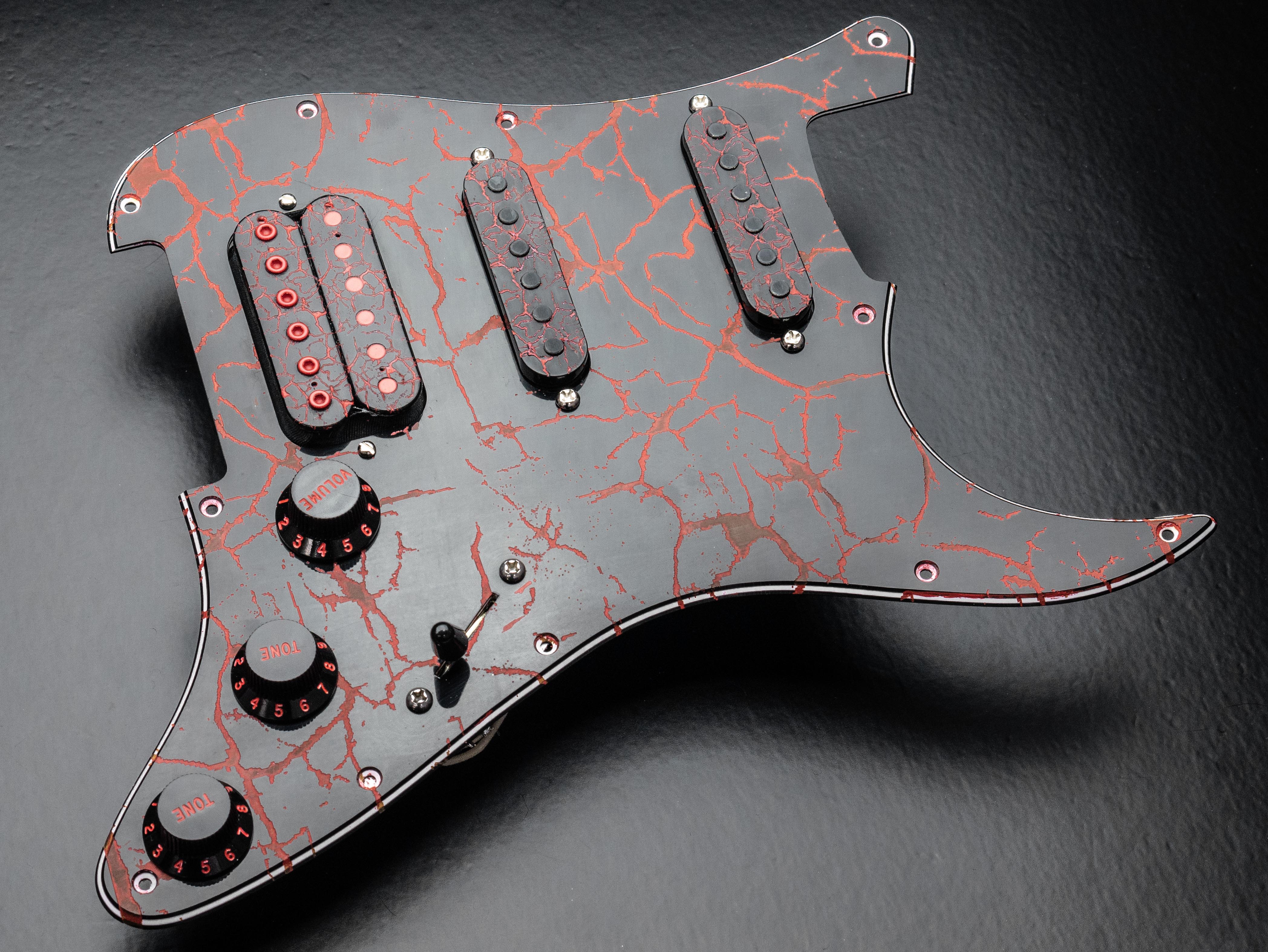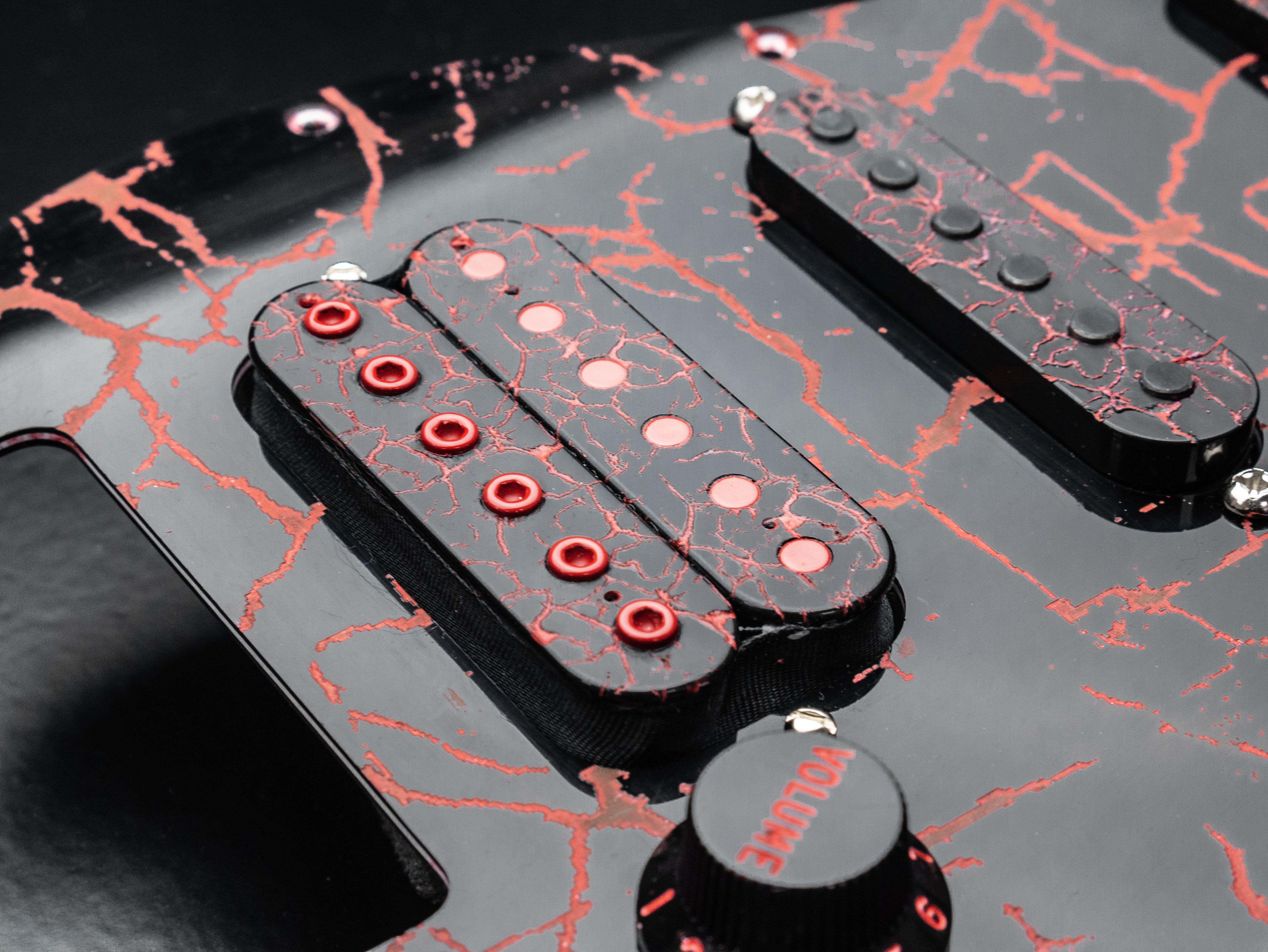 Custom pre-wired 11 hole HSS Strat pickguard in Handpainted Red / Black Crackle, fitted with a Holydiver humbucker in the bridge and Trilogy Suite singlecoils in the middle and neck, all in a custom red / black crackle finish.