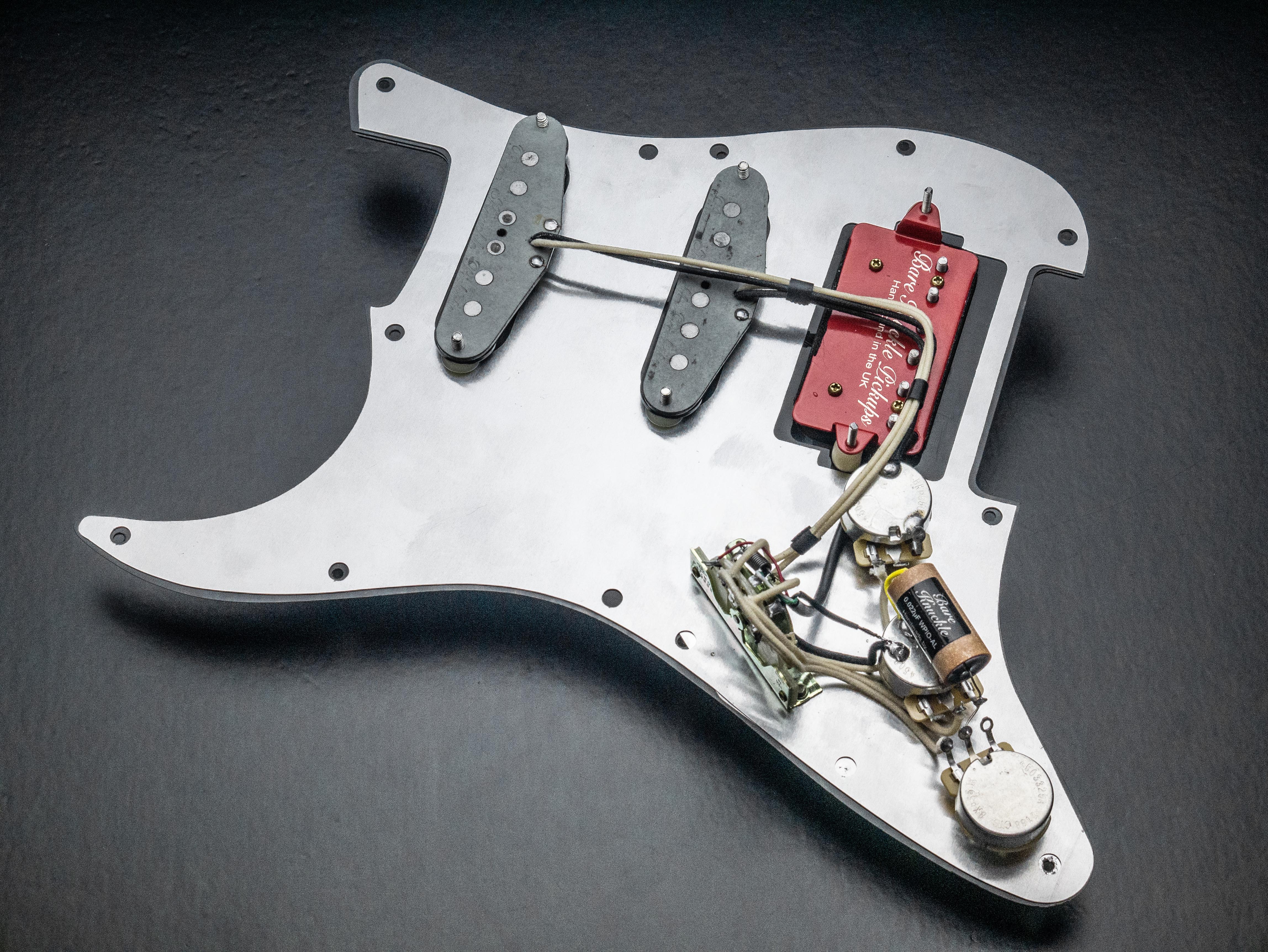As with all of our pre-wired guards, this one and is handwired at our UK workshop, loaded with our custom spec BKP / CTS volume and tone pots and Duelund paper in oil tone capacitor and is wired to coilsplit the humbucker in switch position 2.