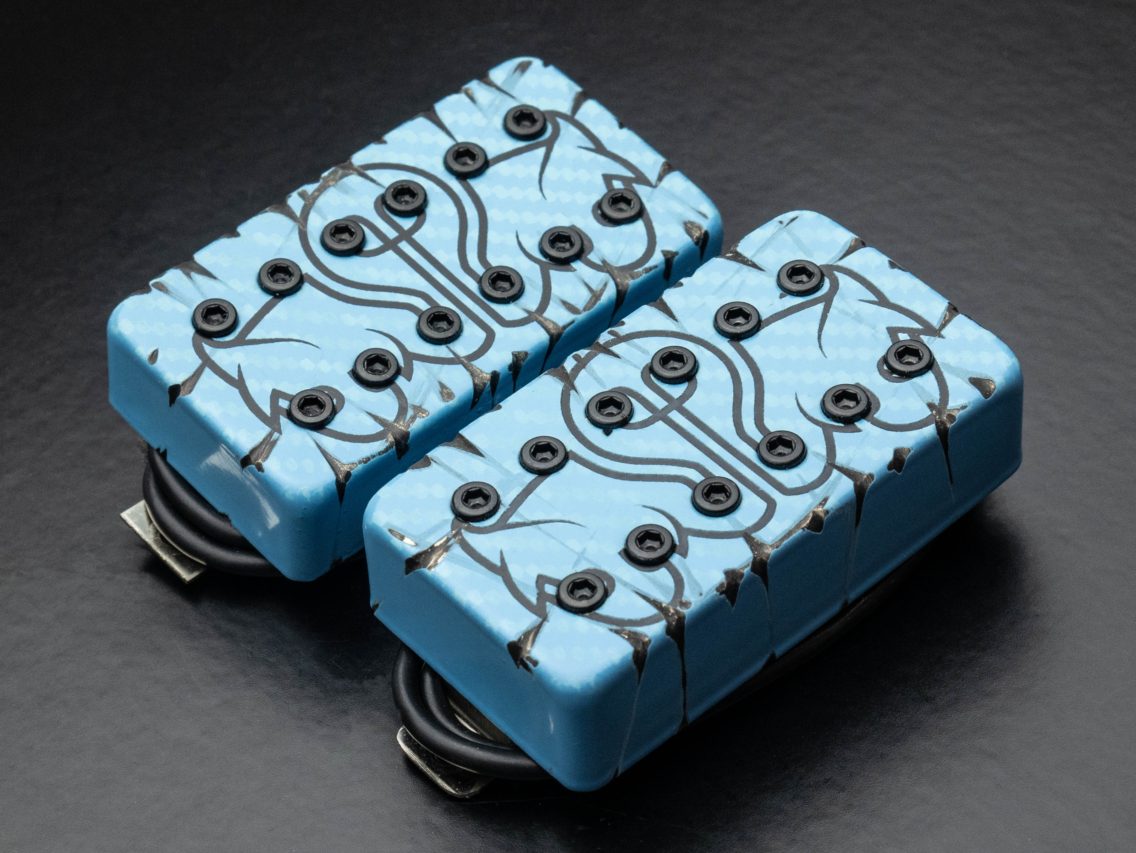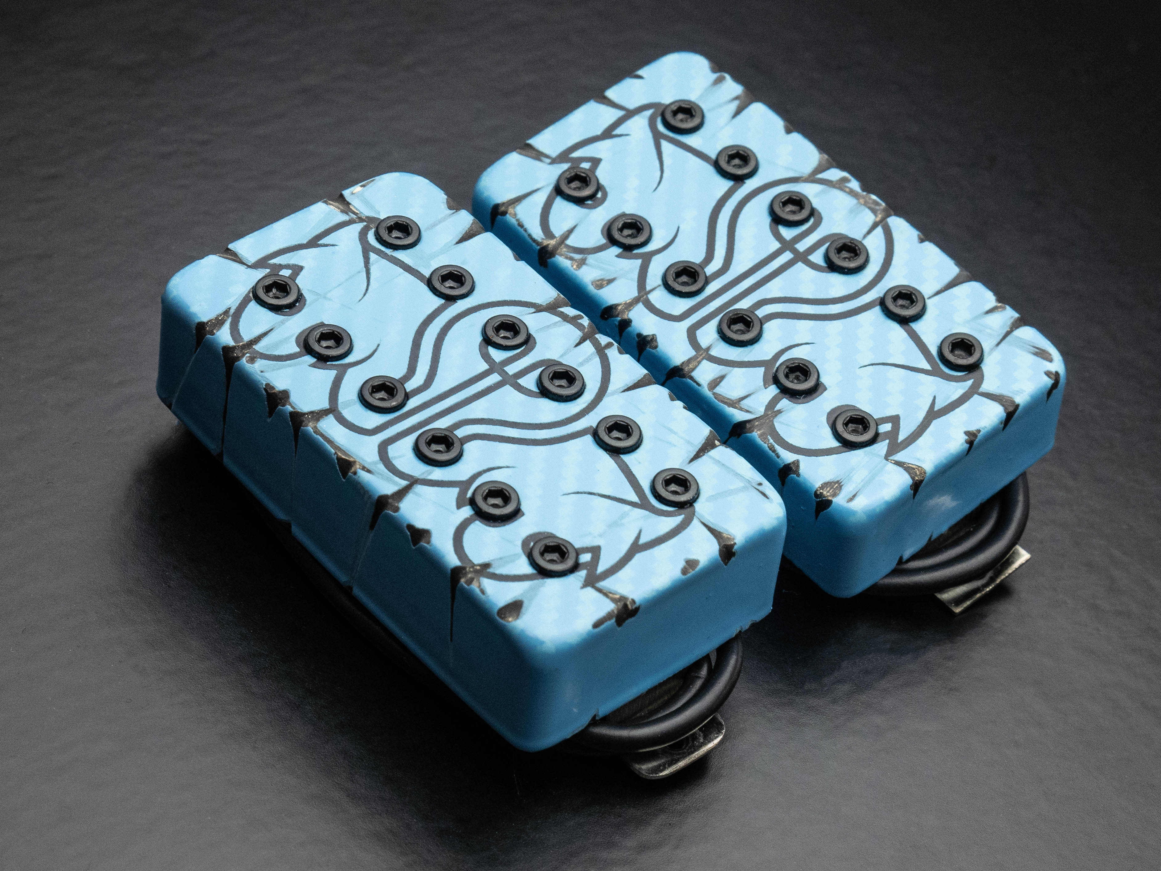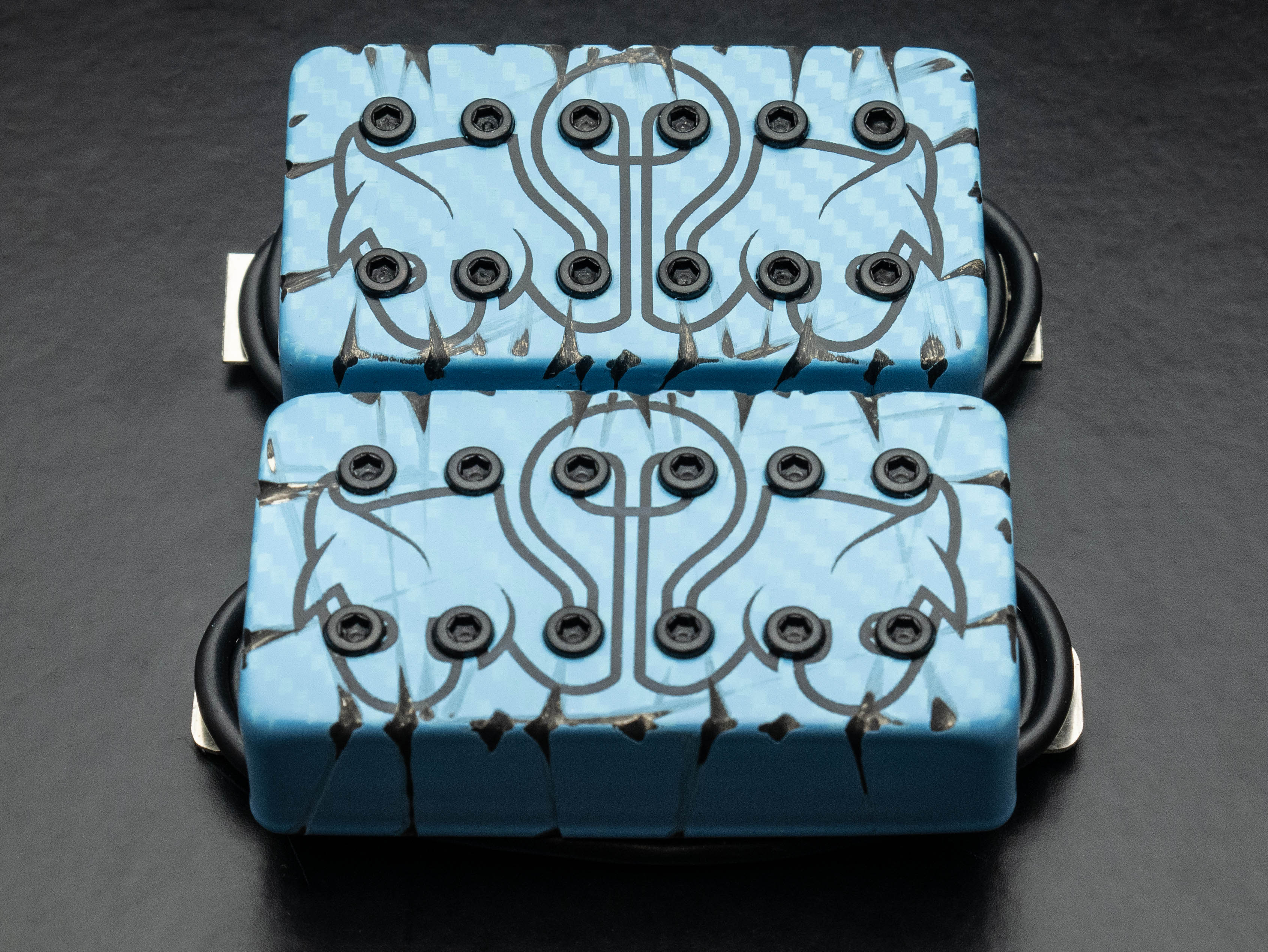 Misha Mansoor signature Juggernaut humbucker set with custom battleworn blue carbon tattoo / Juggernaut etched covers