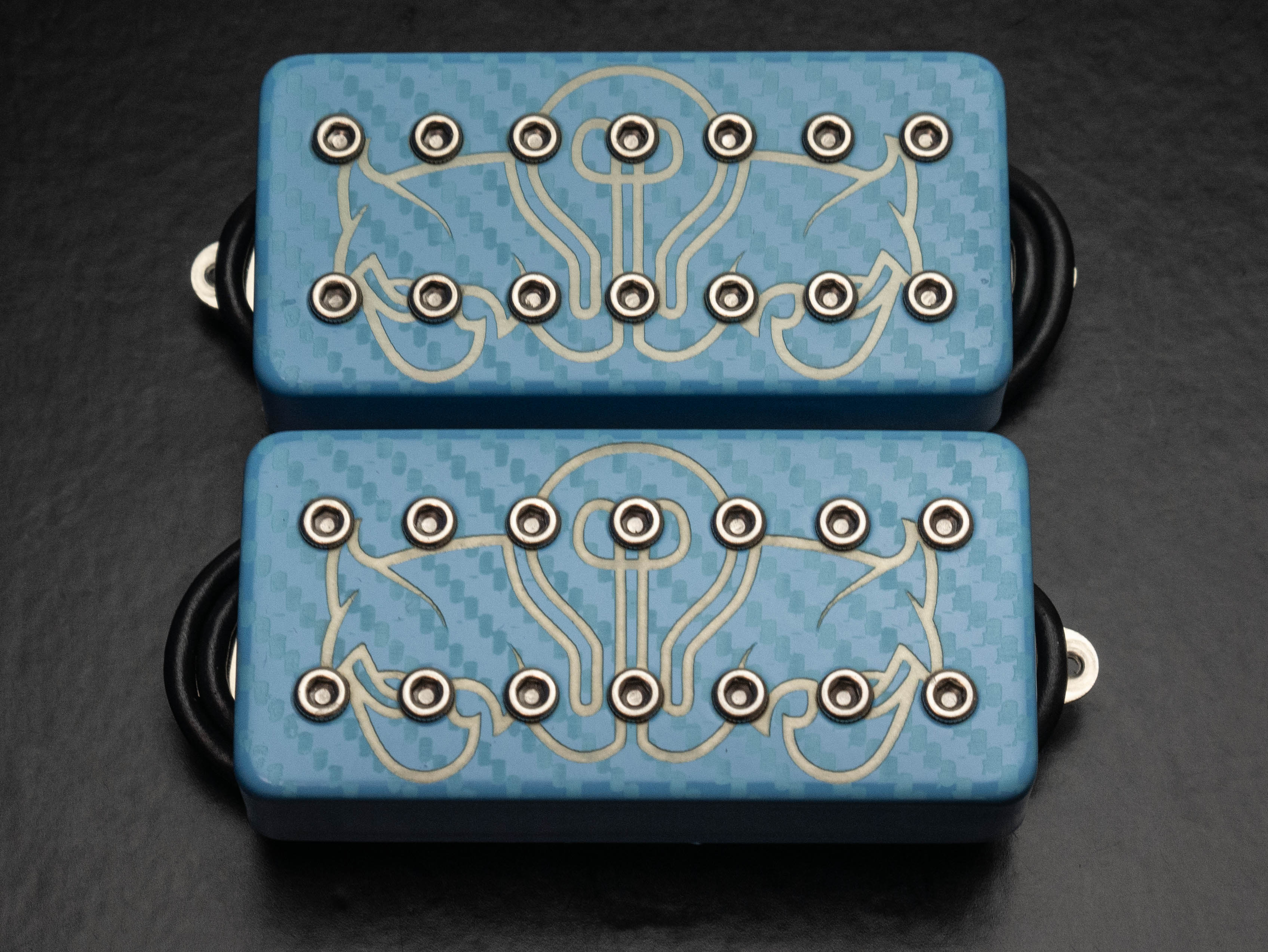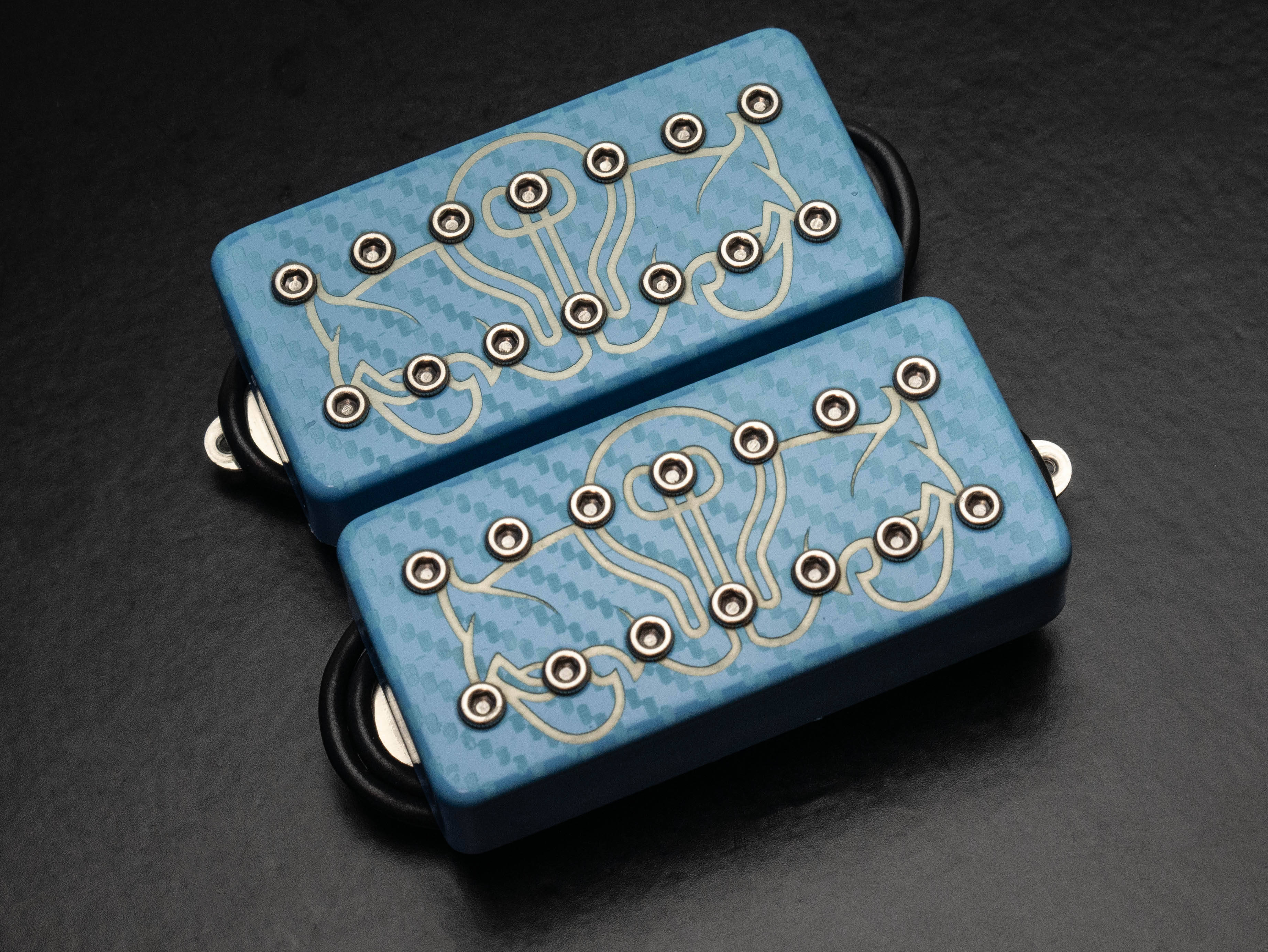 Misha Mansoor signature Juggernaut humbucker set with custom blue carbon tattoo / Juggernaut etched covers and nickel bolts