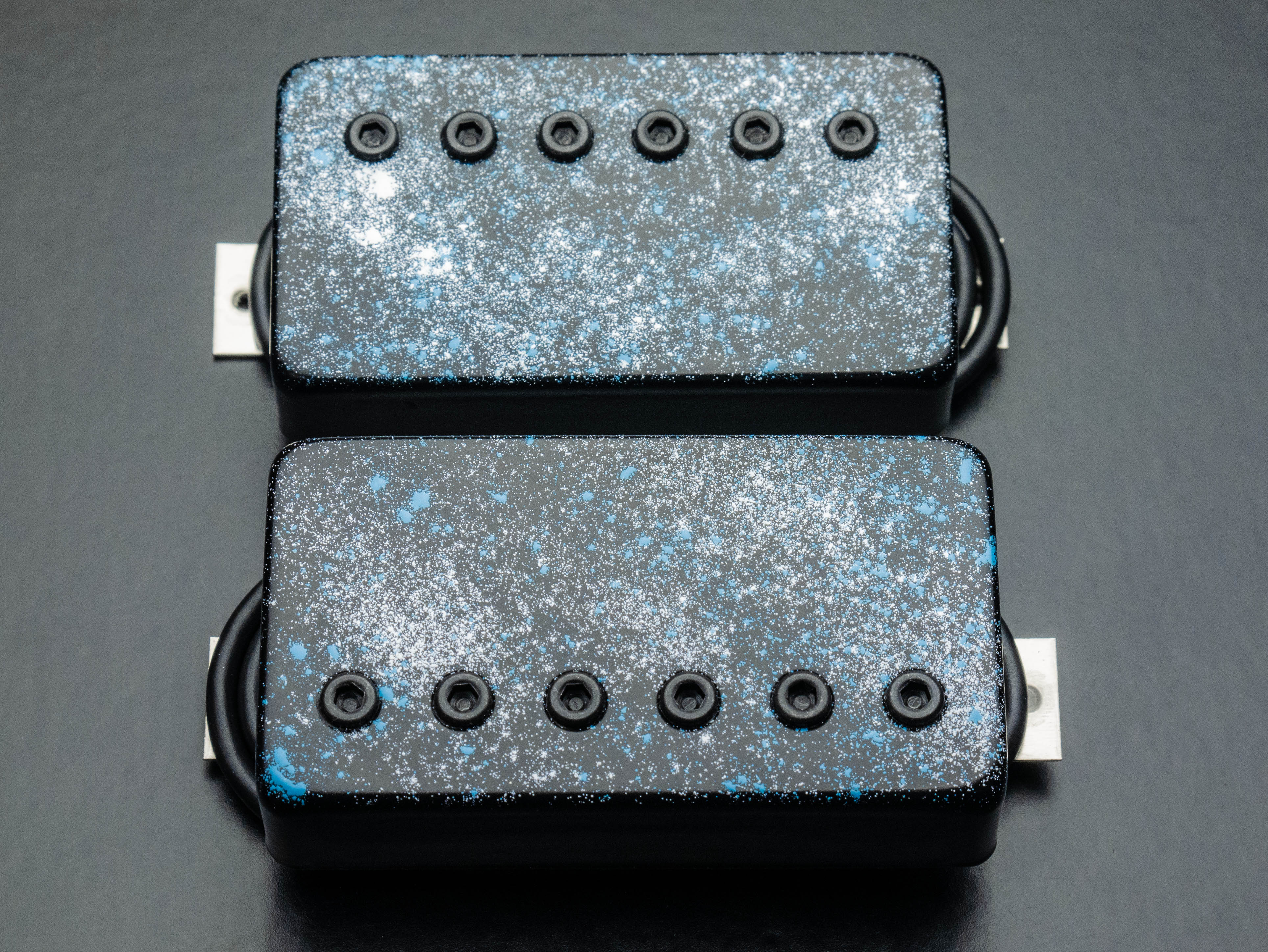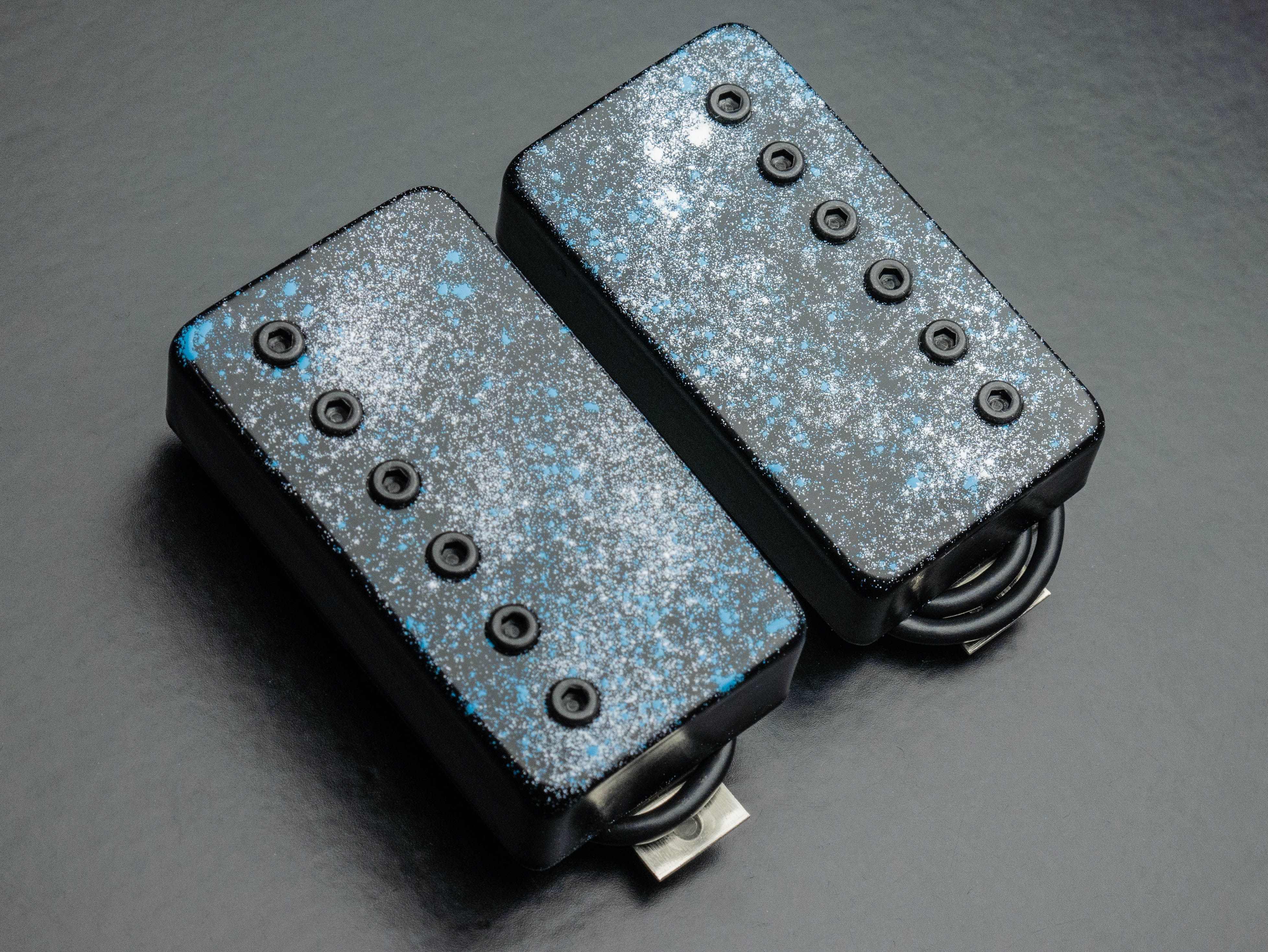 Custom Painkiller calibrated bridge/neck humbucker set with black / white / blue speckle finish