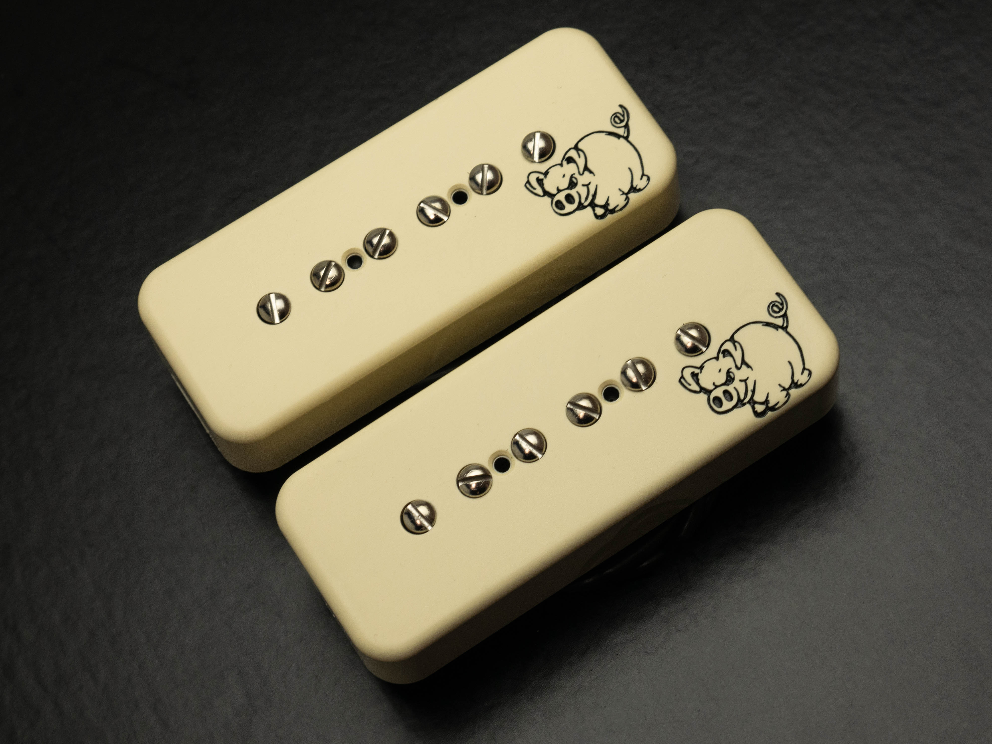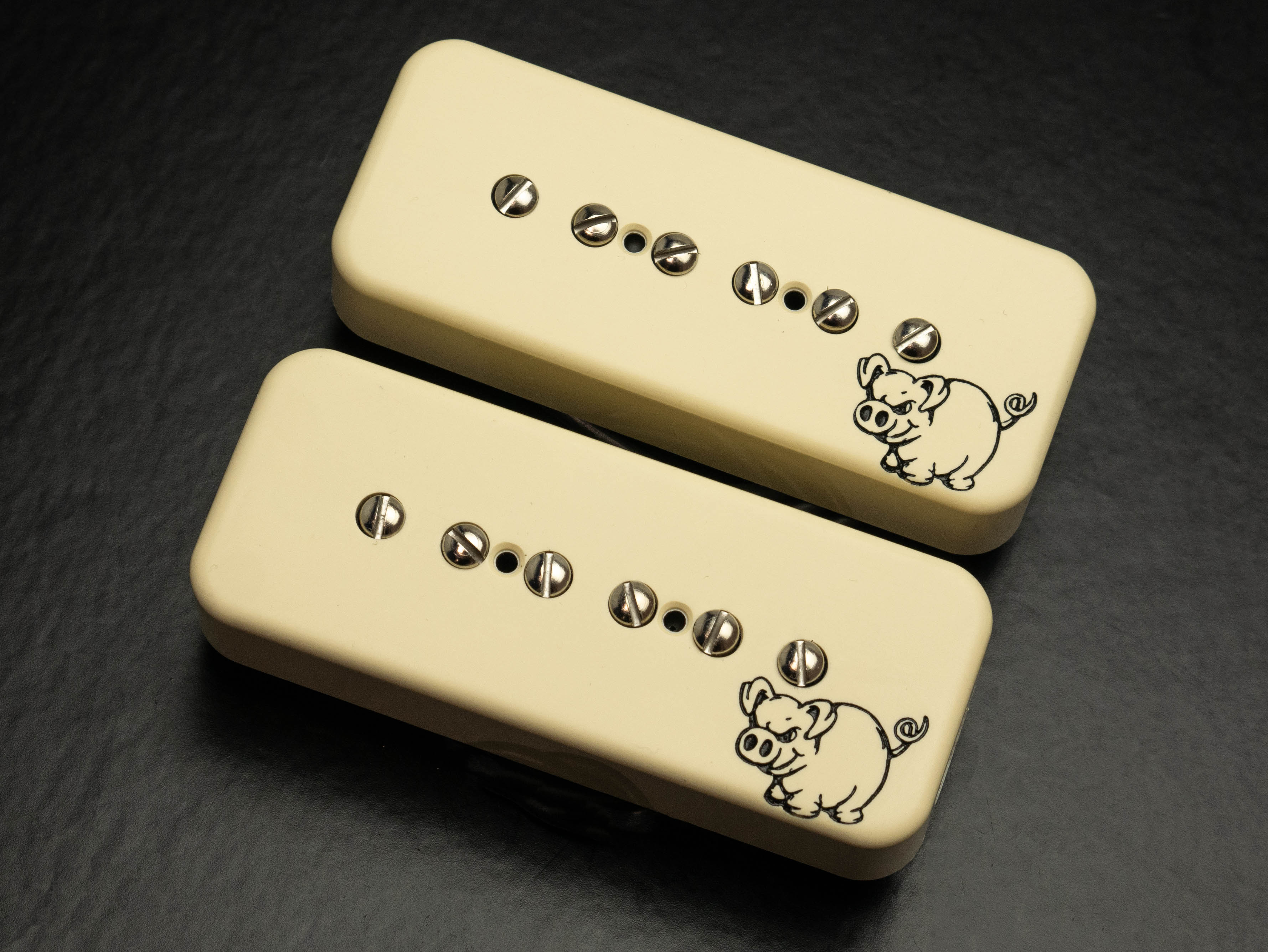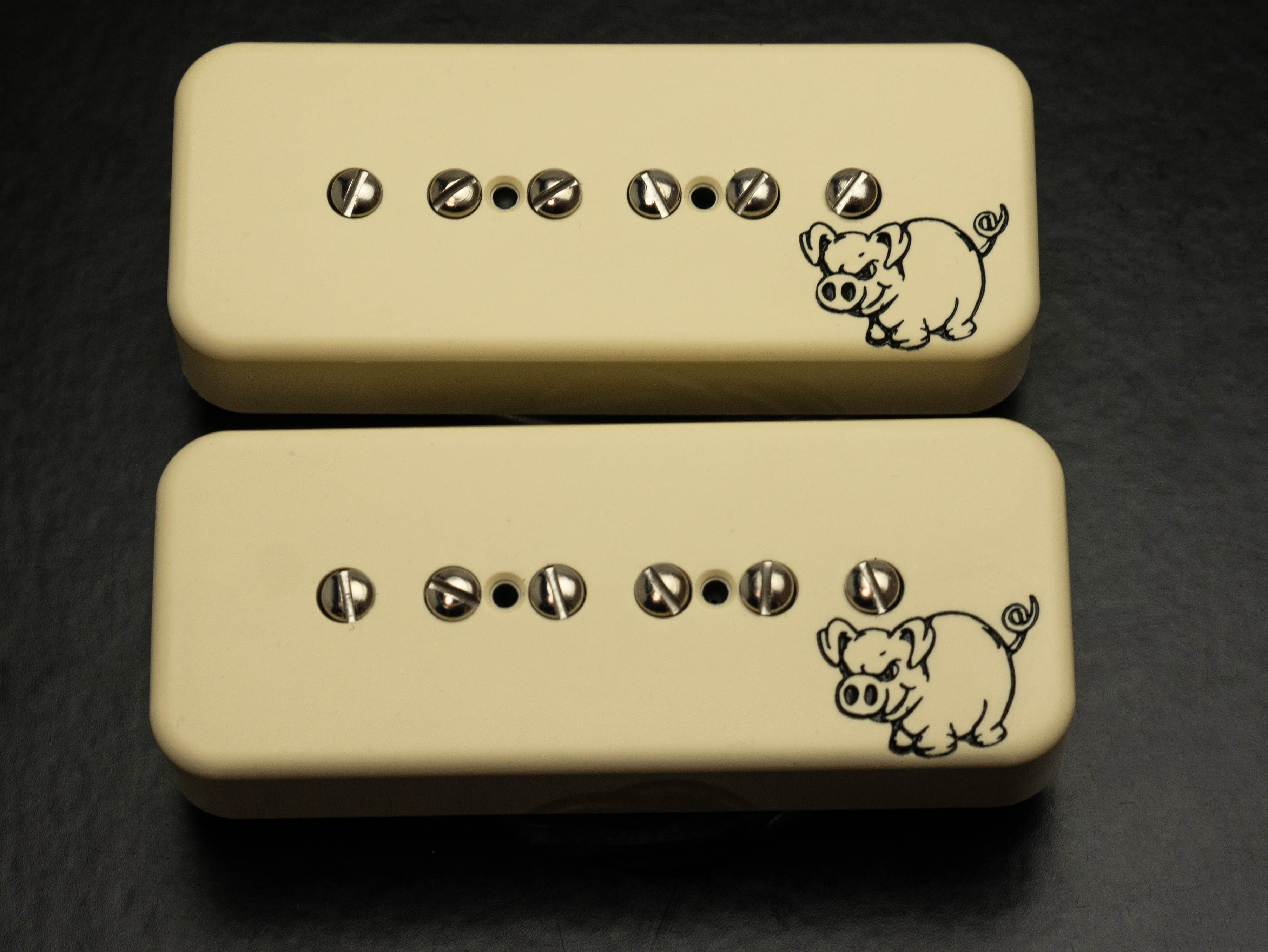 Custom set of 'Pig 90 P90 singlecoils with cream covers, nickel screws and pig etch design.