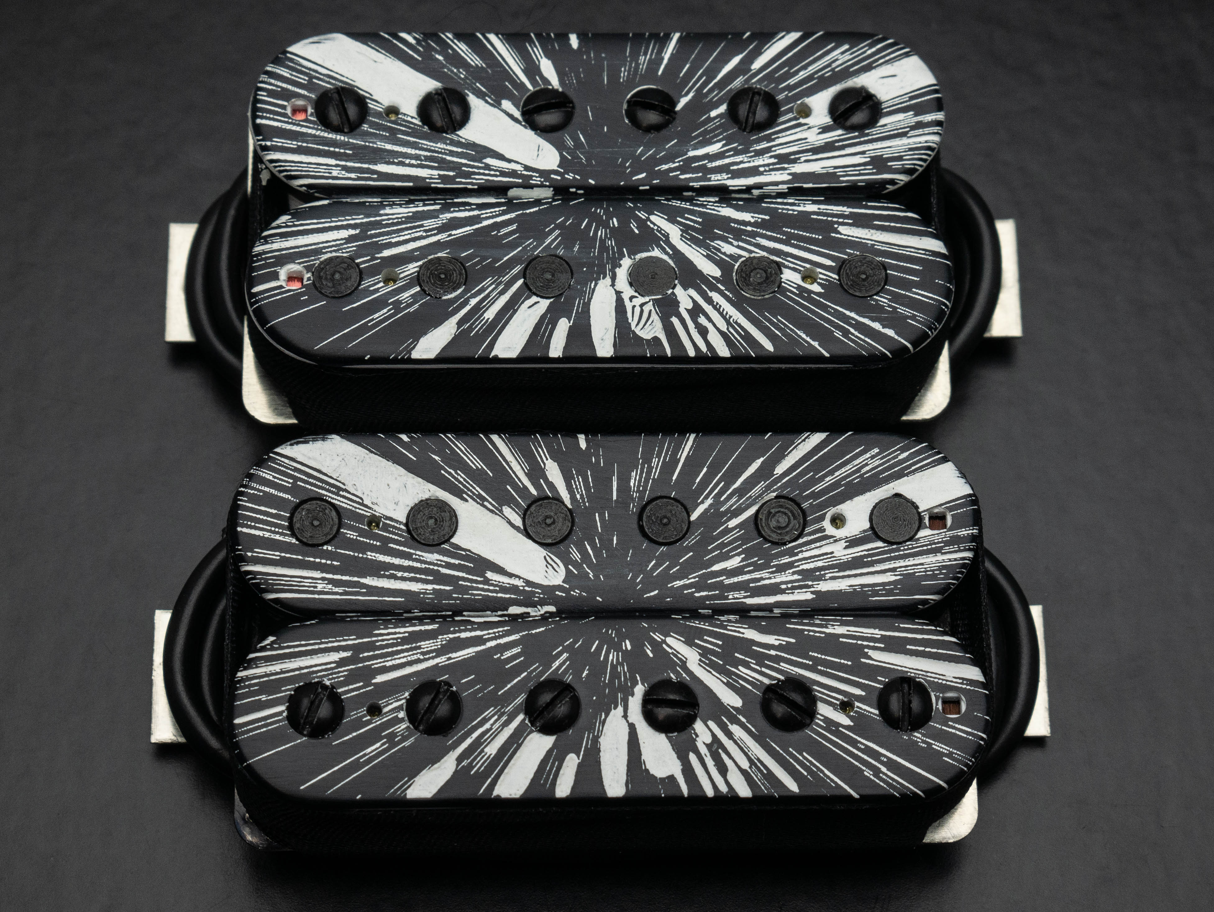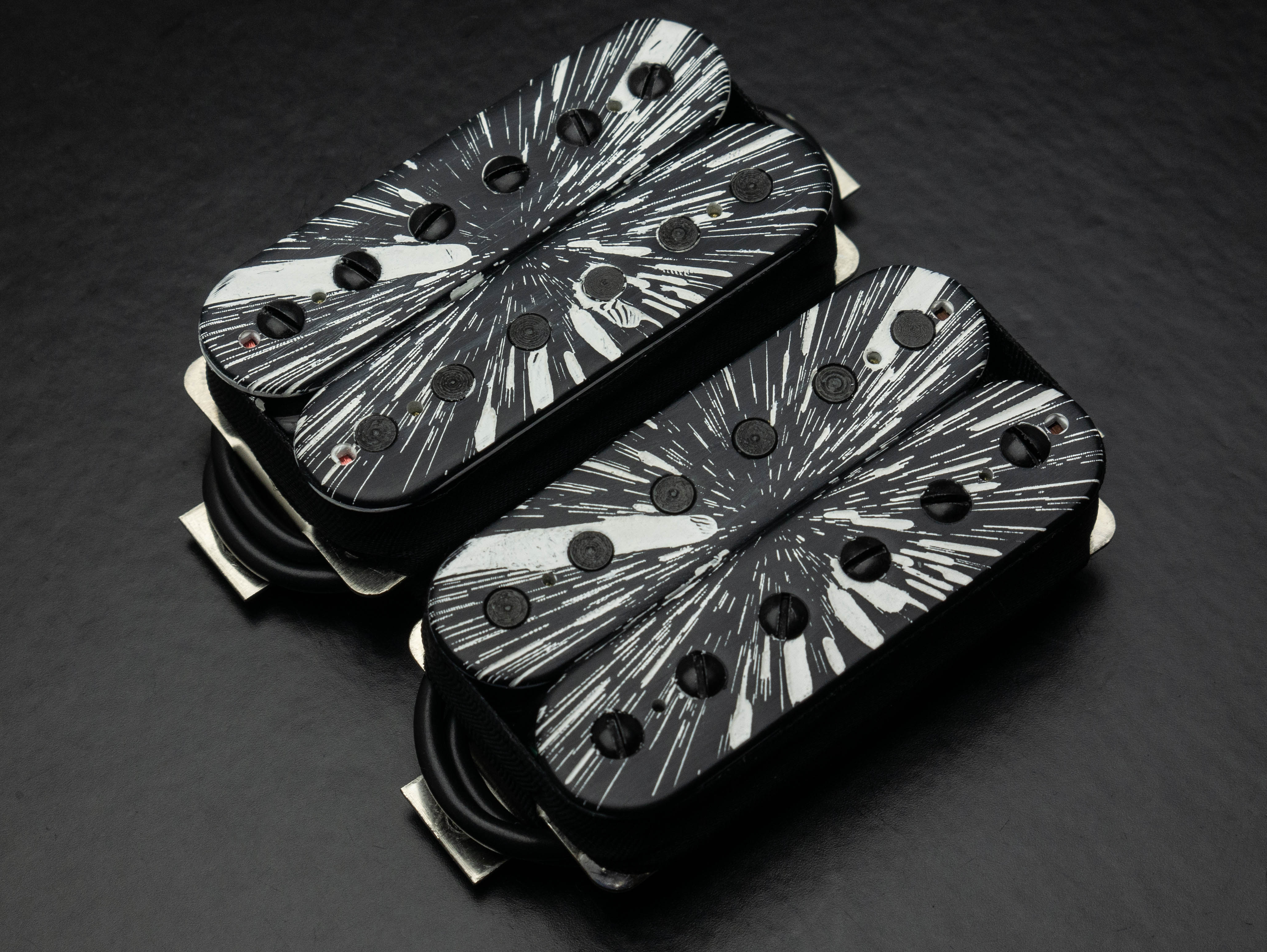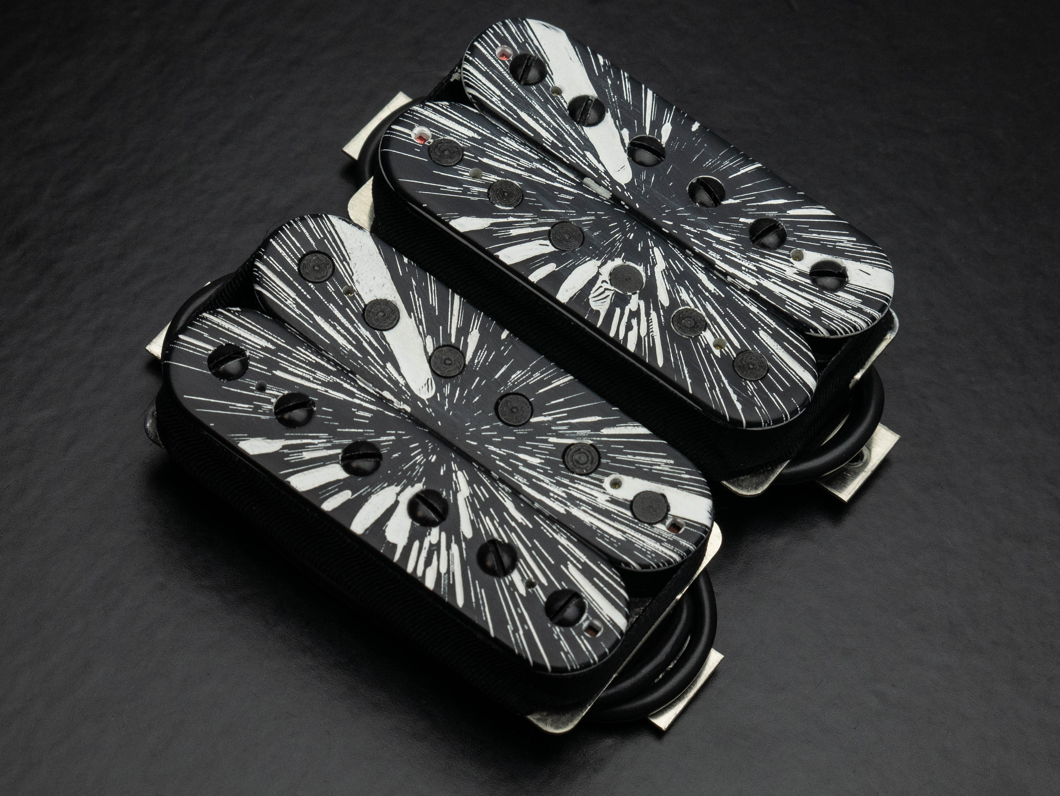 Rebel Yell humbucker set, custom etched and painted with black and white "warp speed" finish
