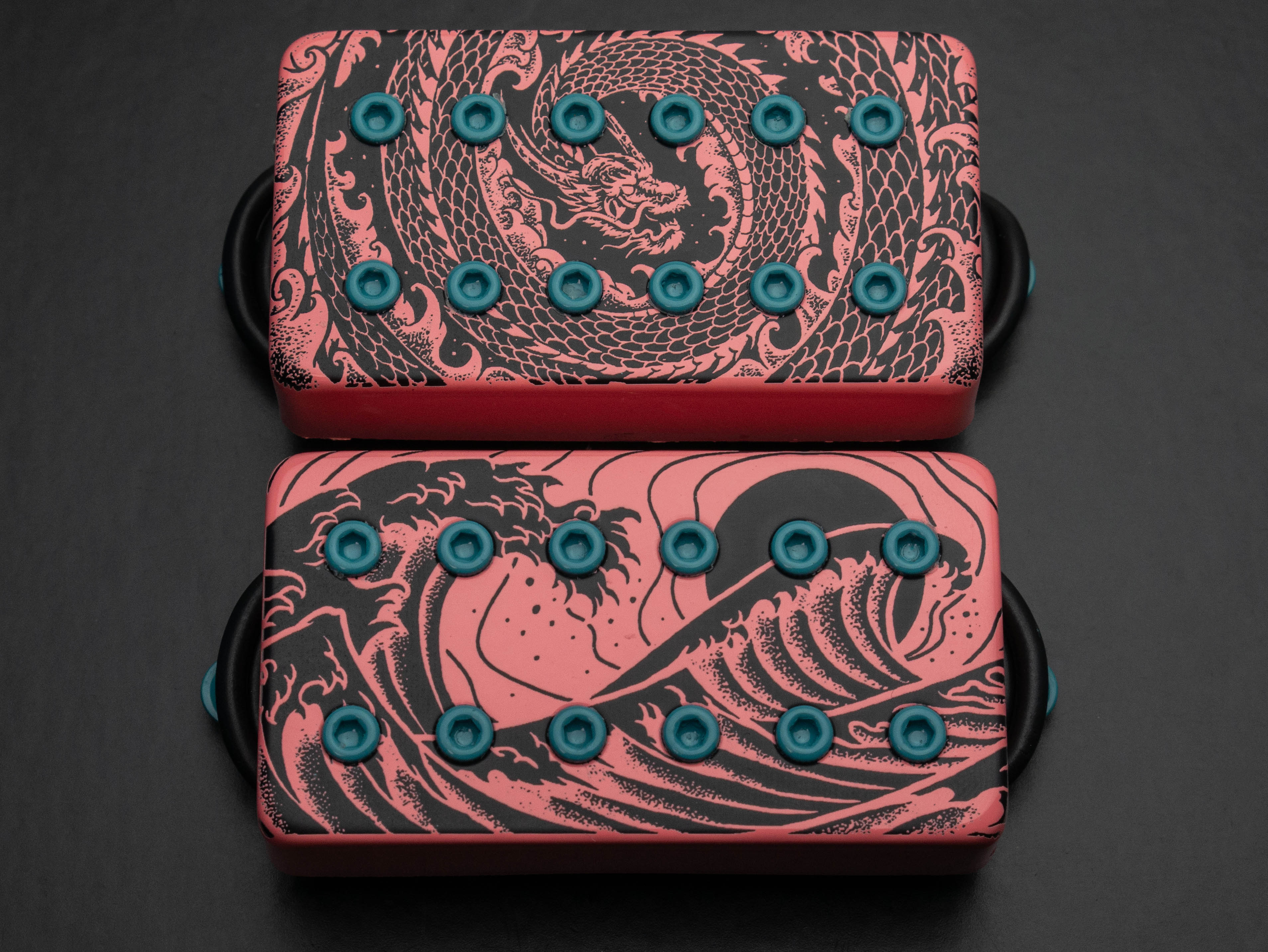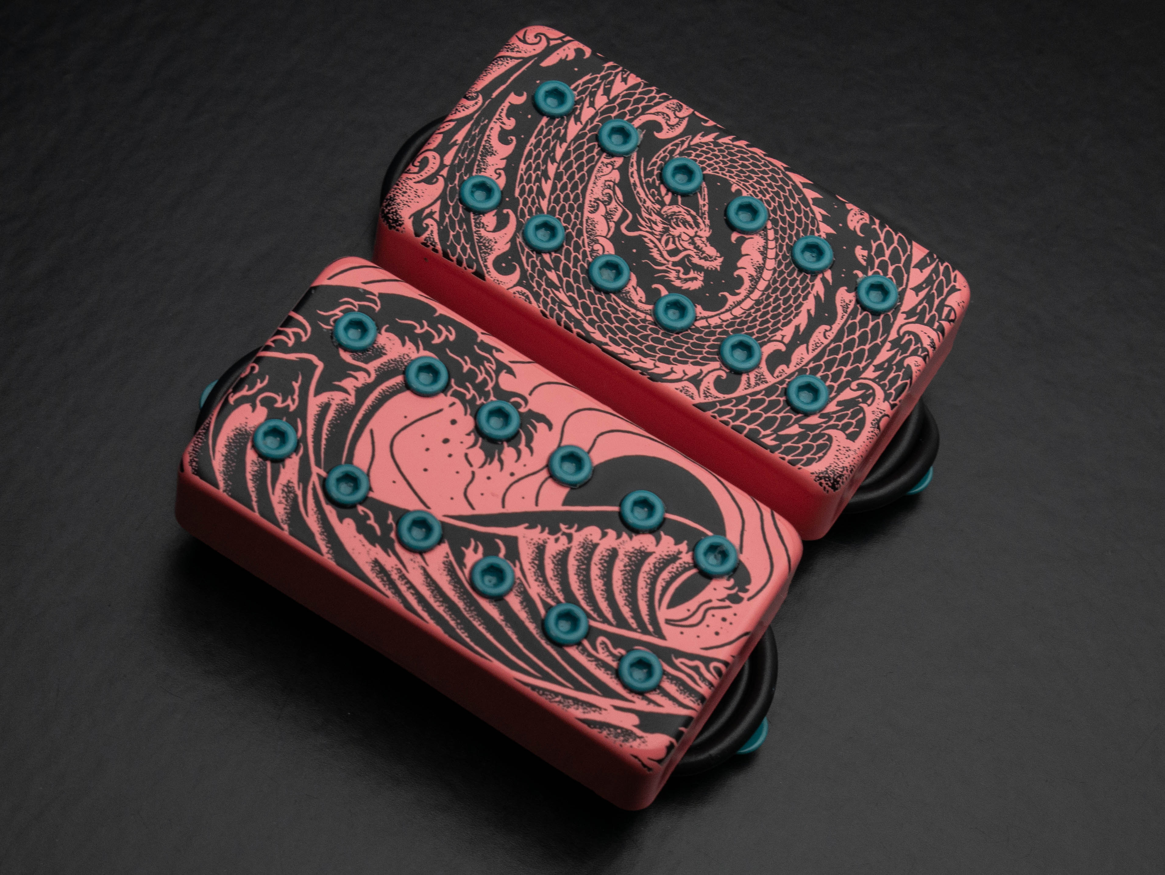 Custom Rabea Massaad signature Silo humbucker set in Coral Pink covered finish with aquamarine bolts and wave / dragon etching