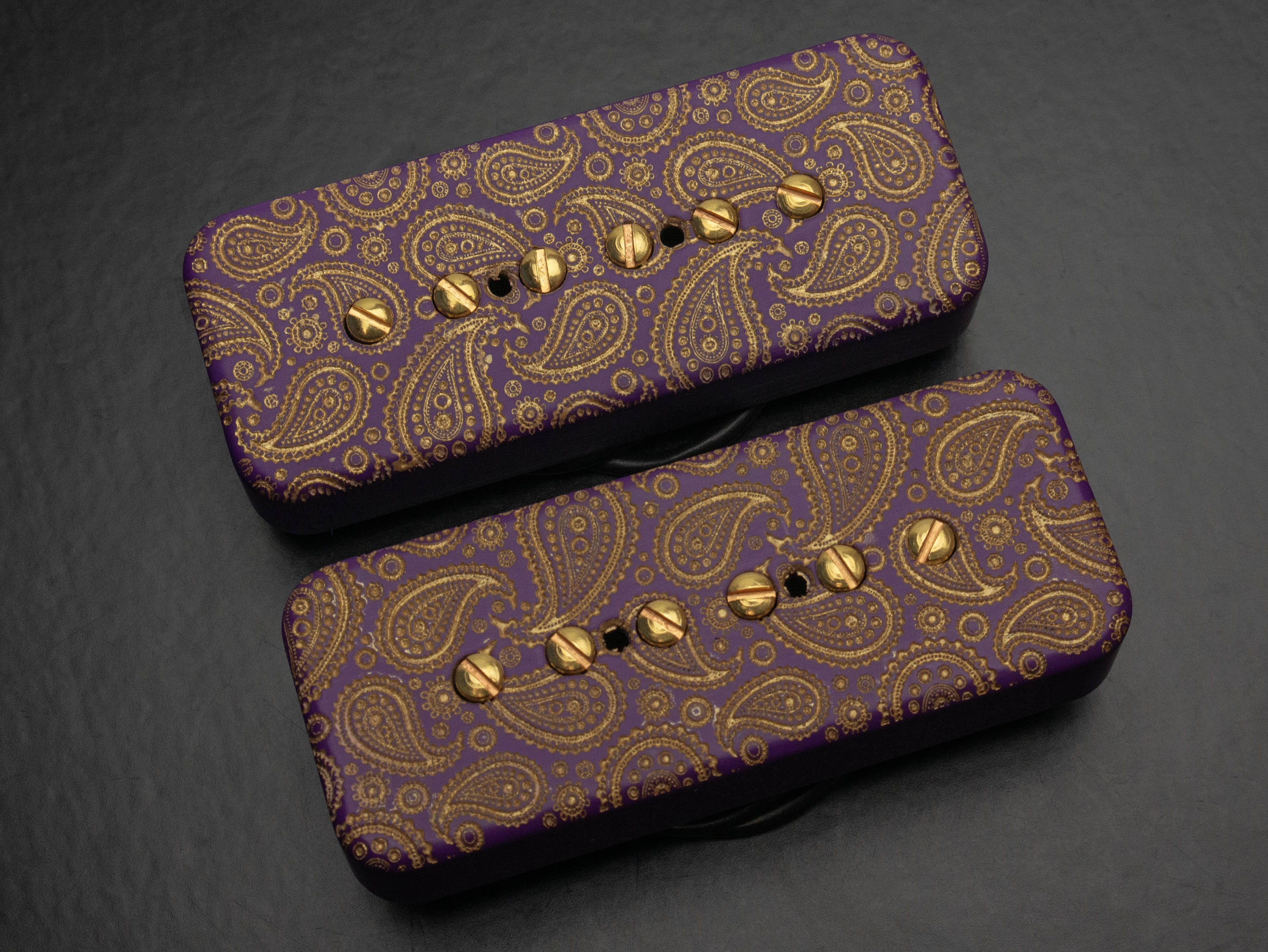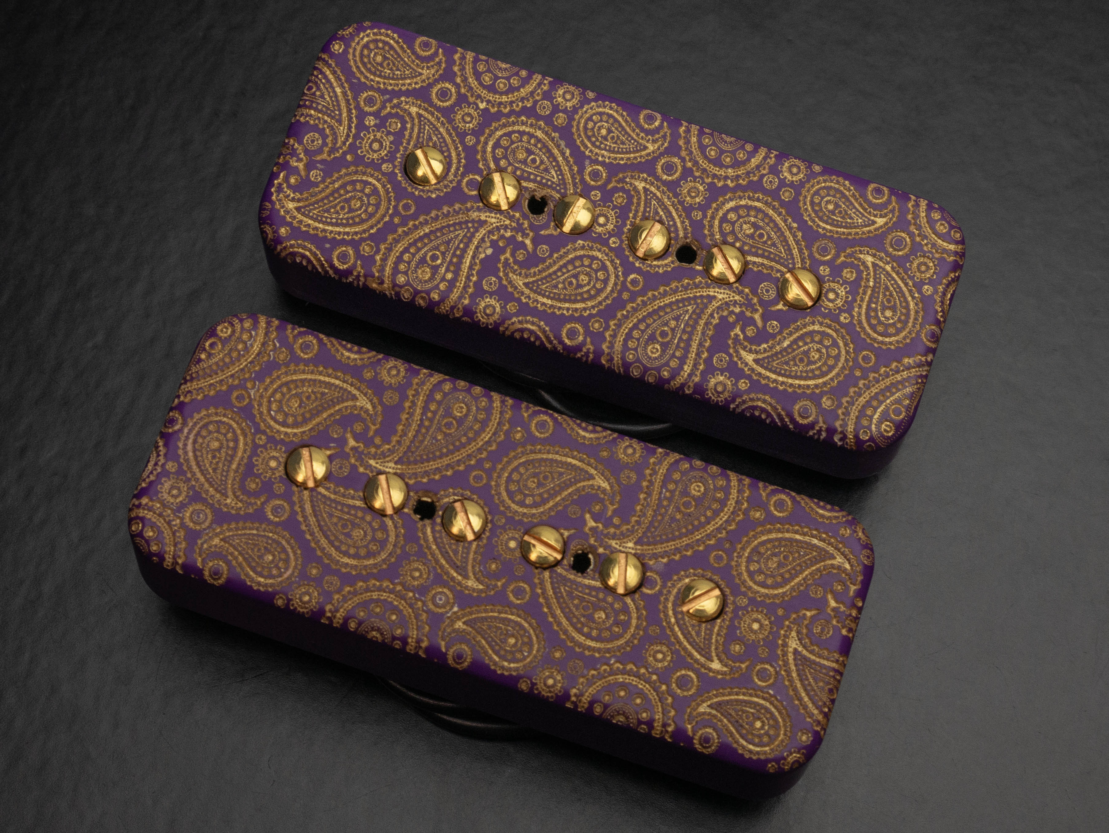 Special Edition Supermassive soapbar P90 calibrated bridge and neck set with custom Paisley etch purple / gold covers and gold screws