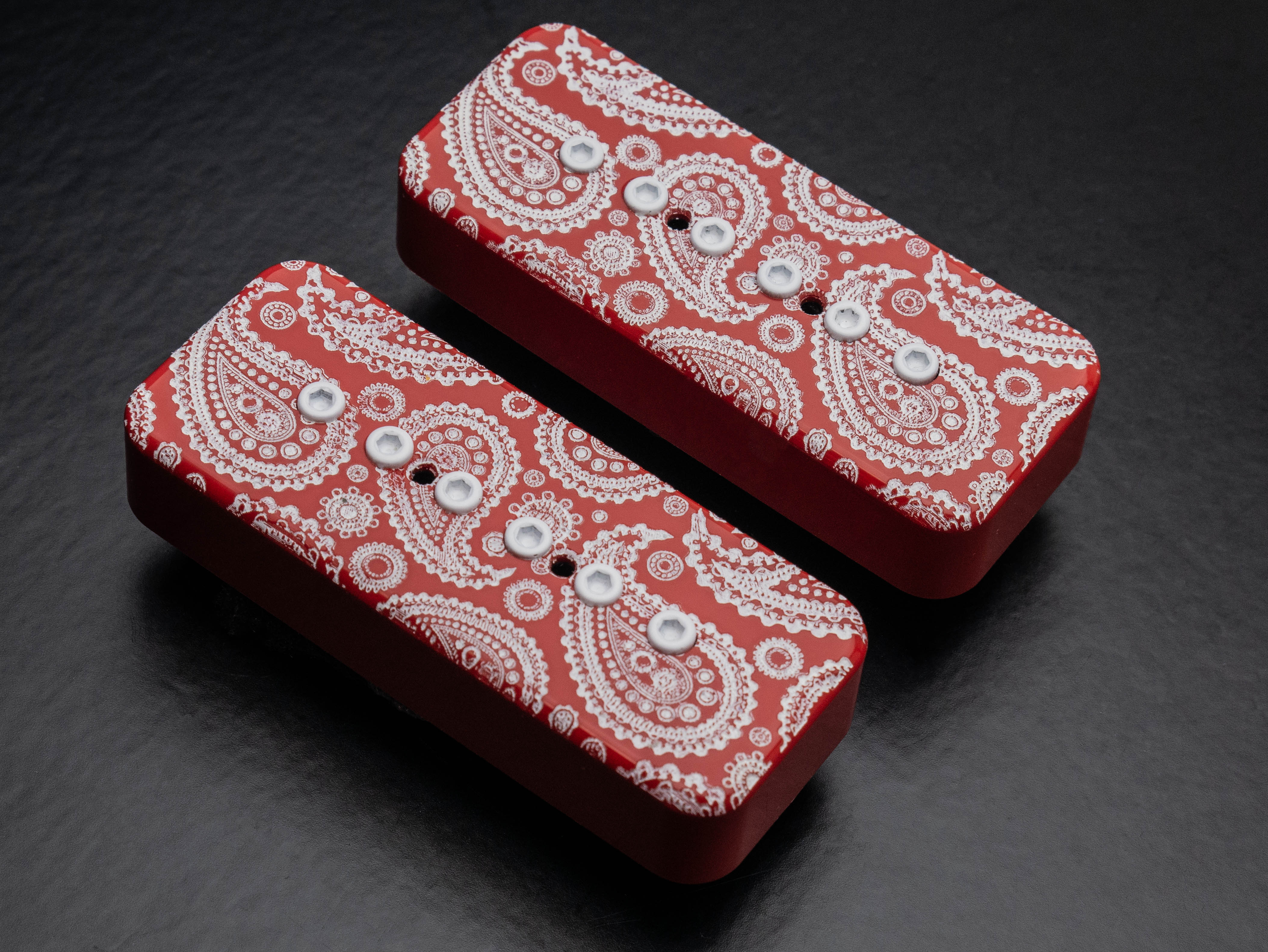 Special Edition Supermassive soapbar P90 calibrated bridge and neck set with custom paisley etched red / white covers and white bolts