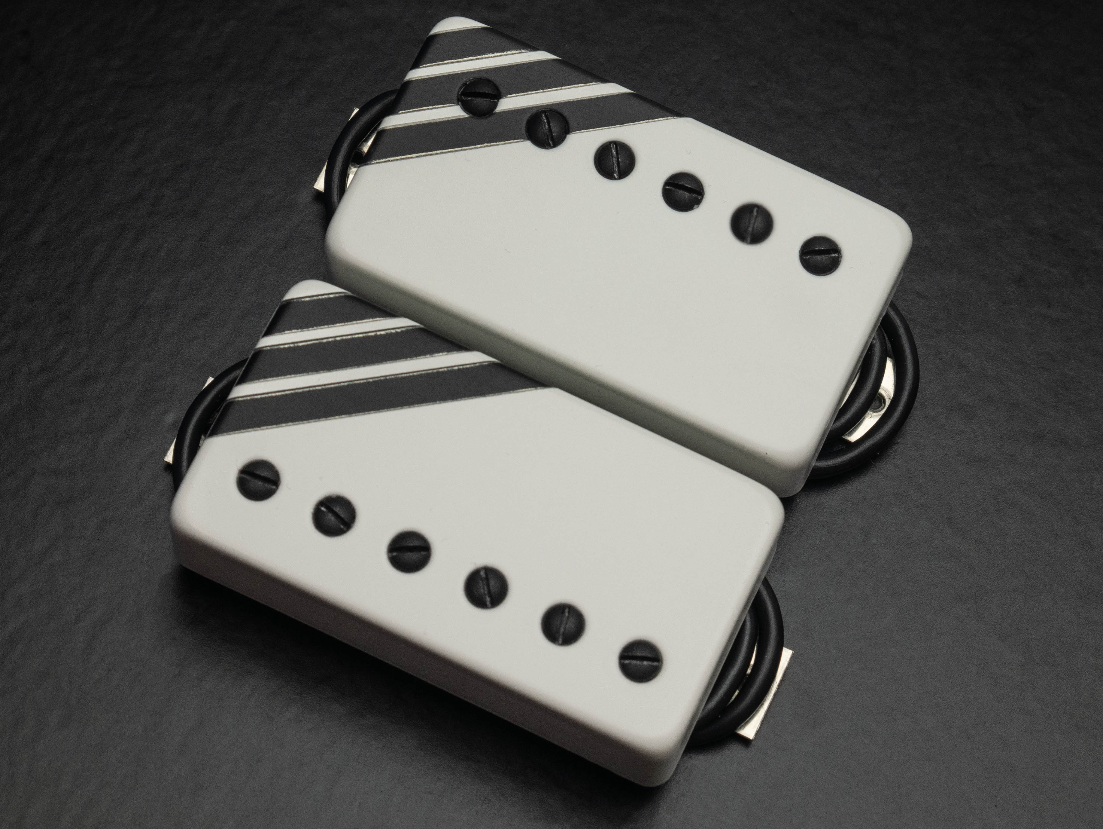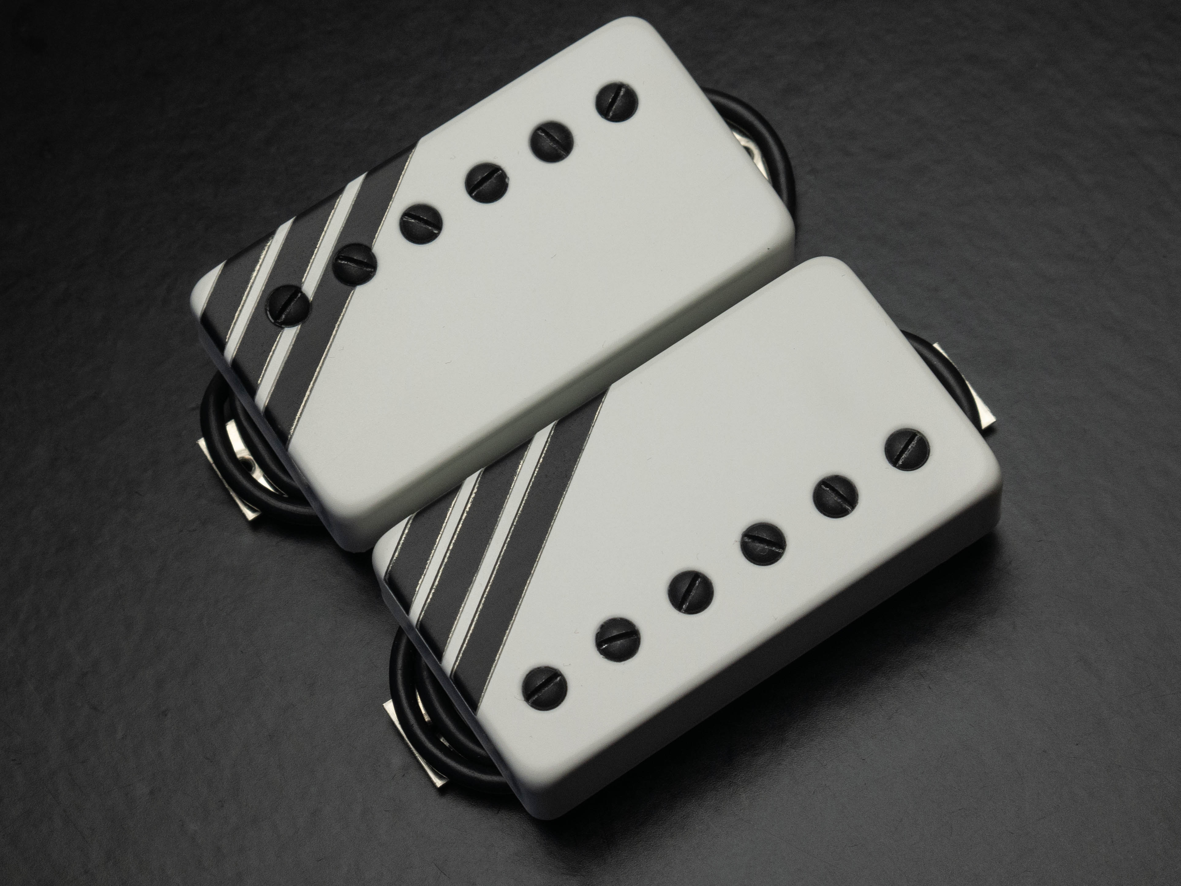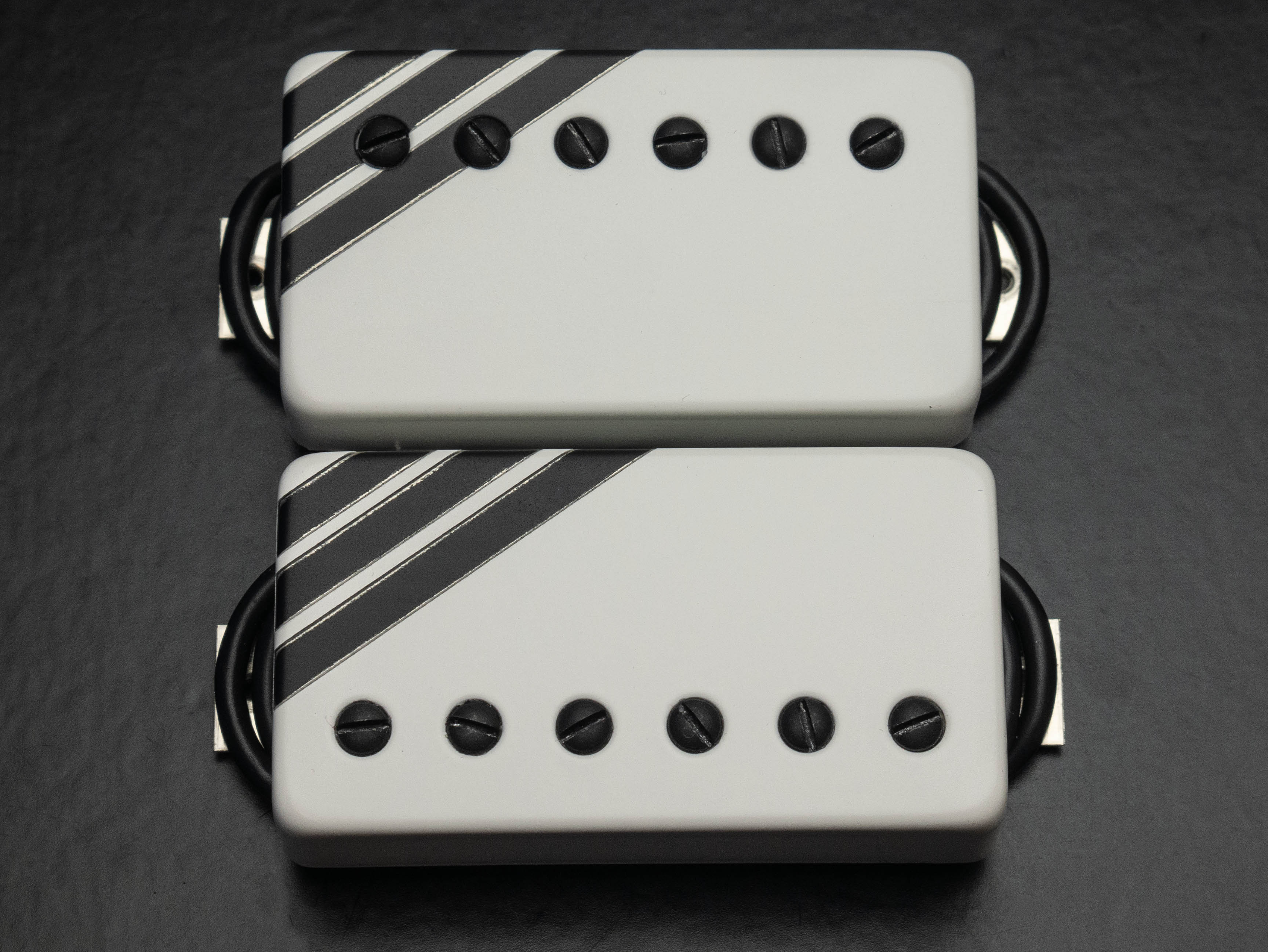 Custom 53mm VHII humbucker set with custom white / black racing stripes design and black pole screws