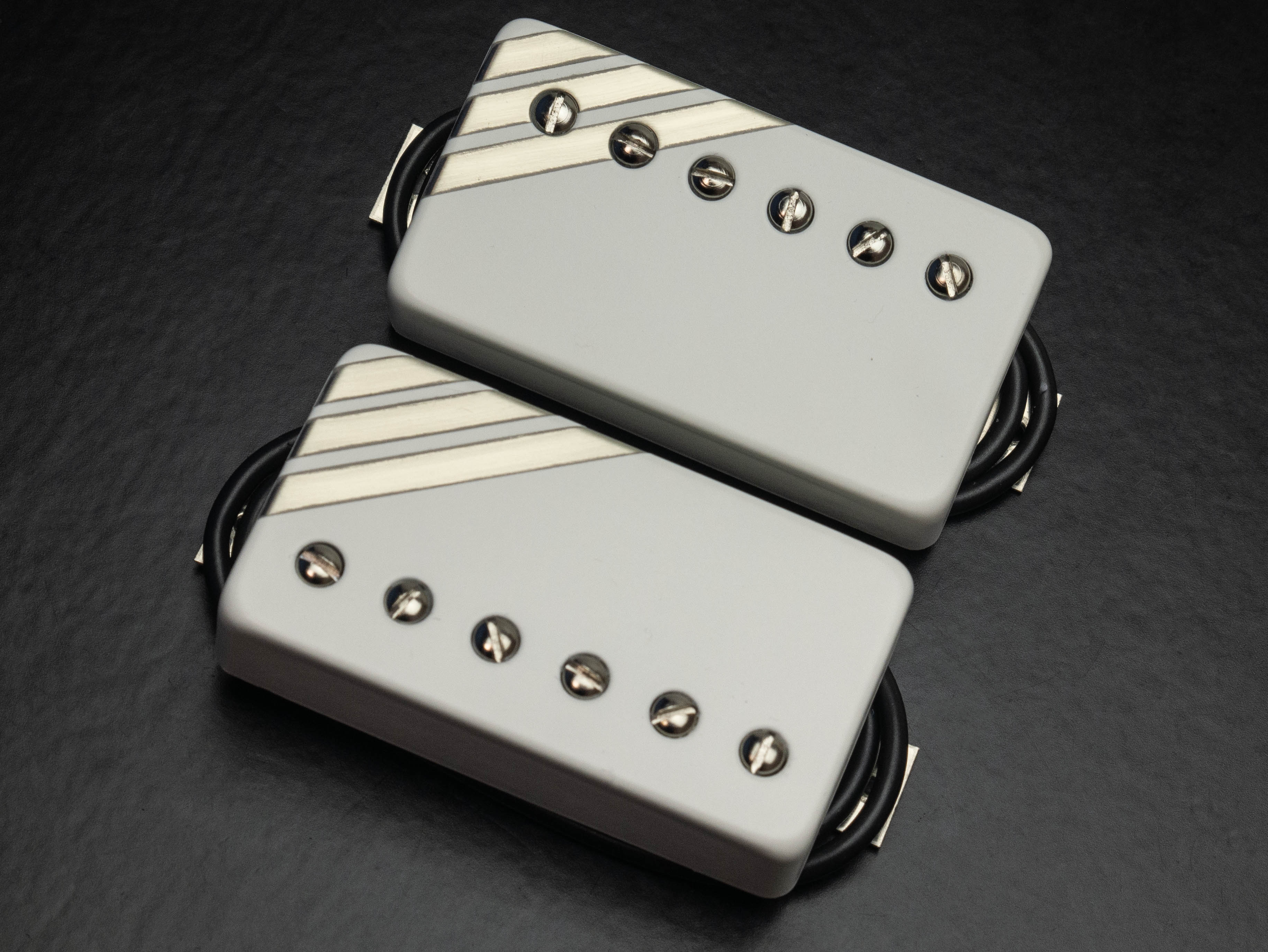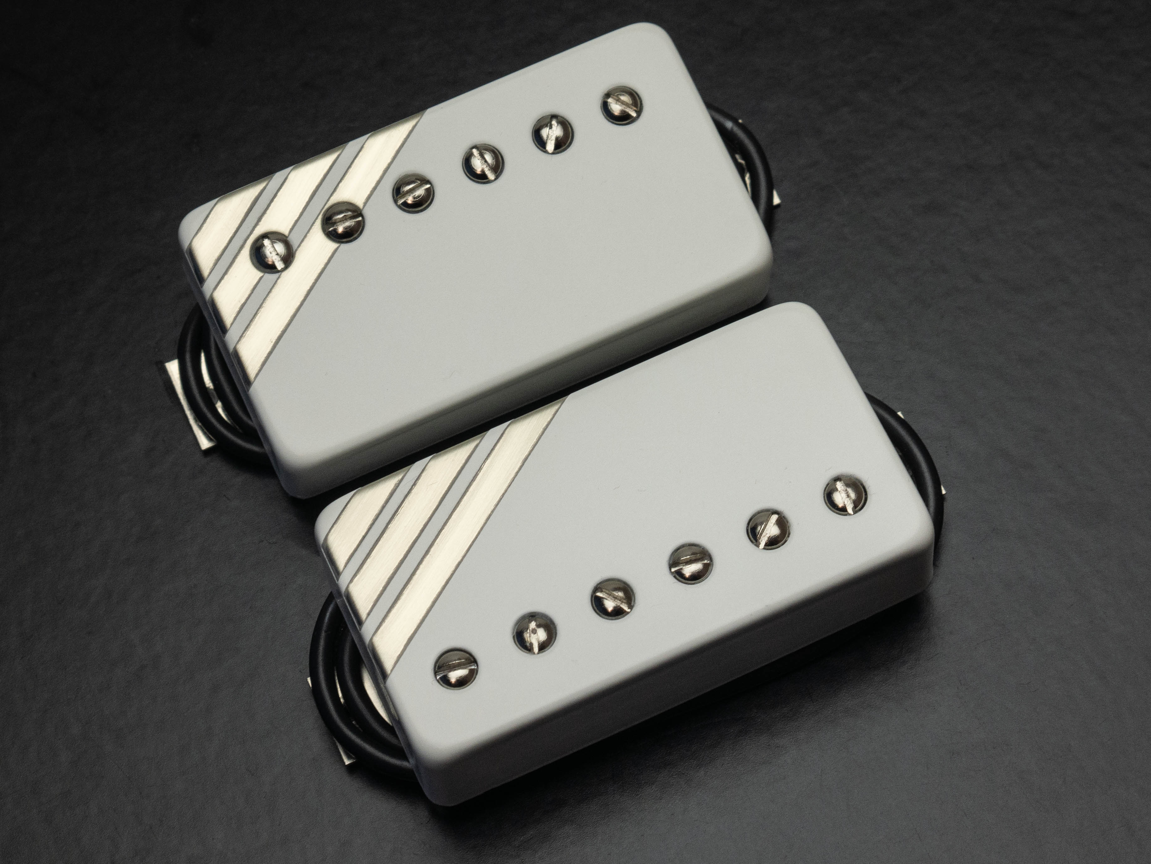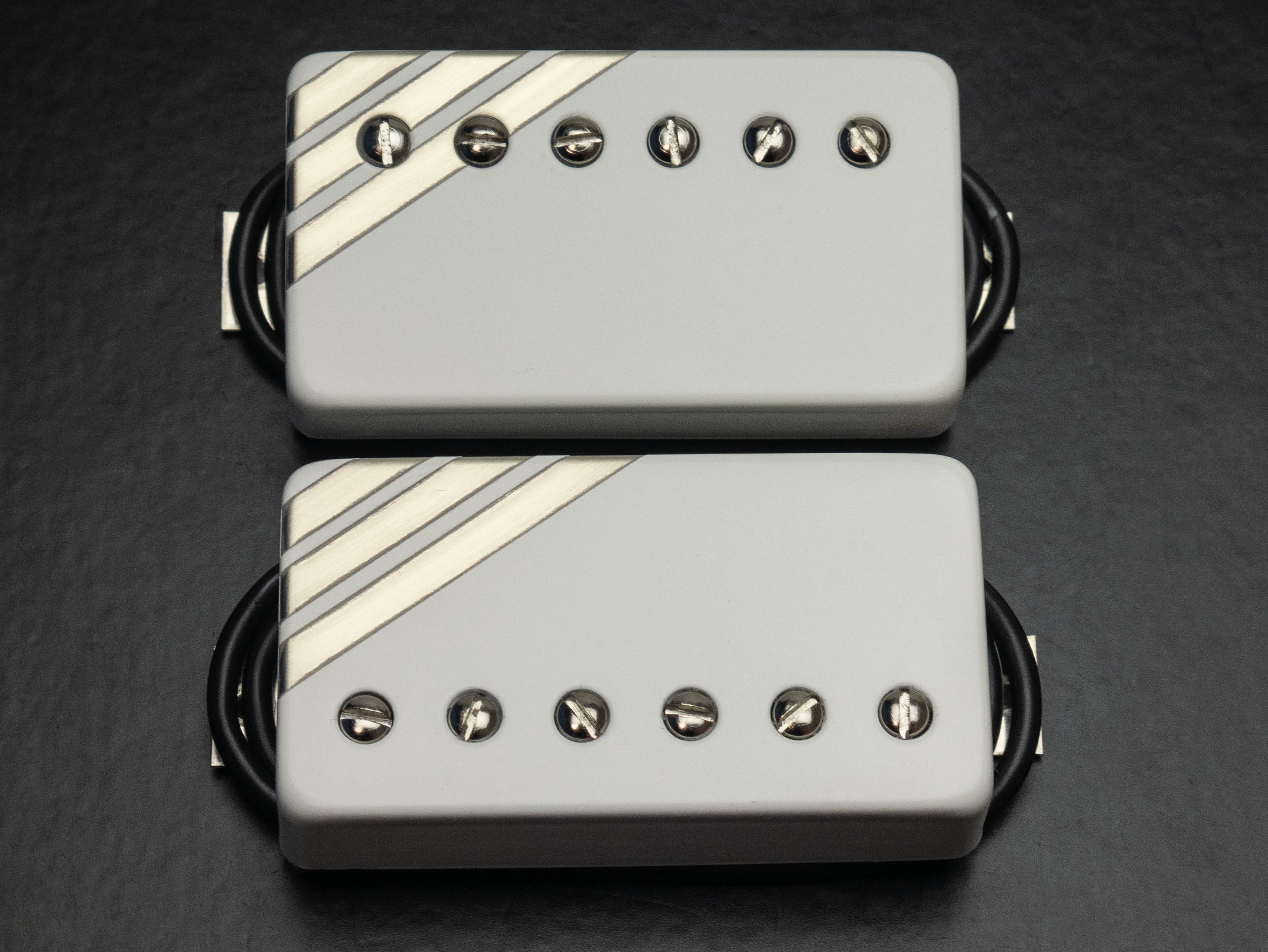 Custom 53mm VHII humbucker set with custom white / nickel racing stripes design and nickel pole screws