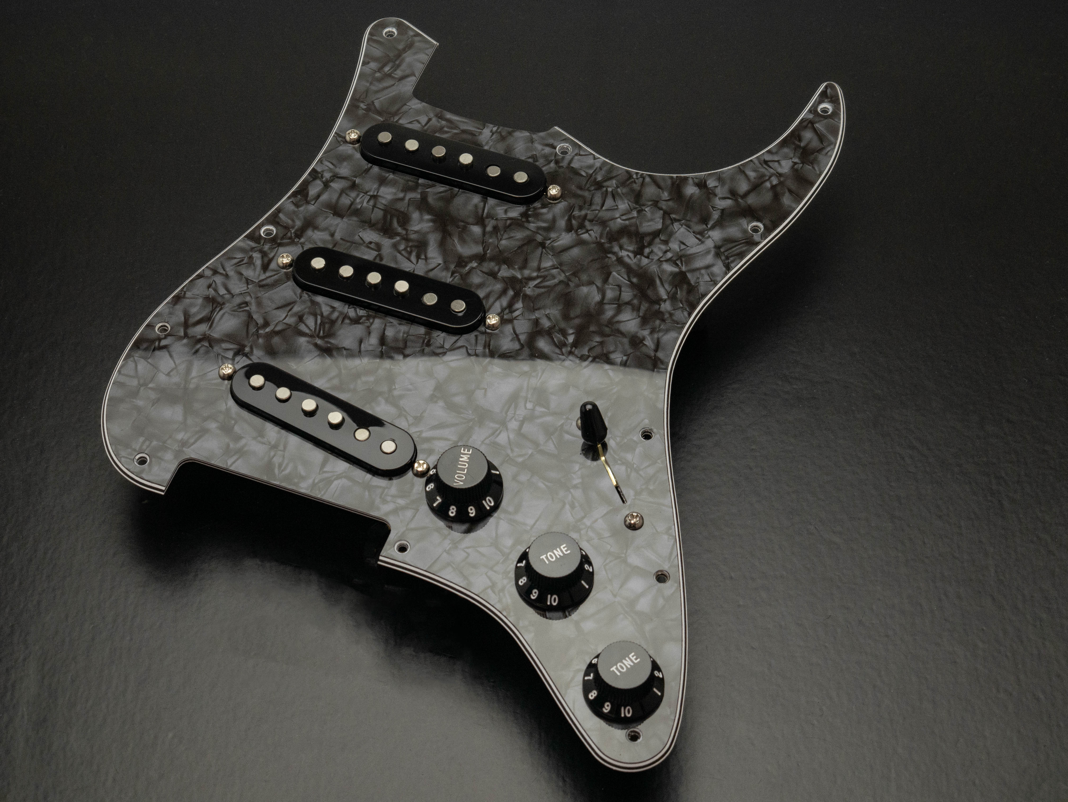 Custom pre-wired 11 hole Strat pickguard in black pearloid, fitted with a calibrated set of Trilogy Singlecoil pickups in a black finish with a zinc plated steel baseplate on the bridge pickup, RWRP middle coil and vintage stagger magnet profile.