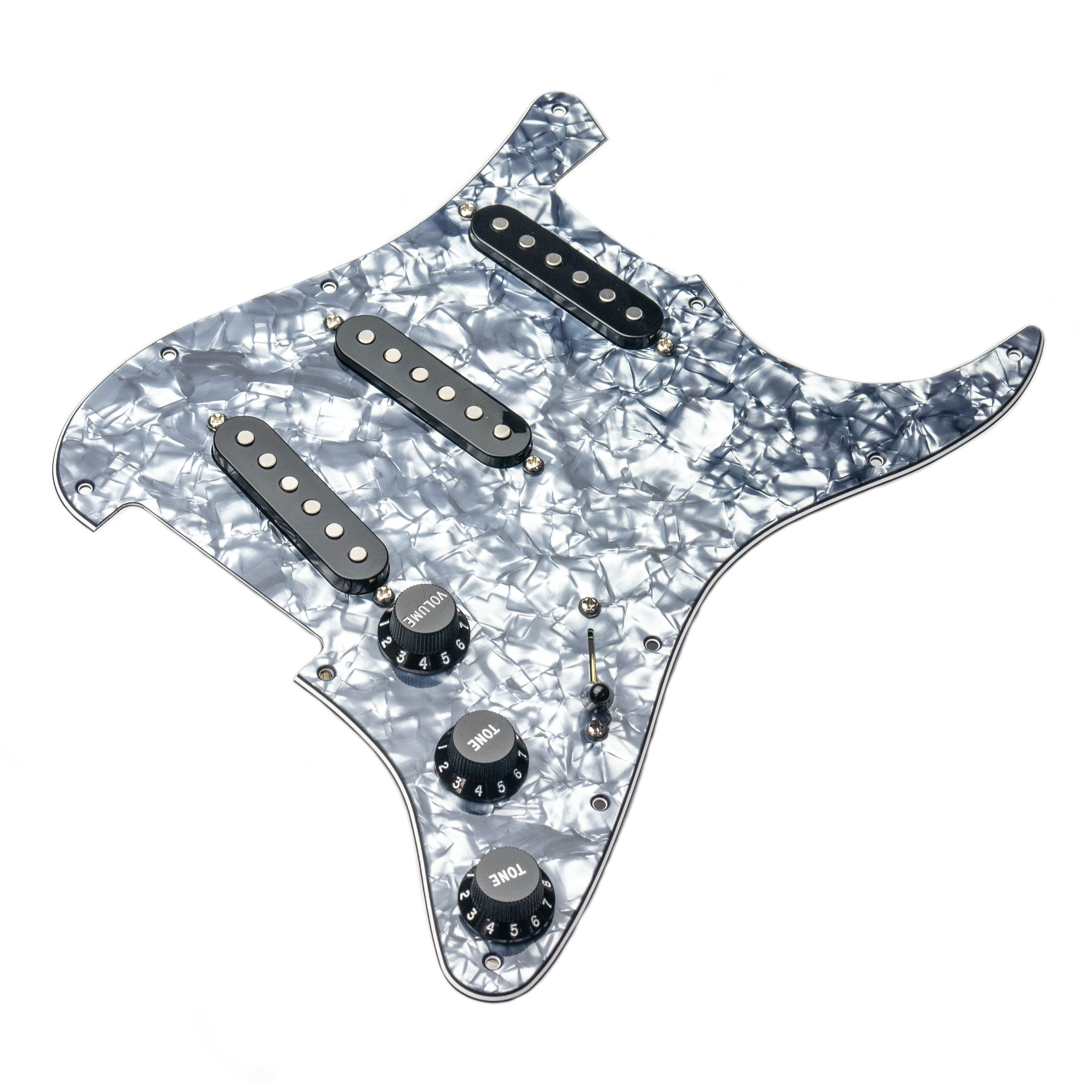 Custom pre-wired 11 hole Strat pickguard in black pearloid, fitted with a calibrated set of Trilogy Suite Singlecoil pickups in a black finish with flat profile magnets and a zinc plated steel baseplate on the bridge pickup.
