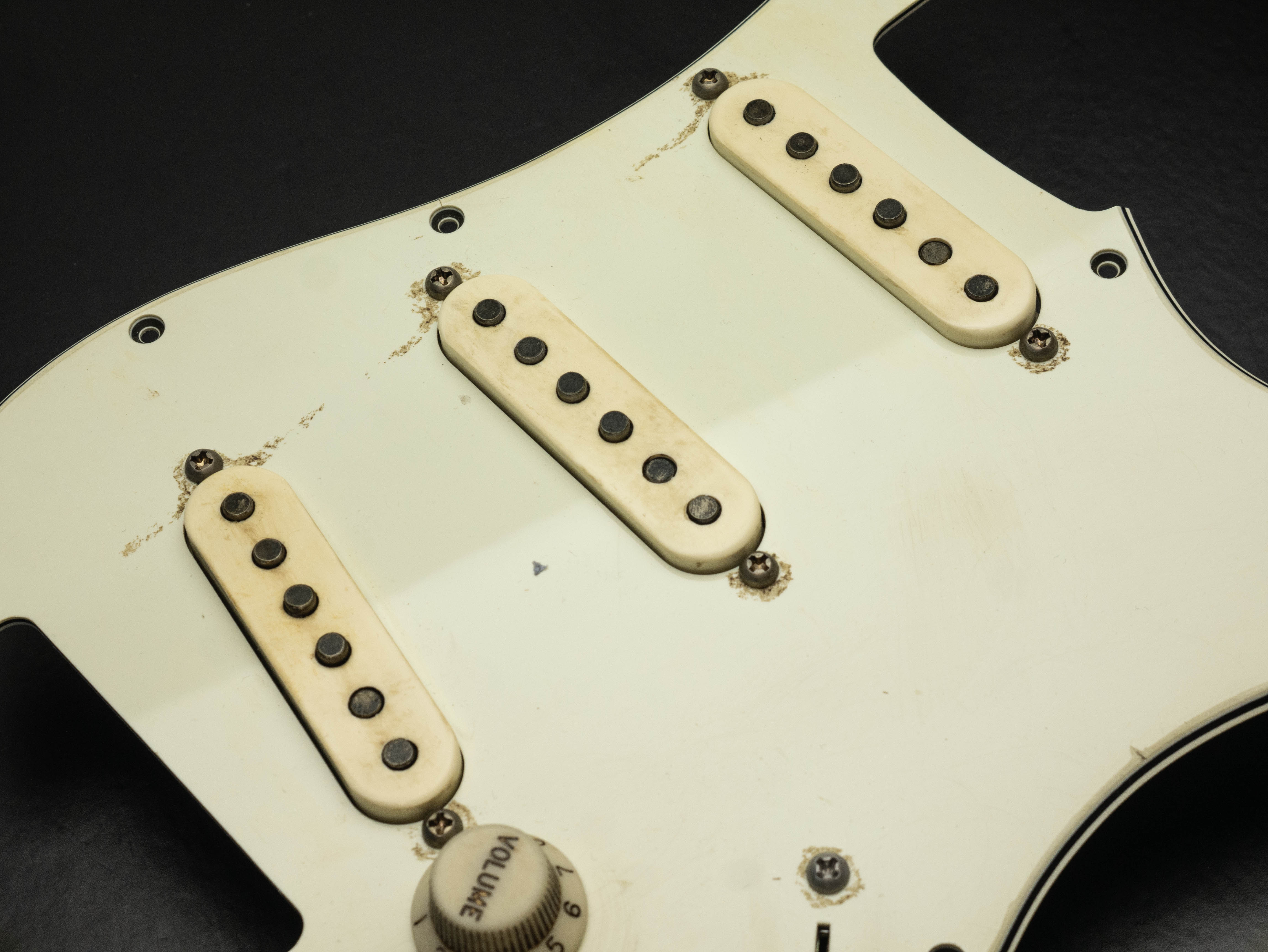 Custom pre-wired 11 hole Strat pickguard in aged mint, fitted with a calibrated set of Rabea Massaad Triptych Singlecoil pickups in a aged cream finish featuring signaure Triptych etching and a zinc plated steel baseplate on the bridge and neck pickups, RWRP middle coil and vintage stagger magnet profile.