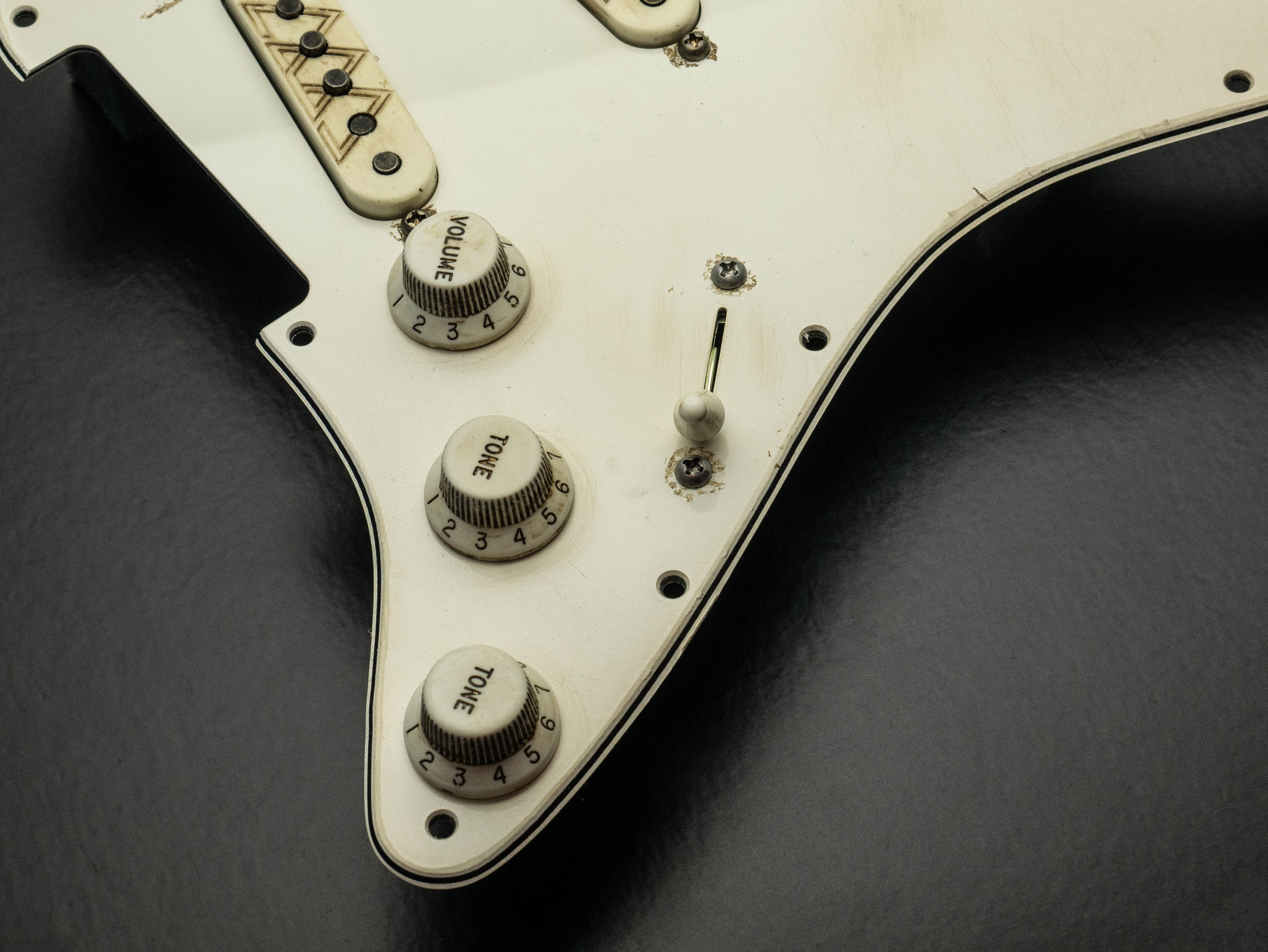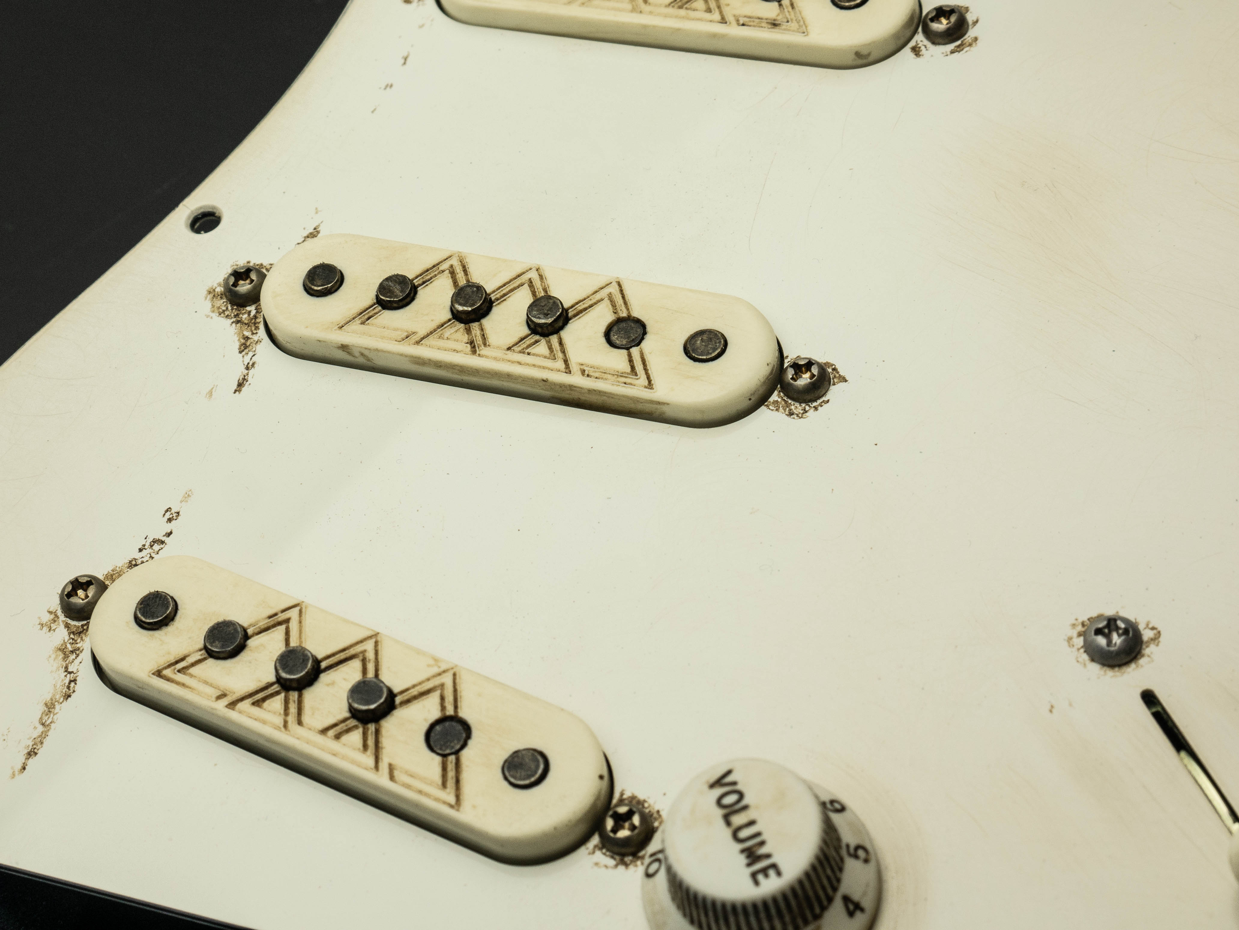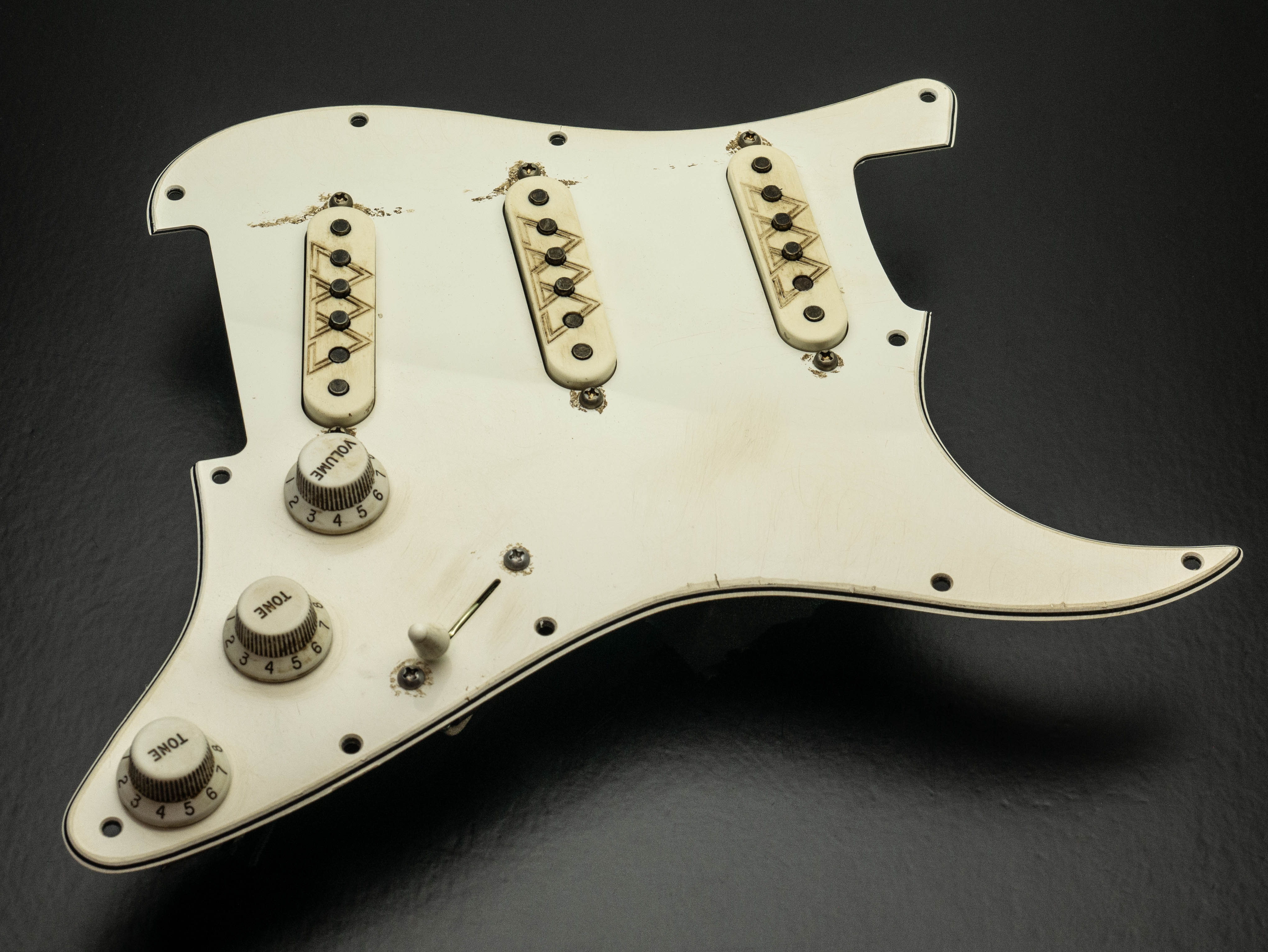 Custom pre-wired 11 hole Strat pickguard in aged parchment, fitted with a calibrated set of Rabea Massaad Triptych Singlecoil pickups in a aged parchment finish featuring signaure Triptych etching and a zinc plated steel baseplate on the bridge and neck pickups, RWRP middle coil and vintage stagger magnet profile.