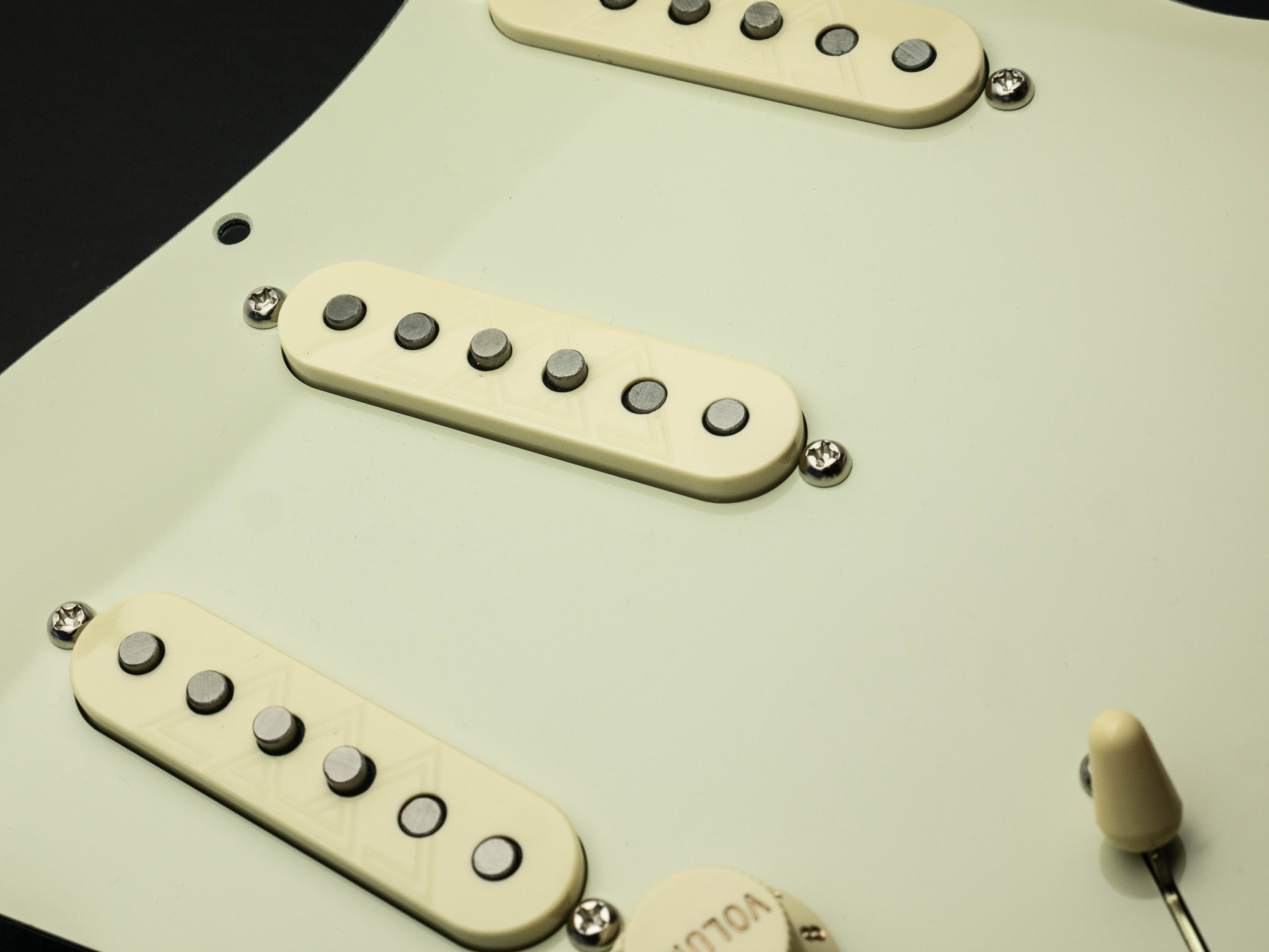 Custom pre-wired 11 hole Strat pickguard in black, fitted with a calibrated set of Rabea Massaad Triptych Singlecoil pickups in a custom etched black finish with a zinc plated steel baseplate on the bridge and neck pickups, RWRP middle coil and vintage stagger magnet profile.