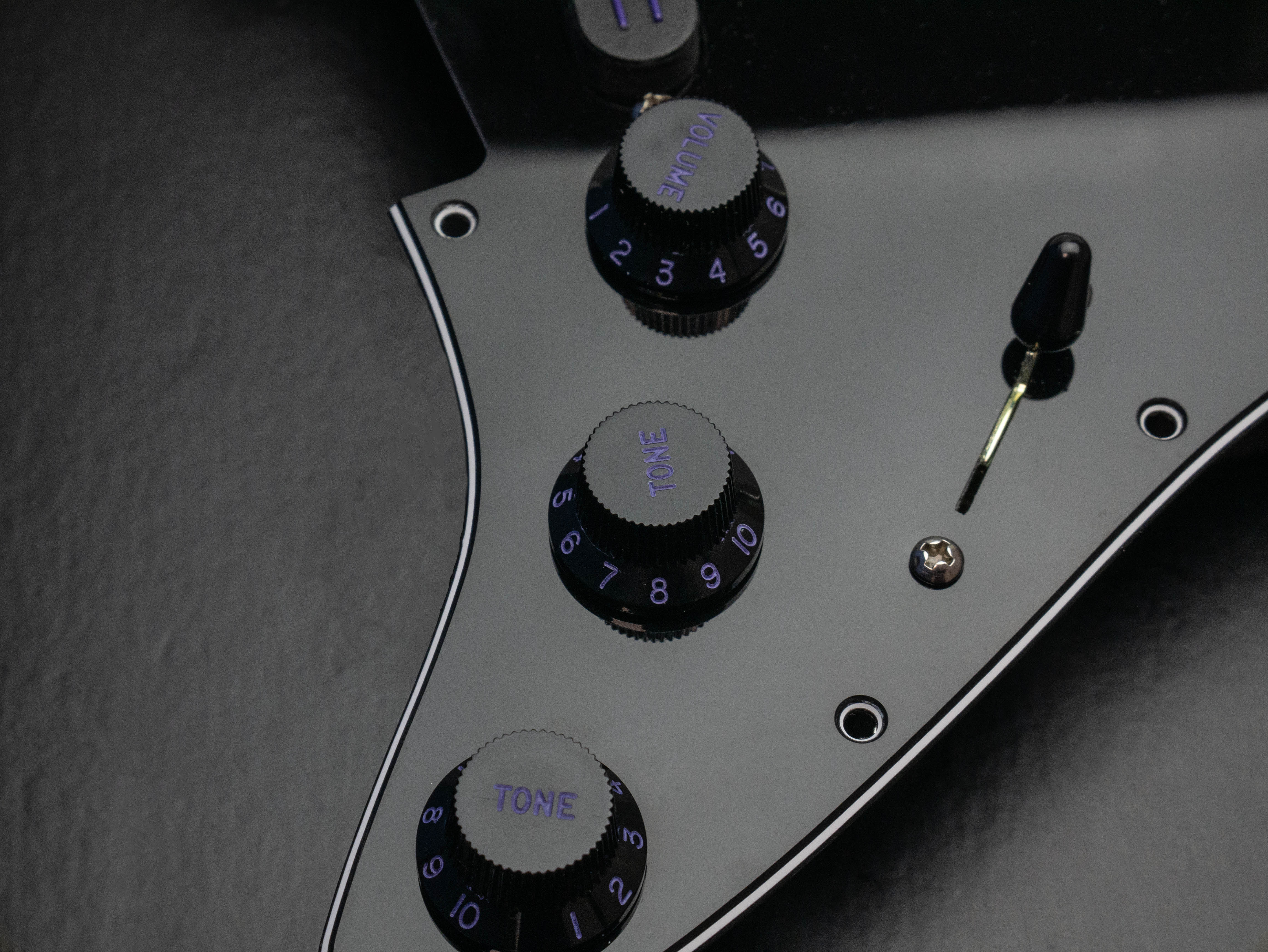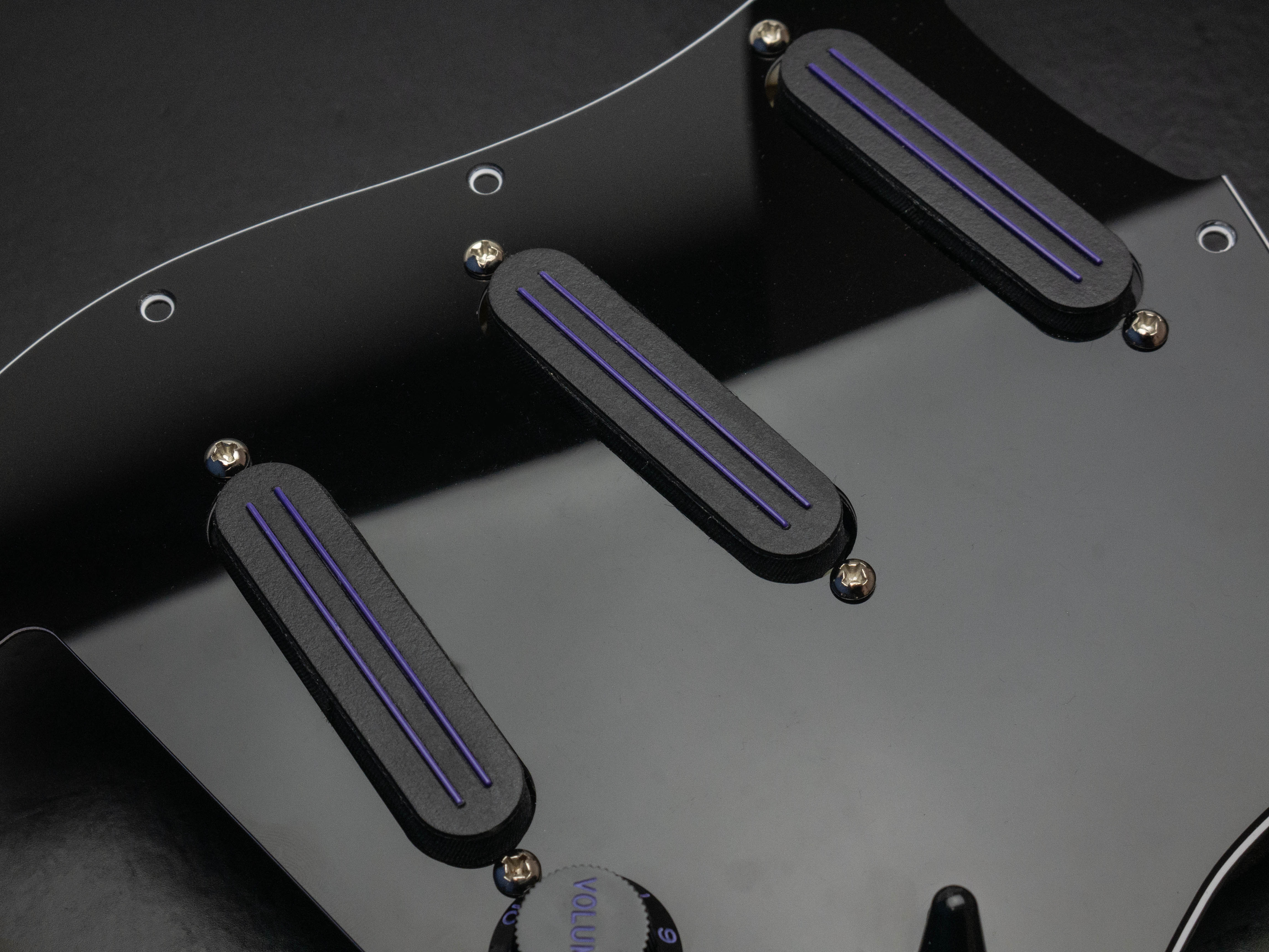 Custom pre-wired Strat pickguard in black, fitted with a calibrated set of Cobra Singlecoil pickups in black with purple blades