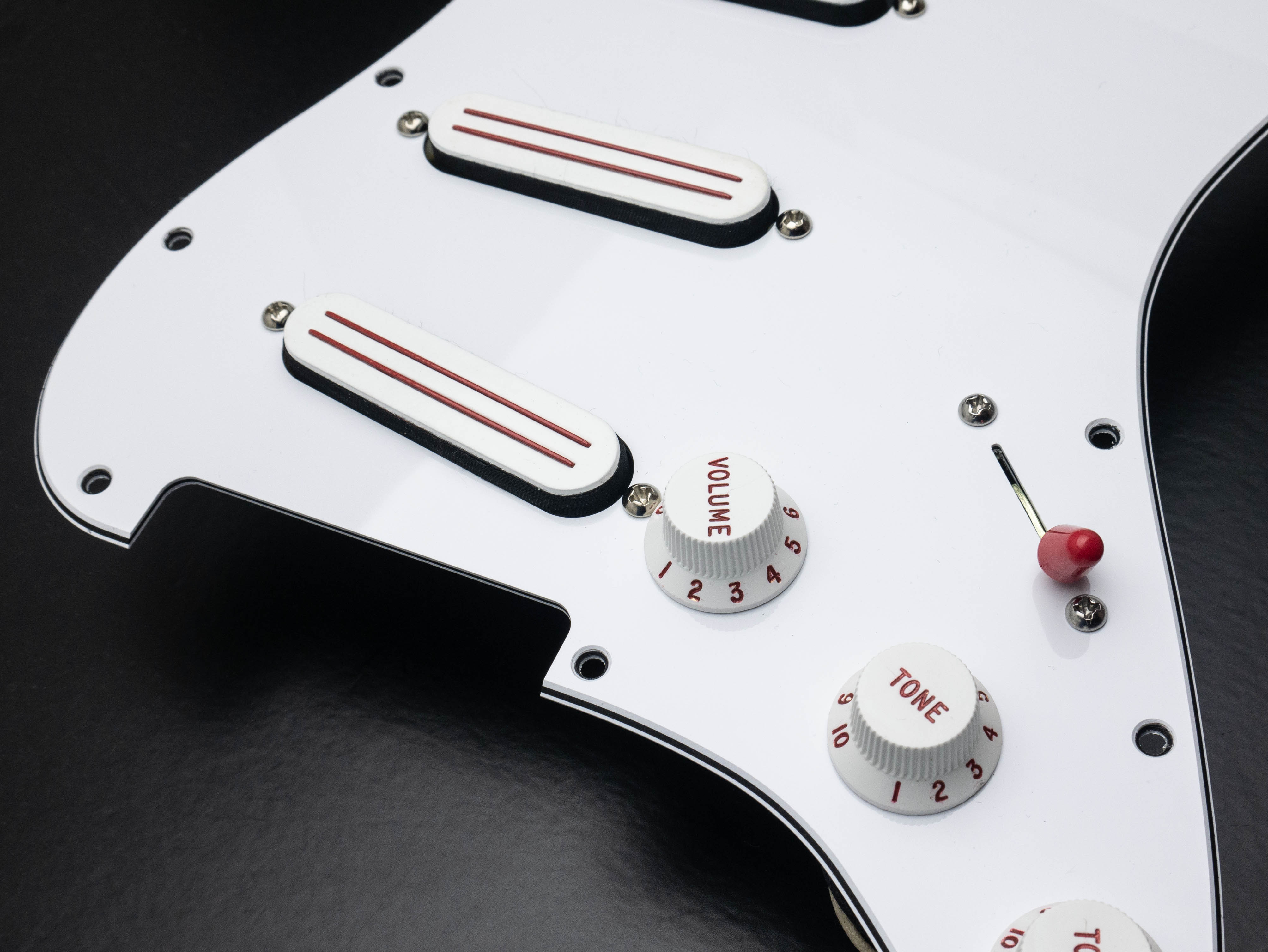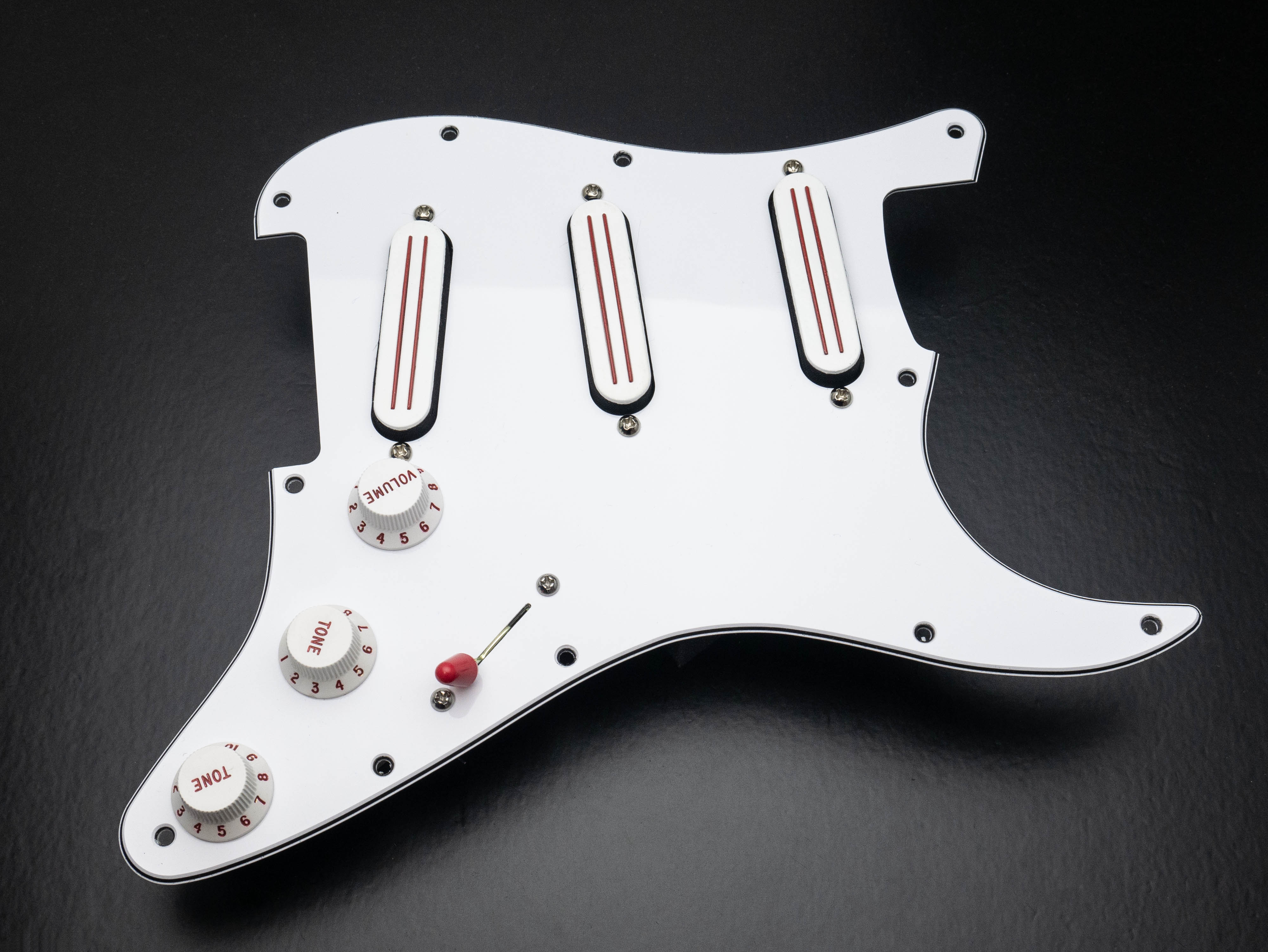 Custom pre-wired Strat pickguard in white, fitted with a calibrated set of Cobra Singlecoil pickups in a custom white finish with red blades
