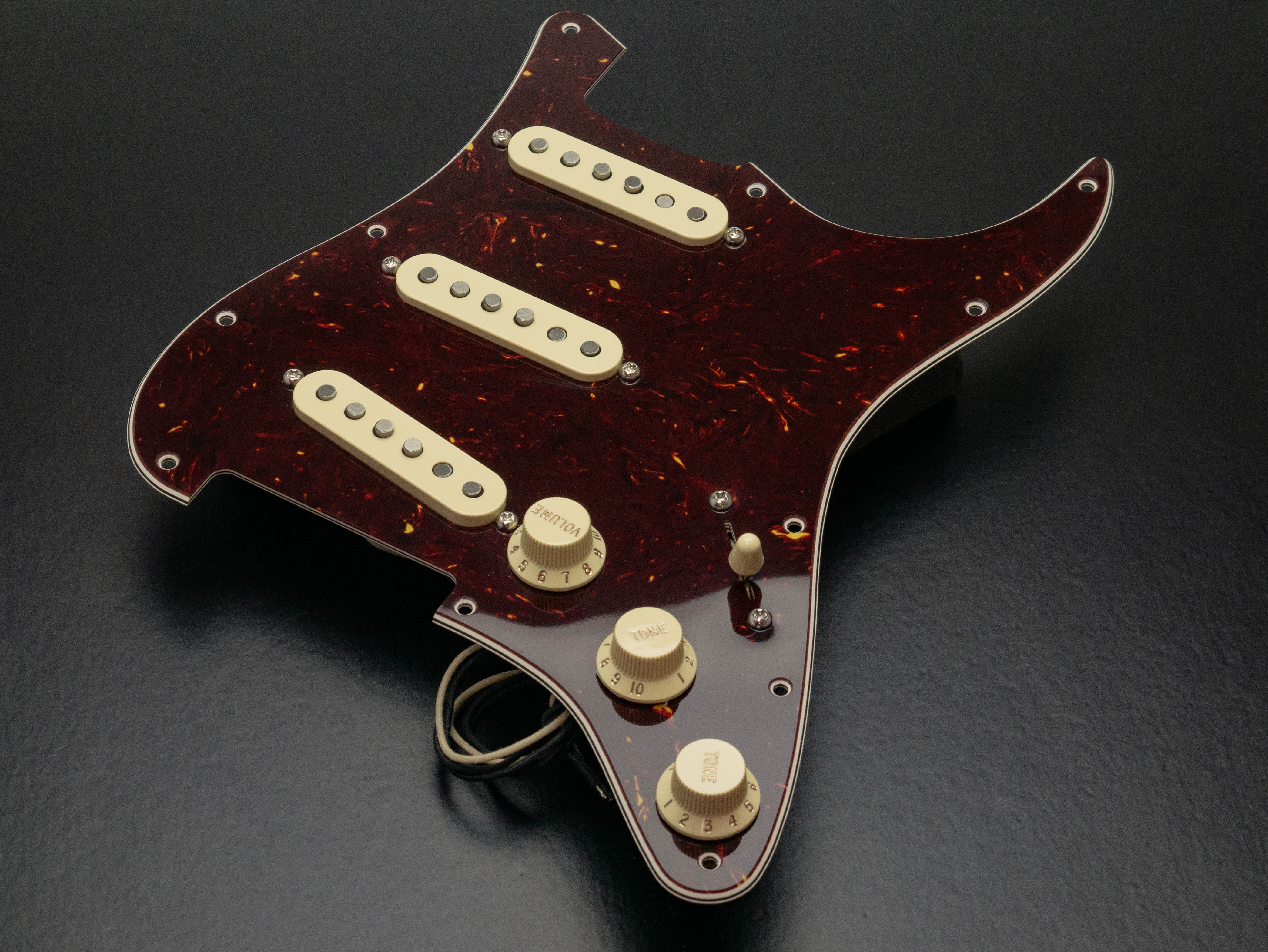 Custom pre-wired 11 hole Strat pickguard in tortoiseshell, fitted with a calibrated set of Irish Tour Singlecoil pickups in a cream finish with a zinc plated steel baseplate on the bridge pickup, RWRP middle coil and vintage stagger magnet profile.