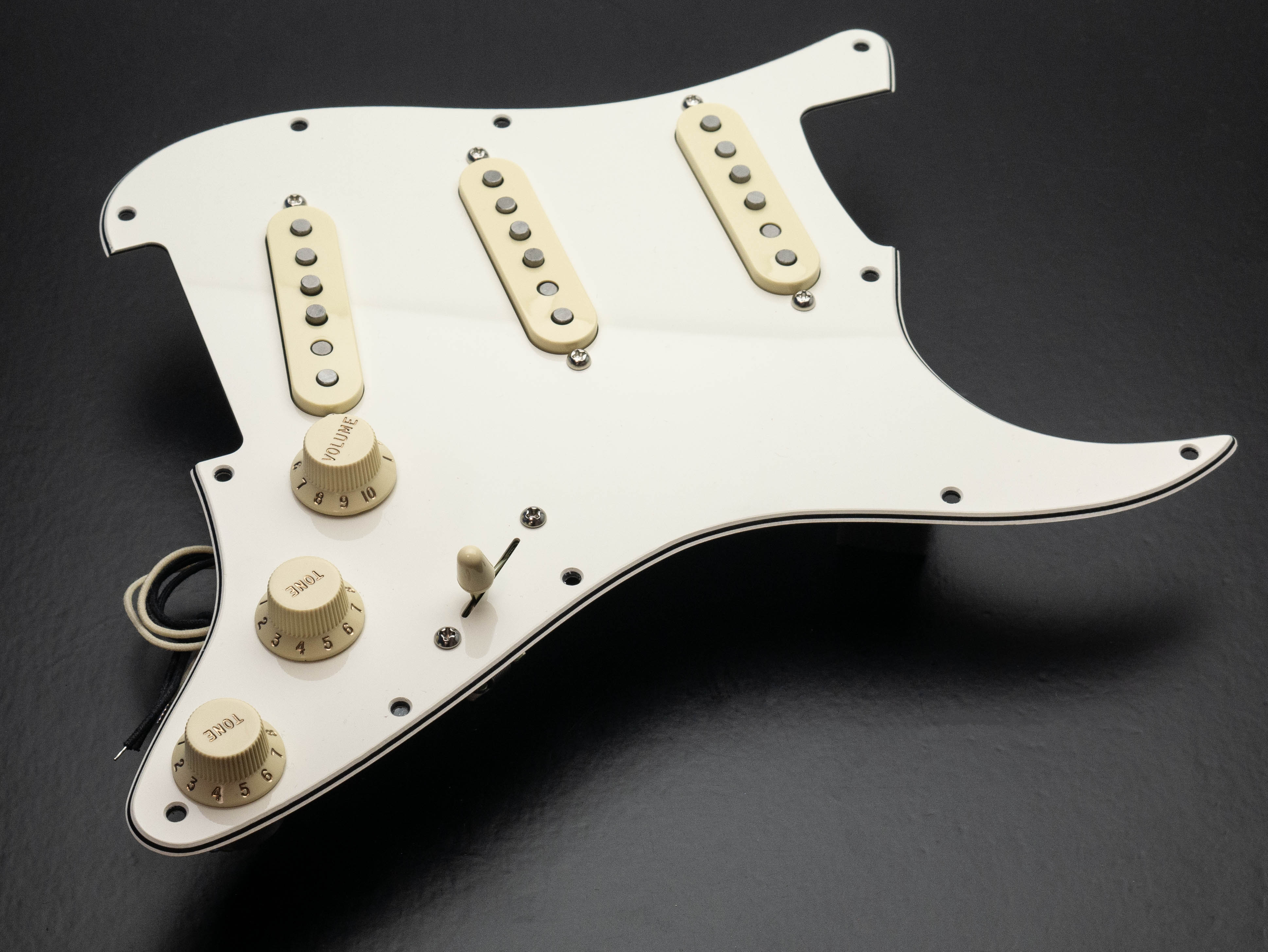 Custom pre-wired 11 hole Strat pickguard in parchment with cream parts kit, fitted with a calibrated set of Mother's Milk Singlecoil pickups with cream covers.