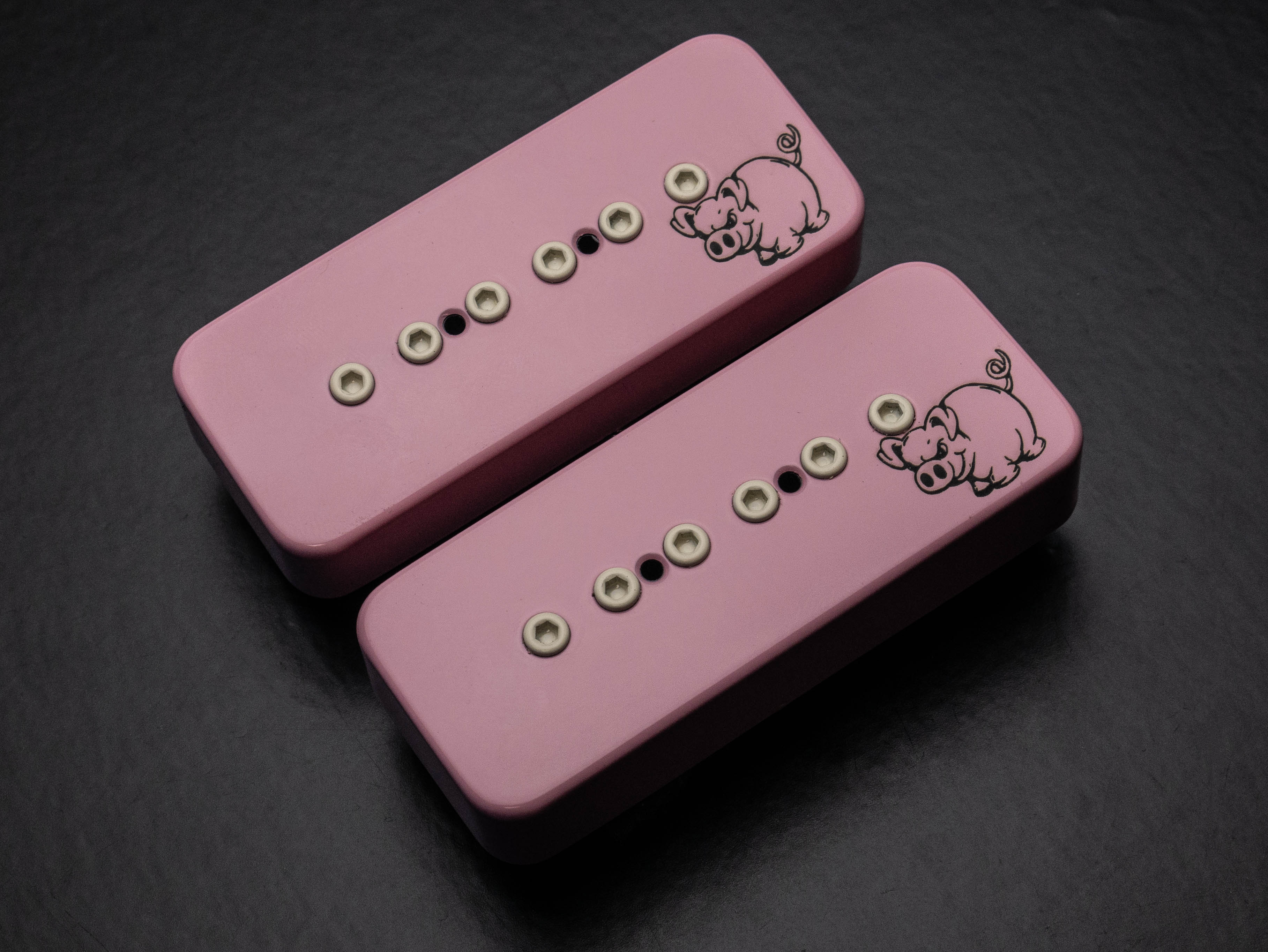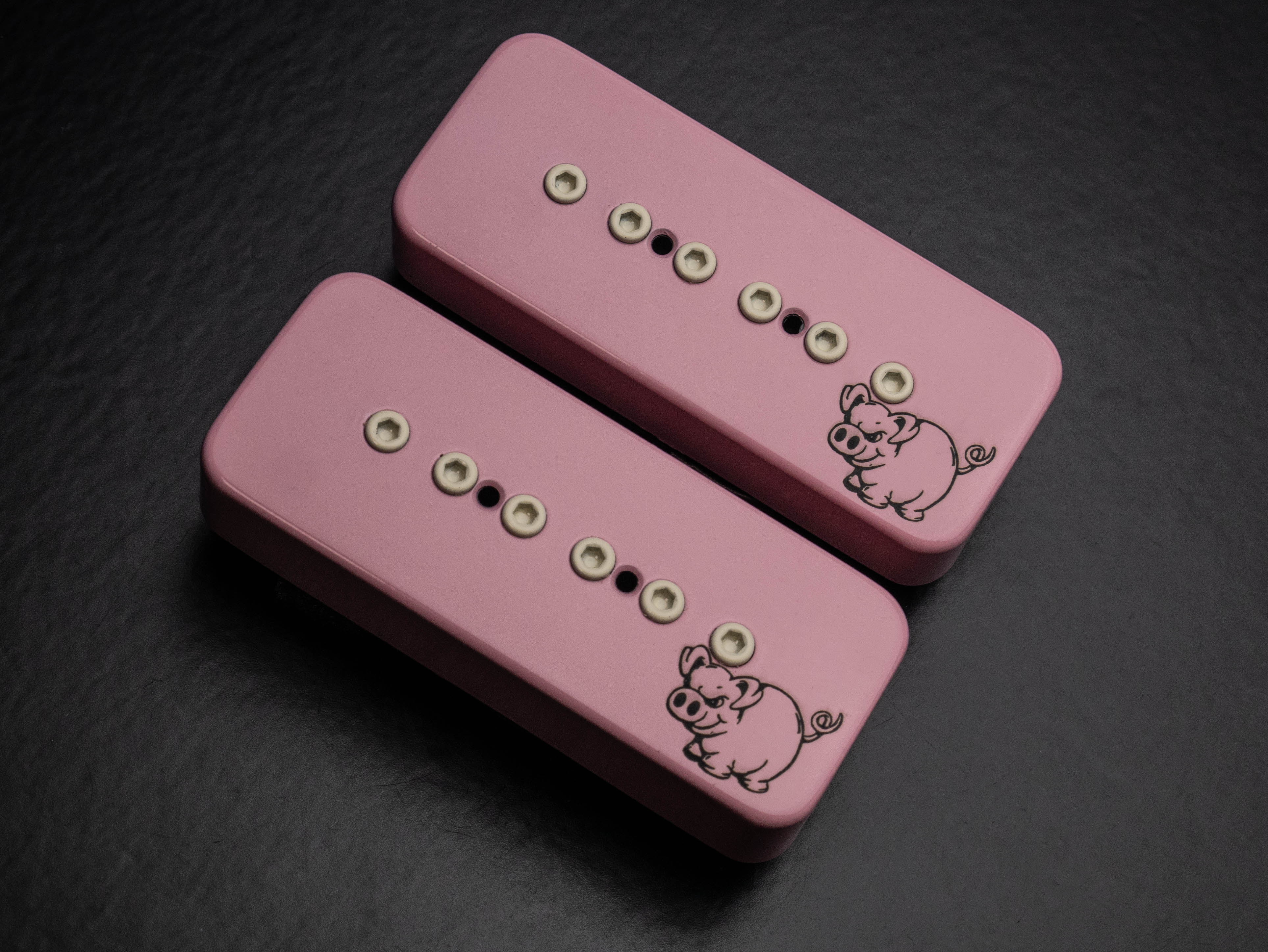Custom set of 'Pig 90 P90 singlecoils with pink powder-coated nickel silver covers, cream powder-coated hex bolts and pig etch design.
