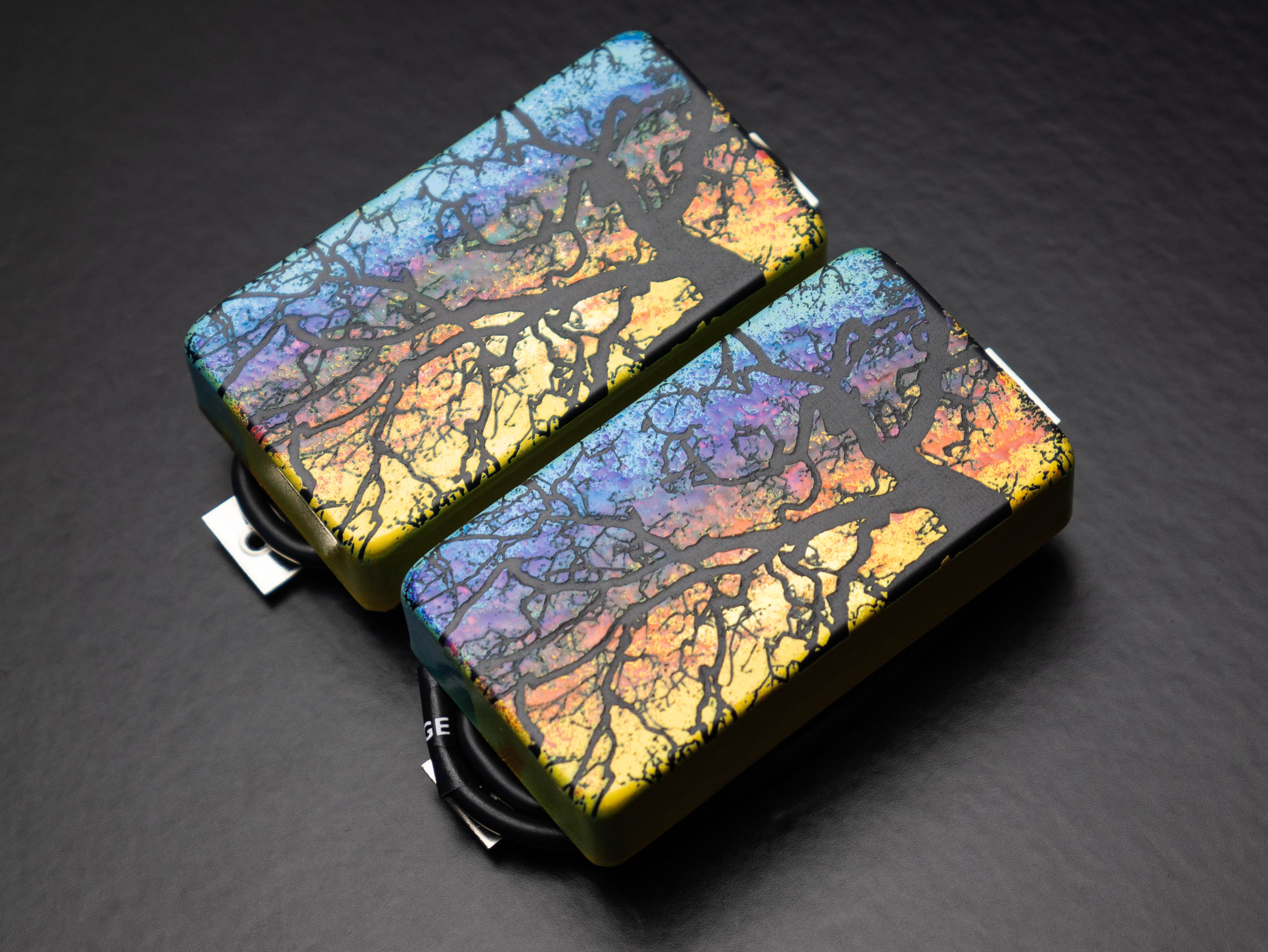 Abraxas humbucker set with no-holes covers, custom painted and etched with a multicolour sunset finish.