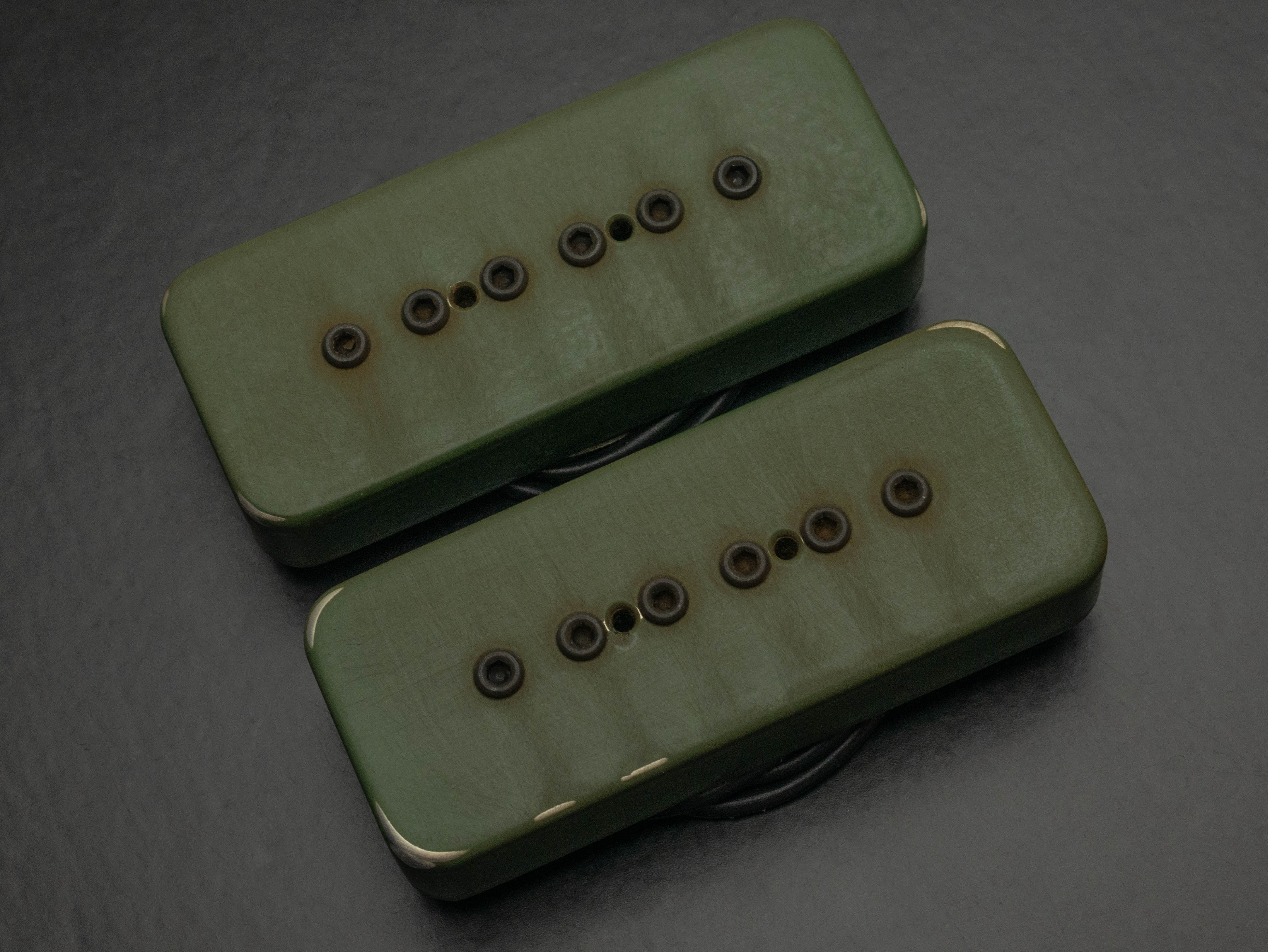 Custom set of 'Pig 90 P90 singlecoils with aged Military Green powder-coated nickel silver covers and black hex bolts.
