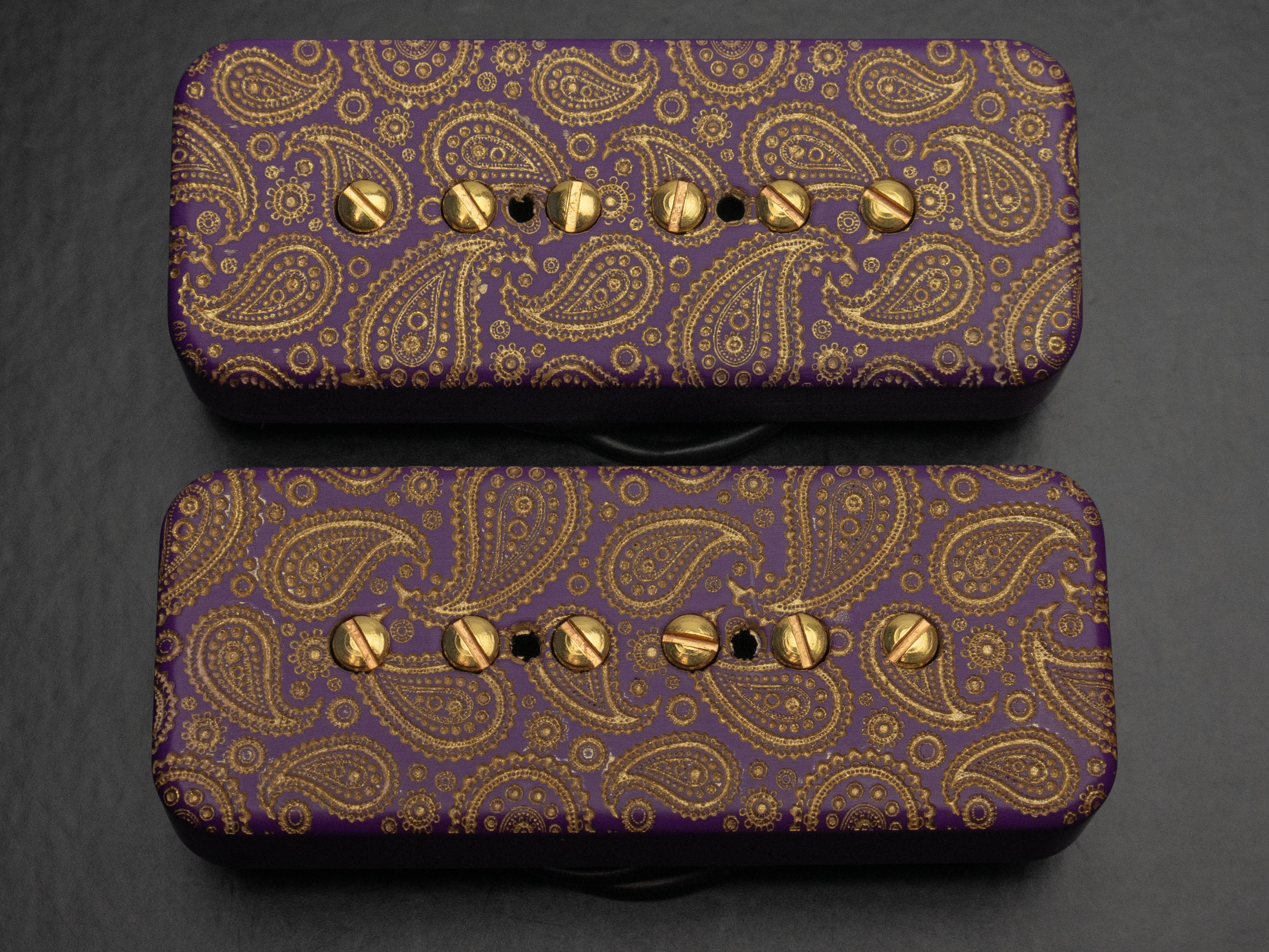 Special Edition Supermassive soapbar P90 calibrated bridge and neck set with custom Paisley etch purple / gold covers and gold screws