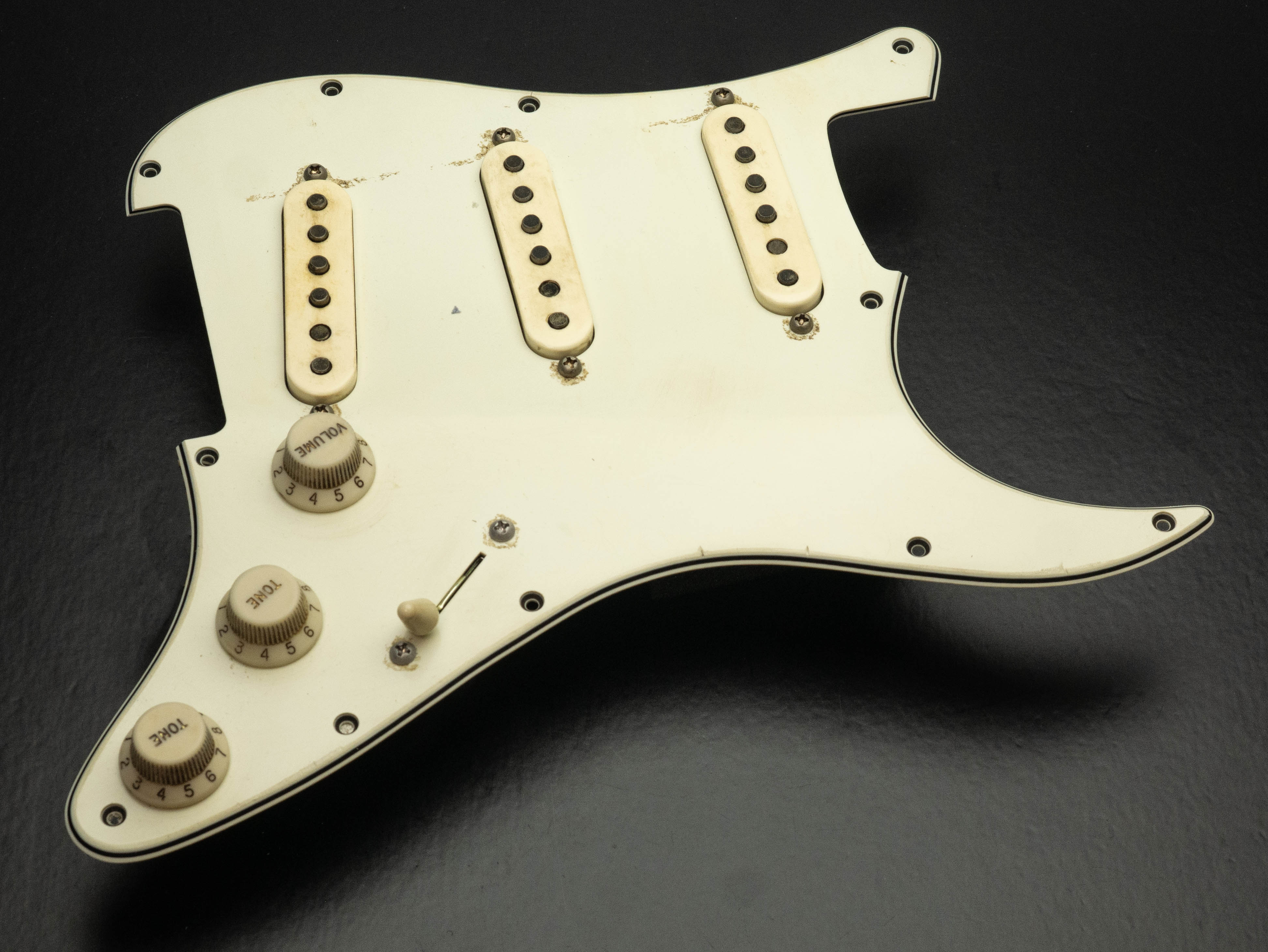 Custom pre-wired 11 hole Strat pickguard in aged mint, fitted with a calibrated set of Rabea Massaad Triptych Singlecoil pickups in a aged cream finish featuring signaure Triptych etching and a zinc plated steel baseplate on the bridge and neck pickups, RWRP middle coil and vintage stagger magnet profile.